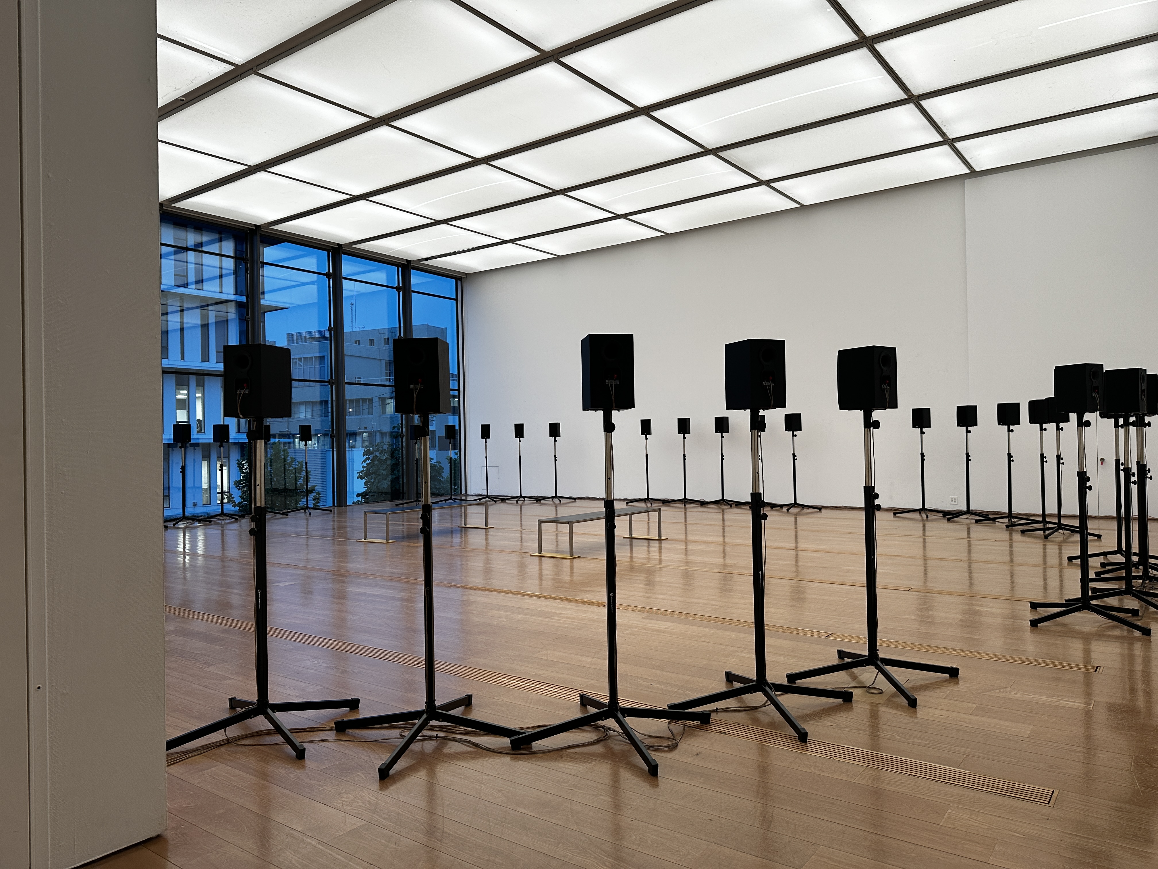 円形に置かれた40台のスピーカーから、合唱団の歌声が別々に聞こえてきます。展示の中心では、ソプラノ、アルトなど合唱のハーモニーを十分に楽しむことができるし、スピーカーの周りをぐるぐると歩けば、様々な音階の歌声をじっくり発見することもできました。美術館で目を閉じて、耳の感覚だけに任せて、その場の空間を楽しめたのがよかったです。