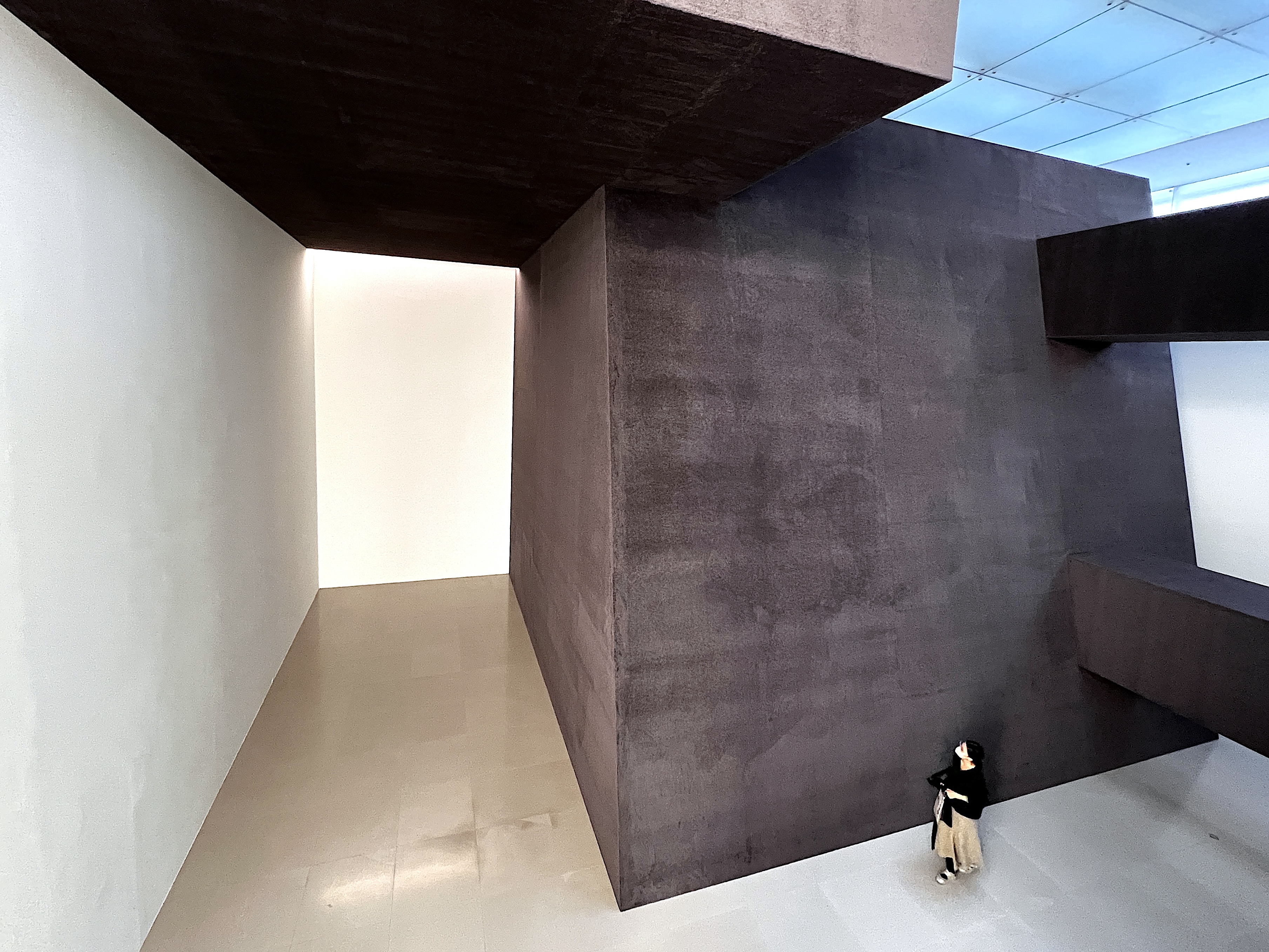 個人的にアート作品による美術館への建築的な介入に関心をもっているが、玉山拓郎の展示は、ど肝を抜かれた。2、3階の5つの展示室を使いながら、これらを横断するたったひとつの黒い連続体しか存在しない。やがて図と地が反転することで、改めて谷口吉生の空間も強く意識することになった。