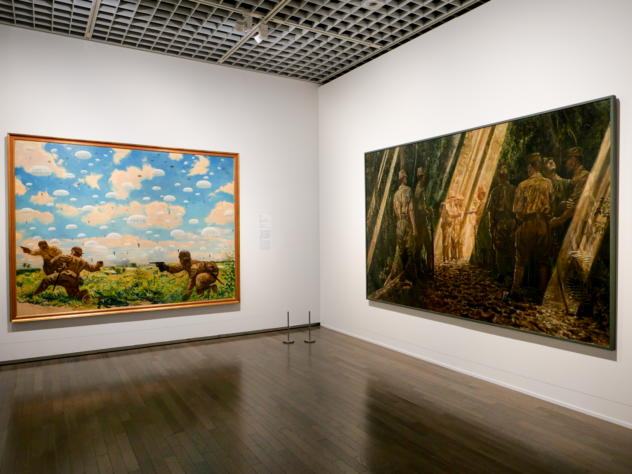 コレクションを中心とした特集 記録をひらく 記憶をつむぐ」(東京国立近代美術館)会場風景より、左から伊原宇三郎《特攻隊内地基地を進発す(一)》(1944)、宮本三郎《萬朶隊比島沖に奮戦す》(1945) 撮影:編集部