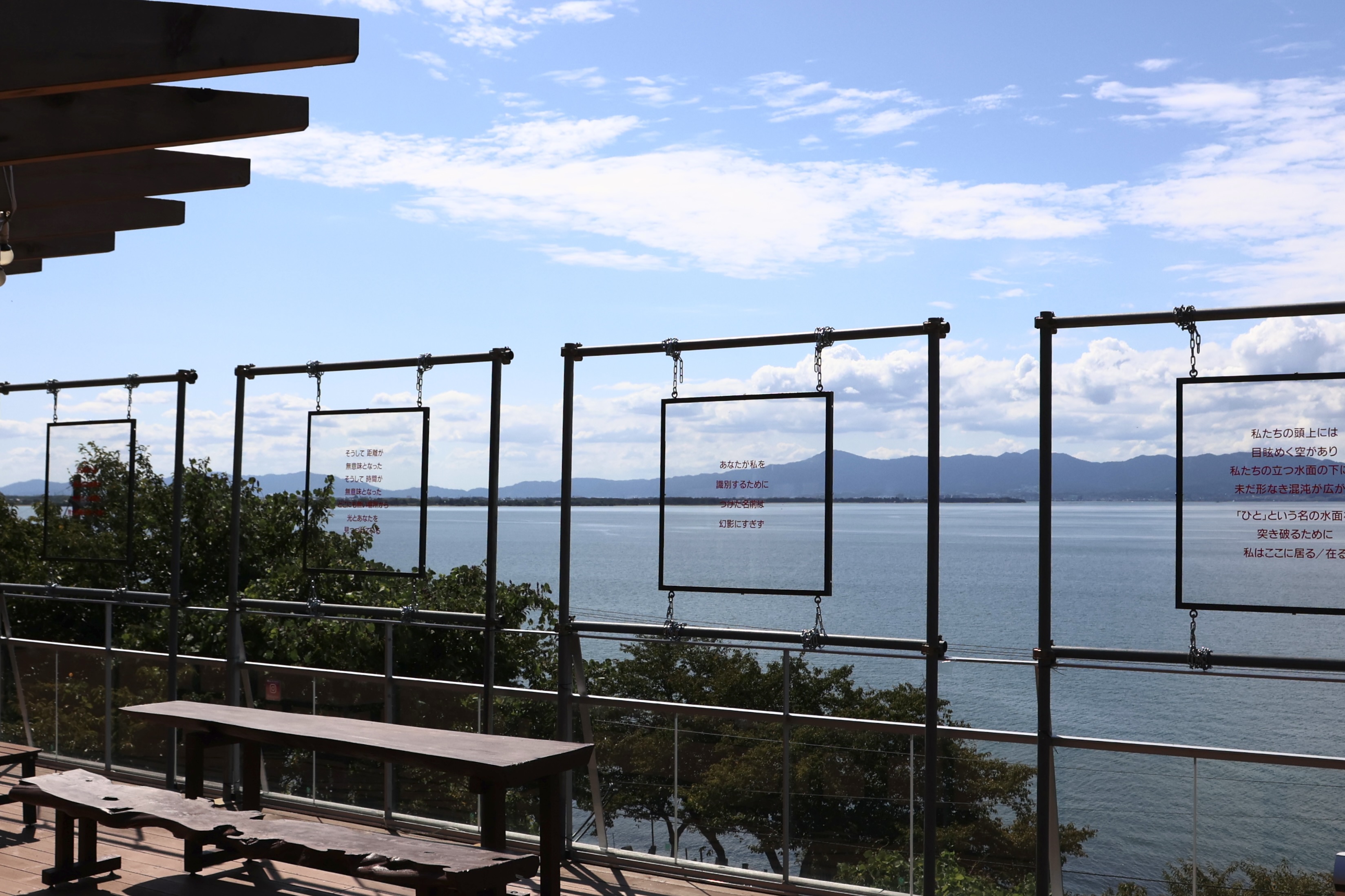 そして石川雷太が、場所と言葉の力を融合させたアートを展示。石川雷太の作品は車で数分の距離にある、369 Terrace Cafe にも展示。眺めのいいカフェで食事やお茶もおすすめだ。琵琶湖の絶景も楽しめる魅力的な会場が加わった。