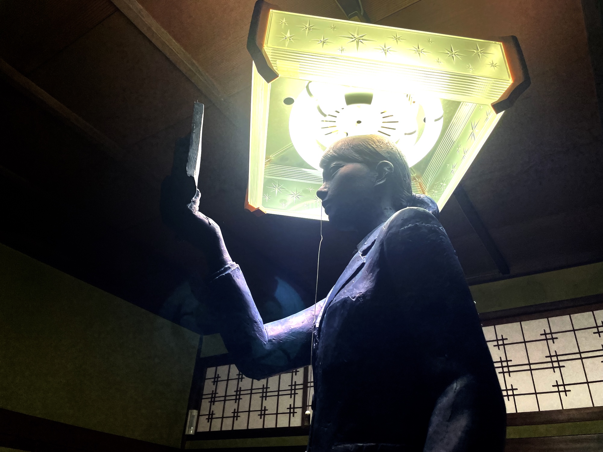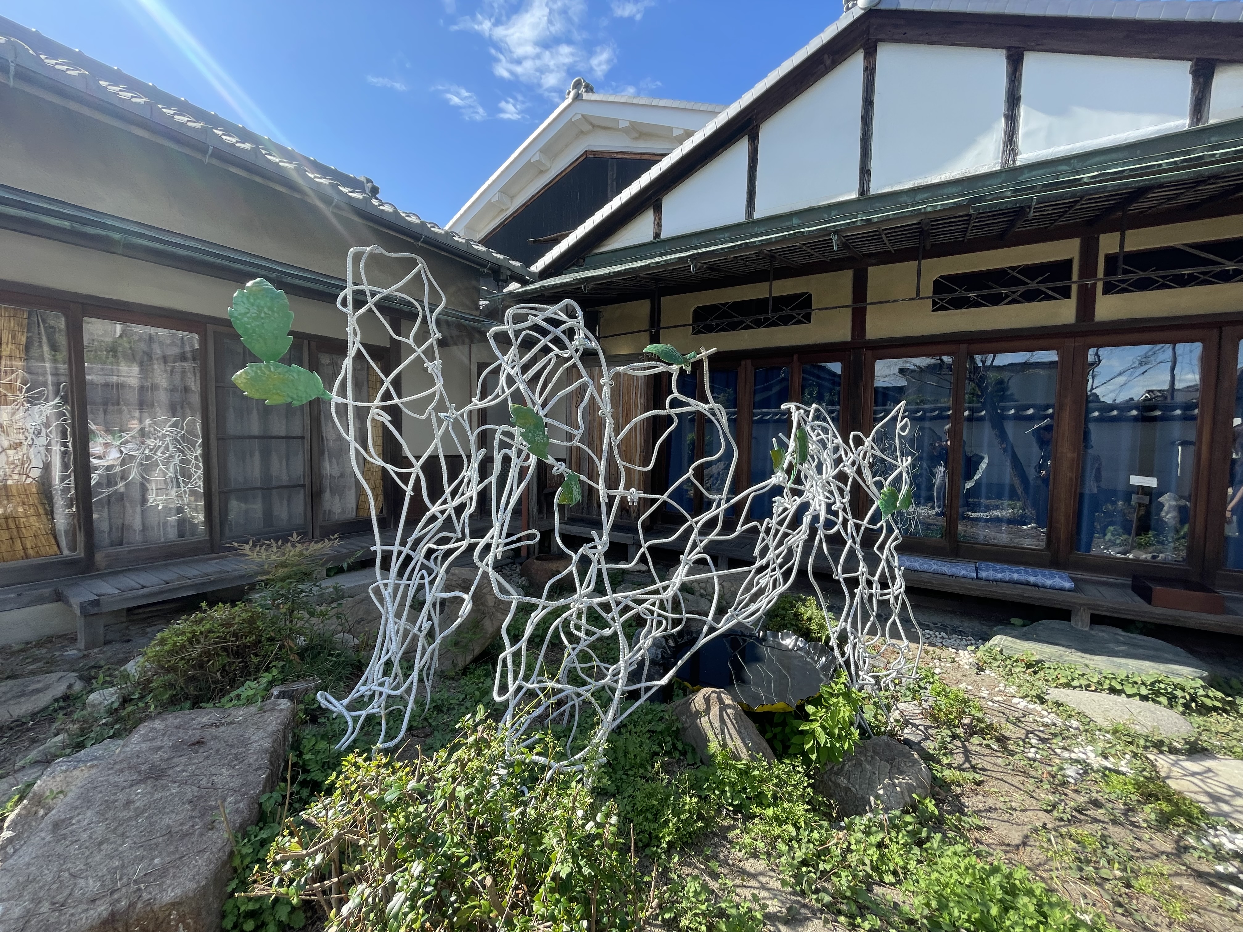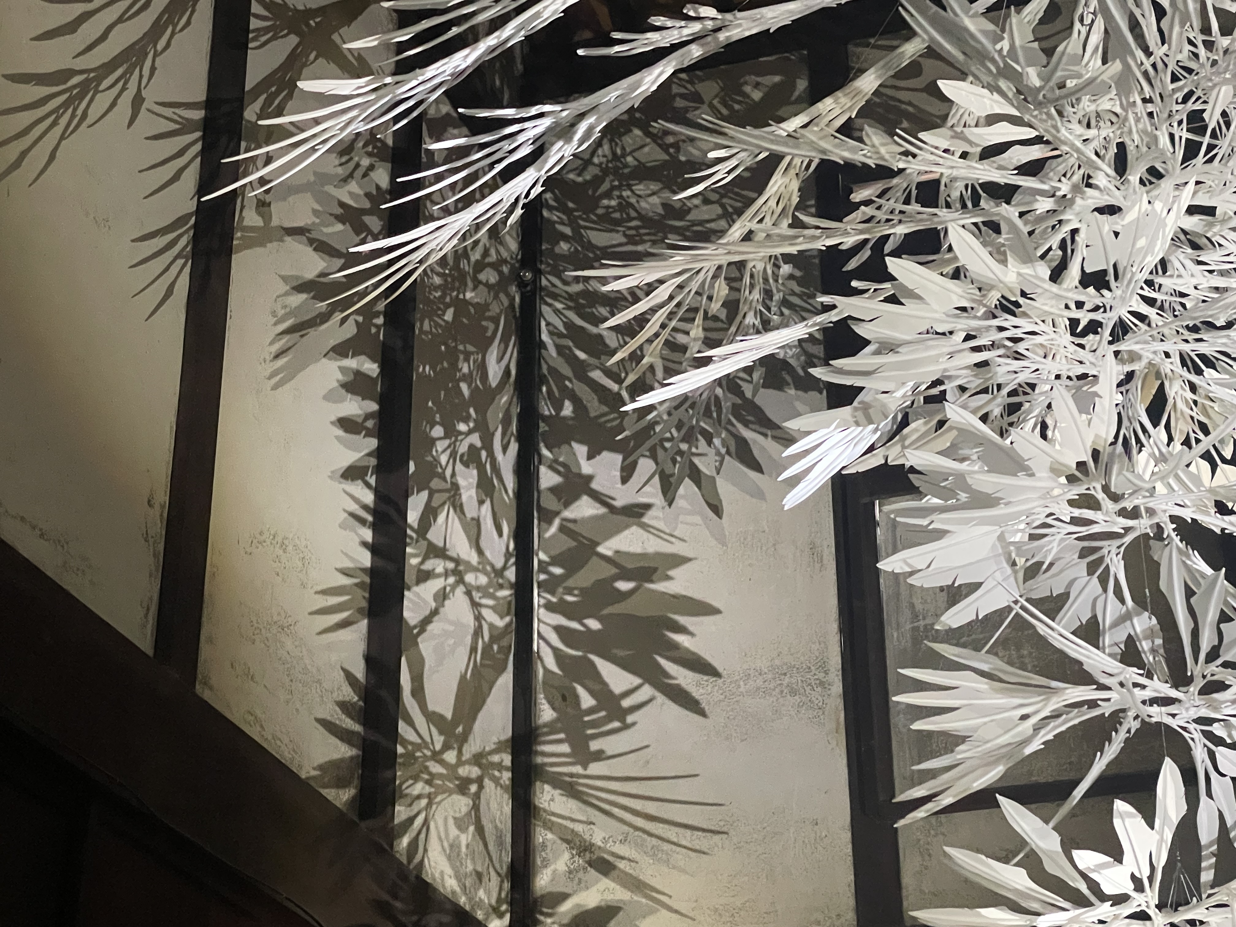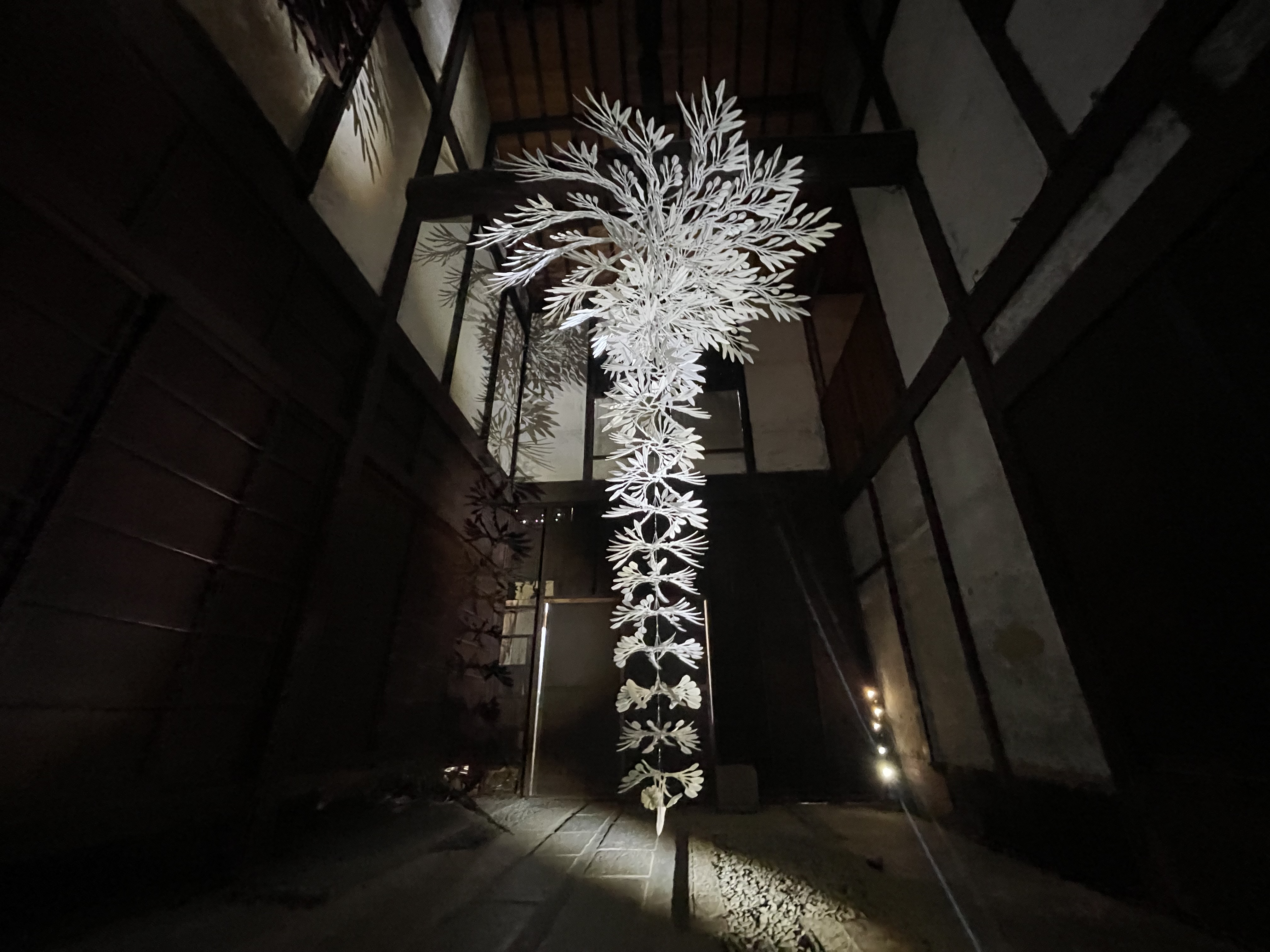 こちらは、もともとは江戸期に繁栄した元材木商の家で、創業1896年の近江牛の老舗「カネ吉」が所有する町家。入り口には、BIWAKOビエンナーレ2025の宣伝ビジュアルにも使用されている、小松宏誠の和紙と3Dプリンターを駆使した彫刻《ライフロング_シャンデリア_リマスター》が、高い天井の空間を生かして設置されている。