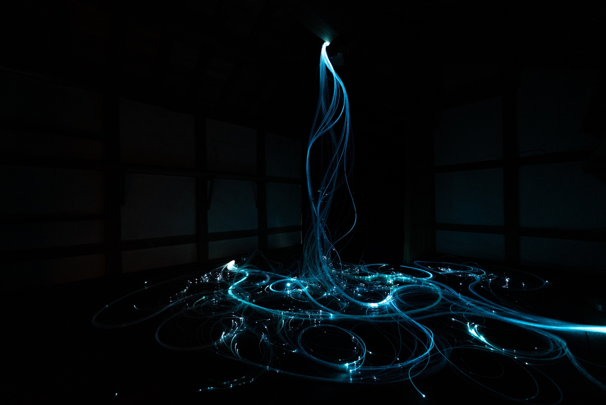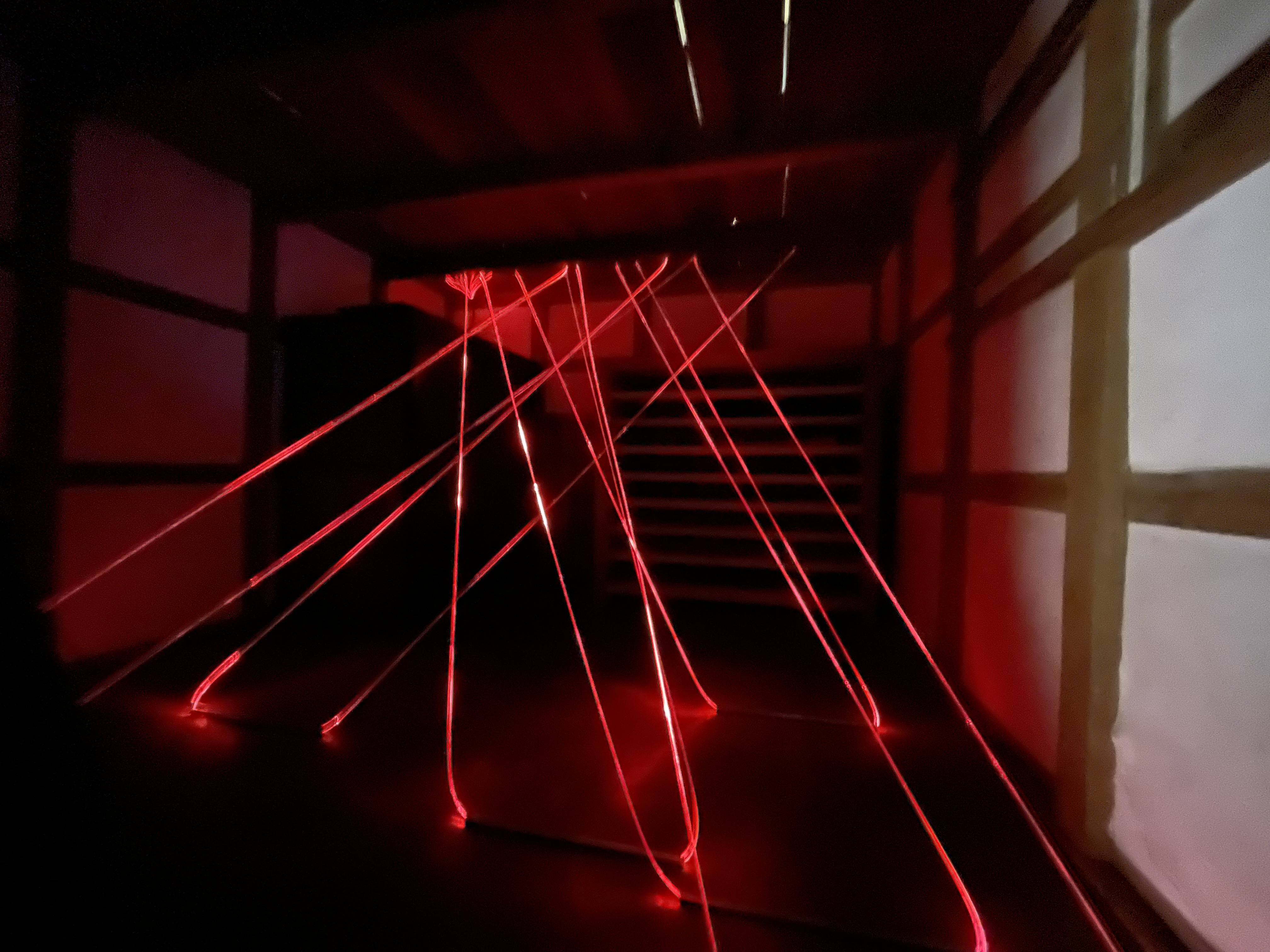 大きな蔵では、暗がりの中に光のラインが交錯するヴィヴィッドな草木義博のインスタレーションと、オード・ブルジンの映像インスタレーションなどが展示され、幻想的な空間を生み出した。