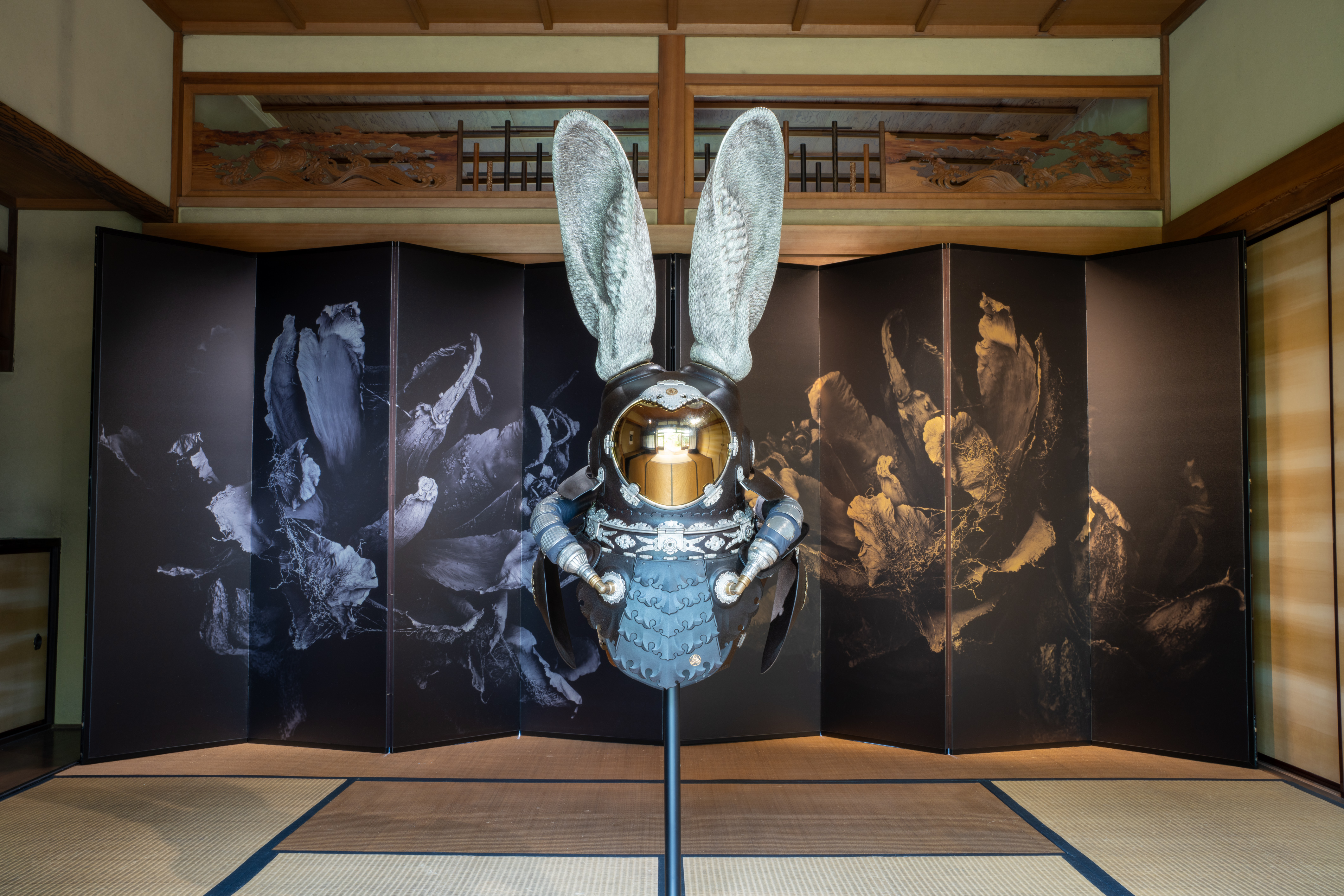 母屋の威厳のある大広間には、塩見亮介の《月面甲冑》と、枯れた植物をモチーフにしたKikoh Matsuuraの写真掛け軸《幽玄》がしつらえられ、コンテンポラリーな和の世界観がクールな印象。