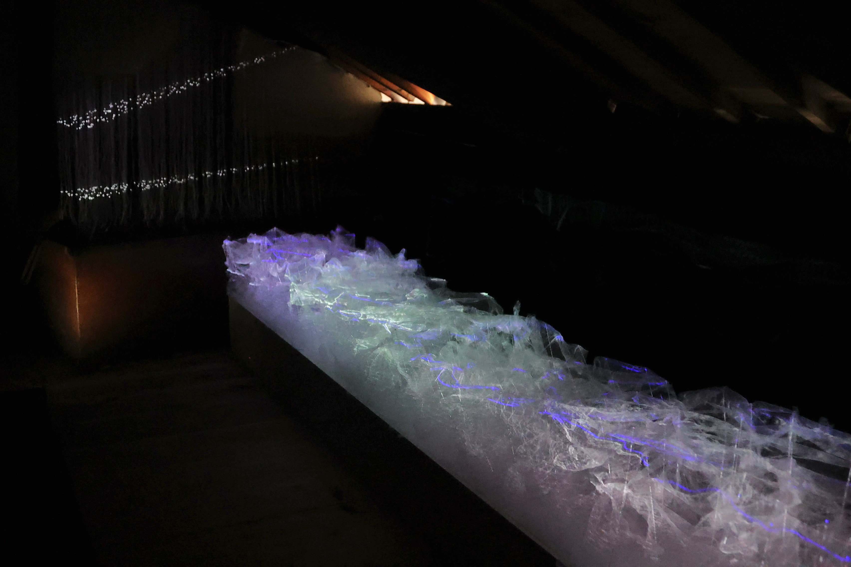 屋根裏に設置されたサークルサイド 《Re:undercurrent》は、一見、無機的で冷ややかなライティングのインスタレーションだが、和紙を折り重ね、近江麻糸の列で流れを構成している。有機的な素材が古民家の建築と生き生きと共鳴している。