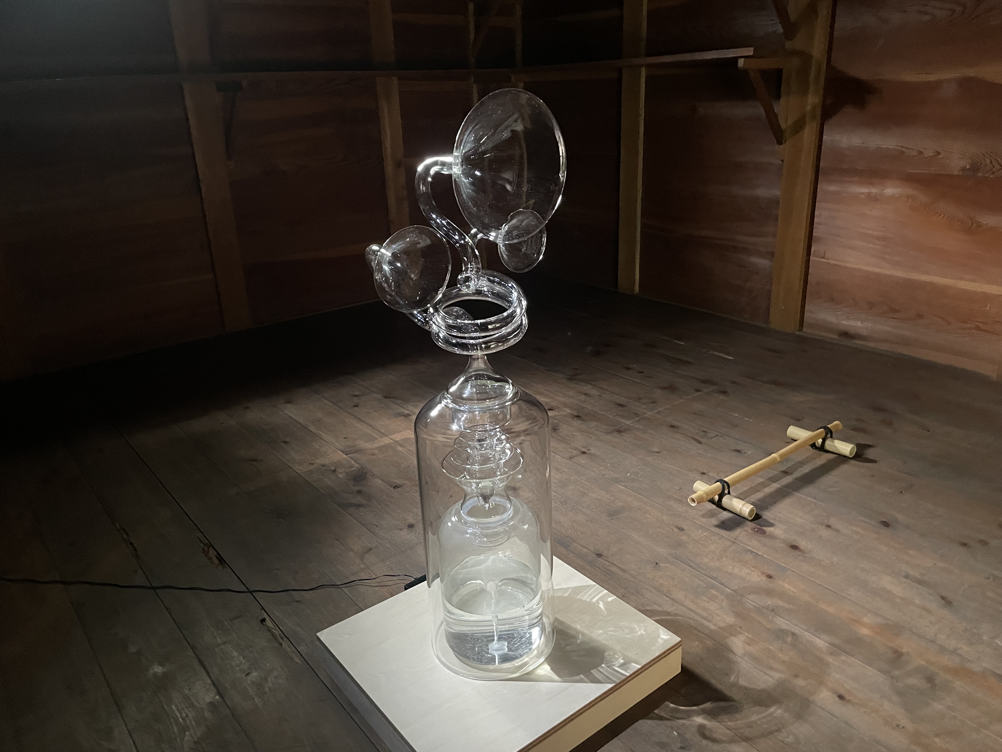 座敷と庭には伊藤幸久の人体彫刻が奇妙なポージングで佇んでいて、まるで古い家に住み着いた座敷わらしが遊んでいるようなユーモラスな眺めが現れた。奥の蔵は、光が明かり取り窓から差し込む構造になっている。この神秘的な採光を生かして、赤松音呂が泡を生成させ、静かな音が漏らすガラスのオブジェを展示した。