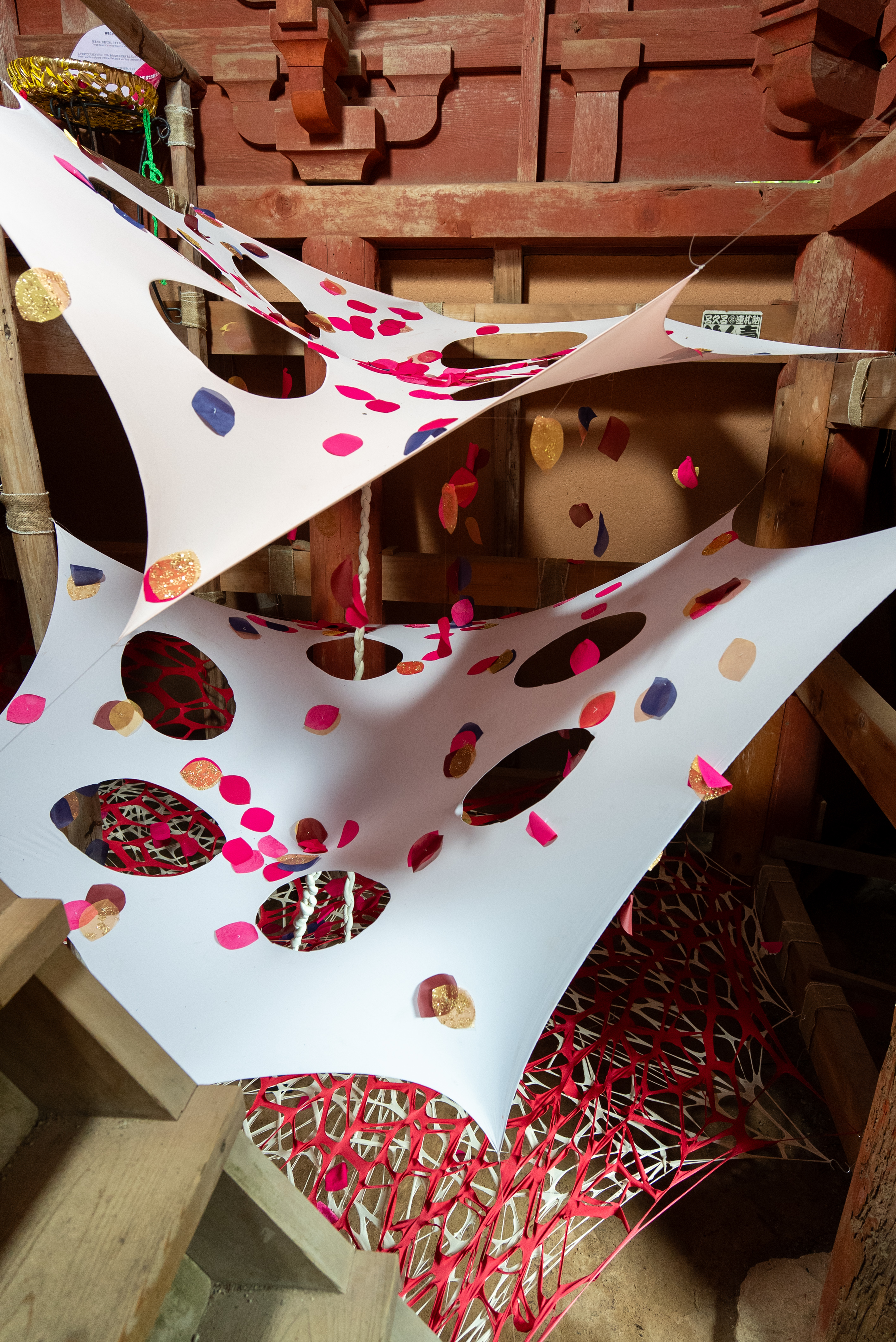 鐘楼には宇野裕美の《散華》。生命を寿ぐ参加型インスタレーション作品だ。