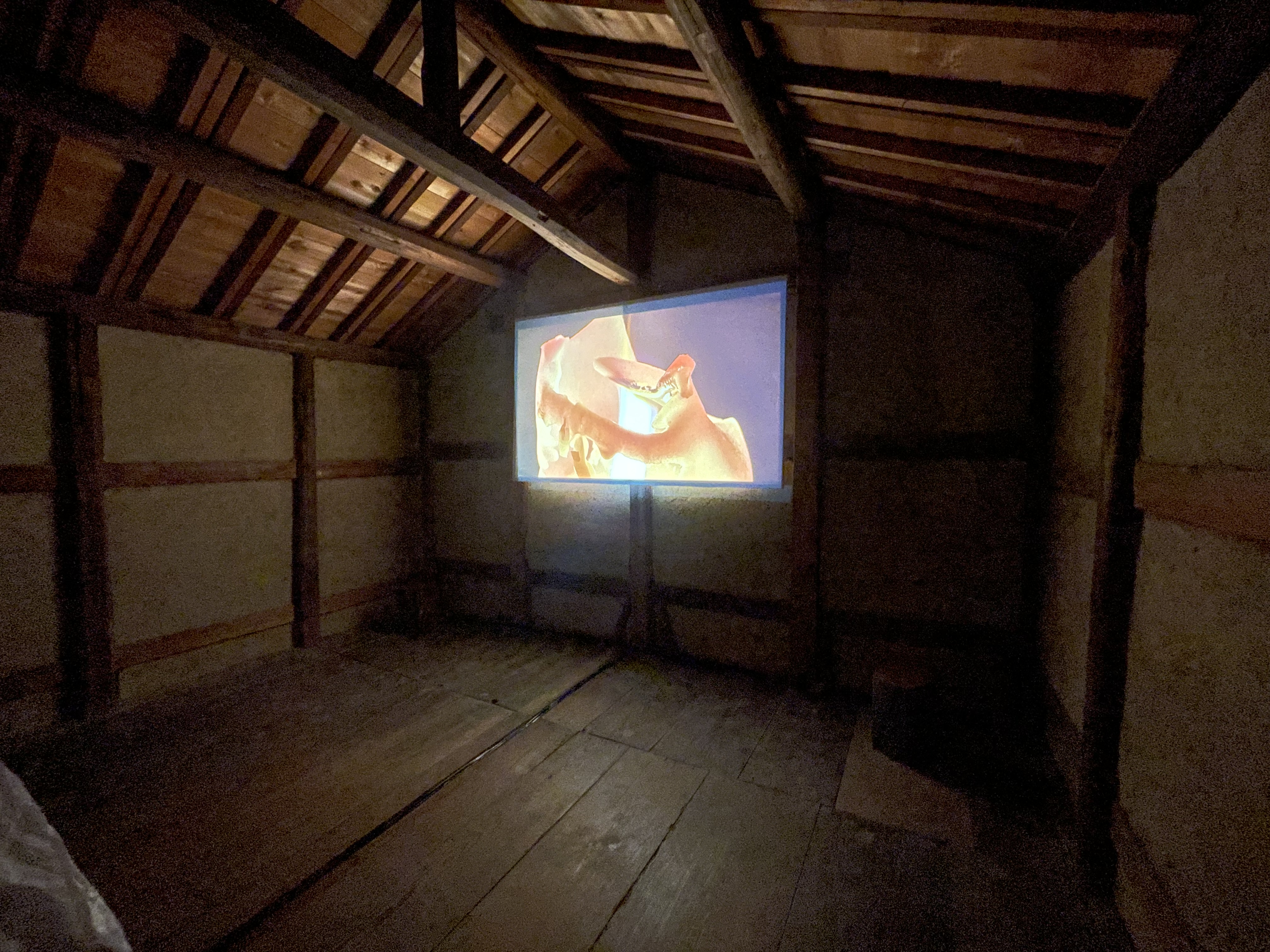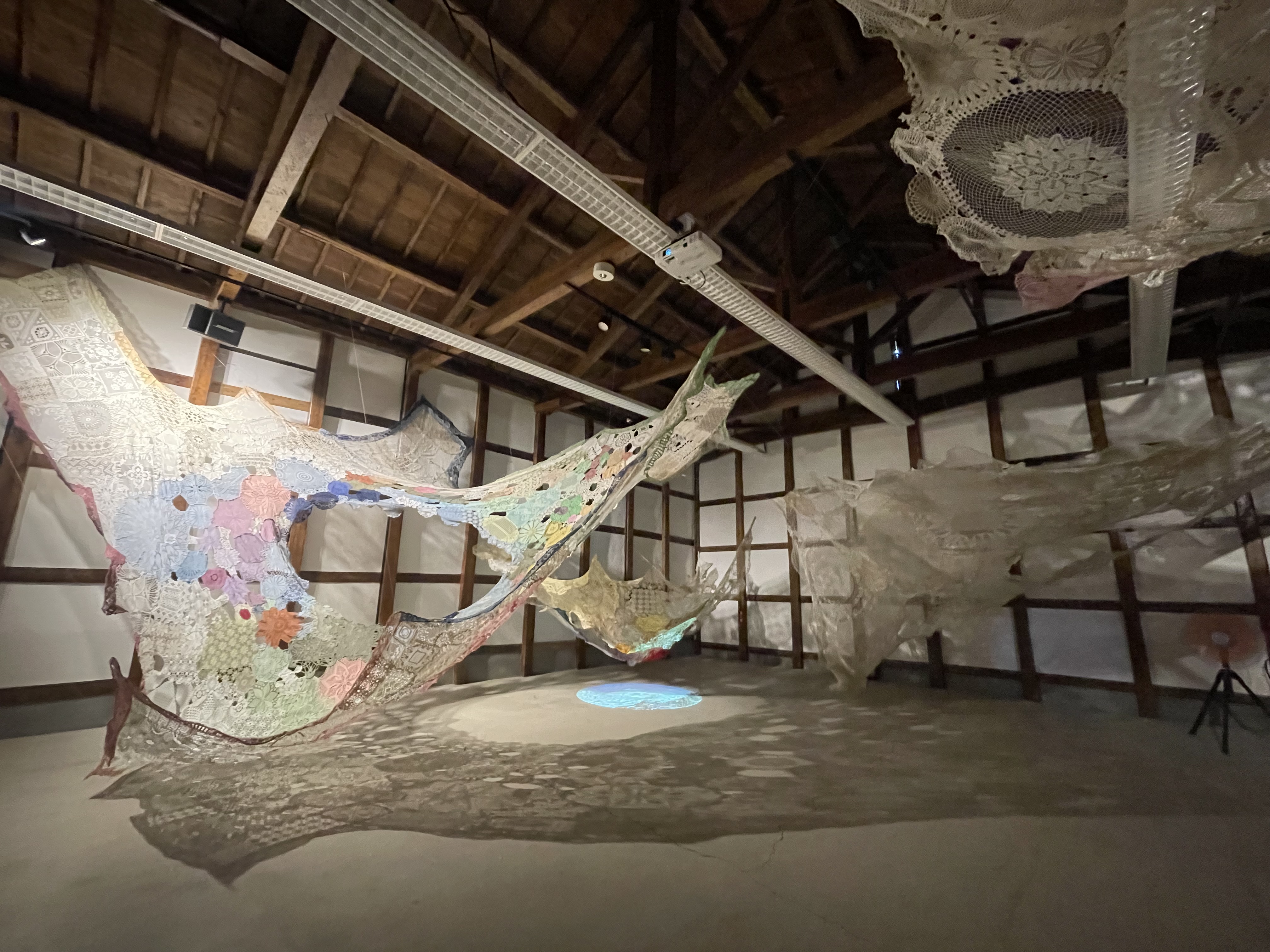 静かな存在感が印象的だったのが、屋根裏に設置された北野雪経の《ここで夢を見ていた》。オブジェが静かに回転し、強い光を浴びながら無限の影を描いてゆく。賑やかなフェスティバルの中で、ひとときの鎮静効果を味わえる。