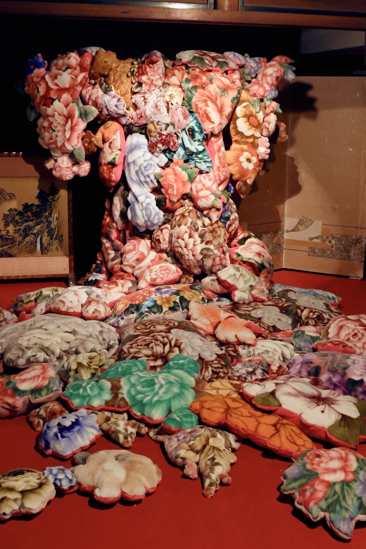 昭和に流行した花柄の毛布を素材にしたコスチューム 《毛布製薔薇柄袷着物》 を赤毛氈の上に展開した江頭誠、そして、男性の芸術家や権力者のポートレイトを女性の姿に変え、その映像をスライド上映。極端な男社会であった(今もだが)日本の近現代史に介入するクラウディア・ラルヒャーの《Filling Gender Bias Gaps》は、少し昔の日本の日常を身近に感じさせるこの空間を味方につけた。この2作品は、ホワイトキューブで見るのとでは、「刺さり方」がまったく異なっただろう。