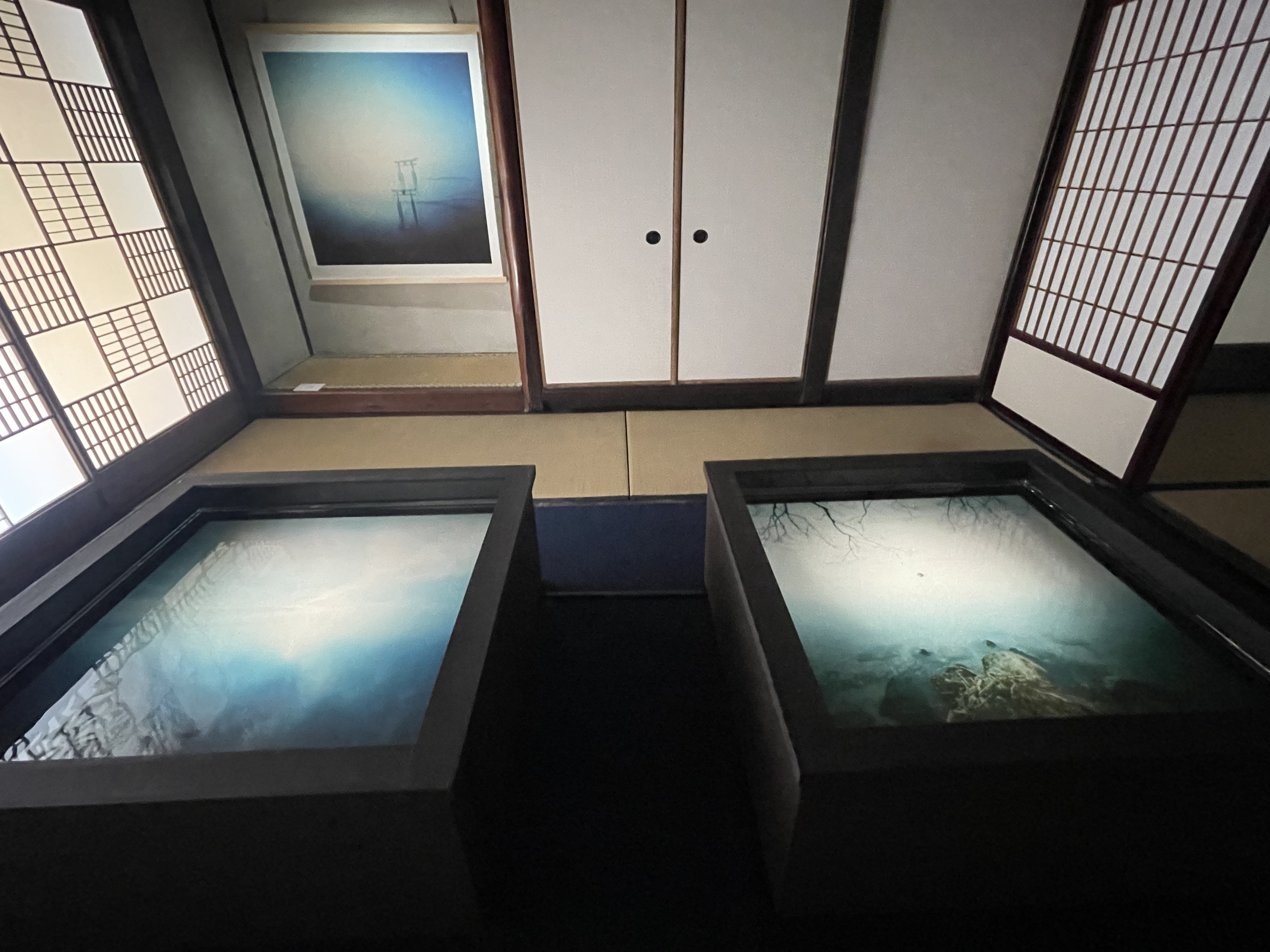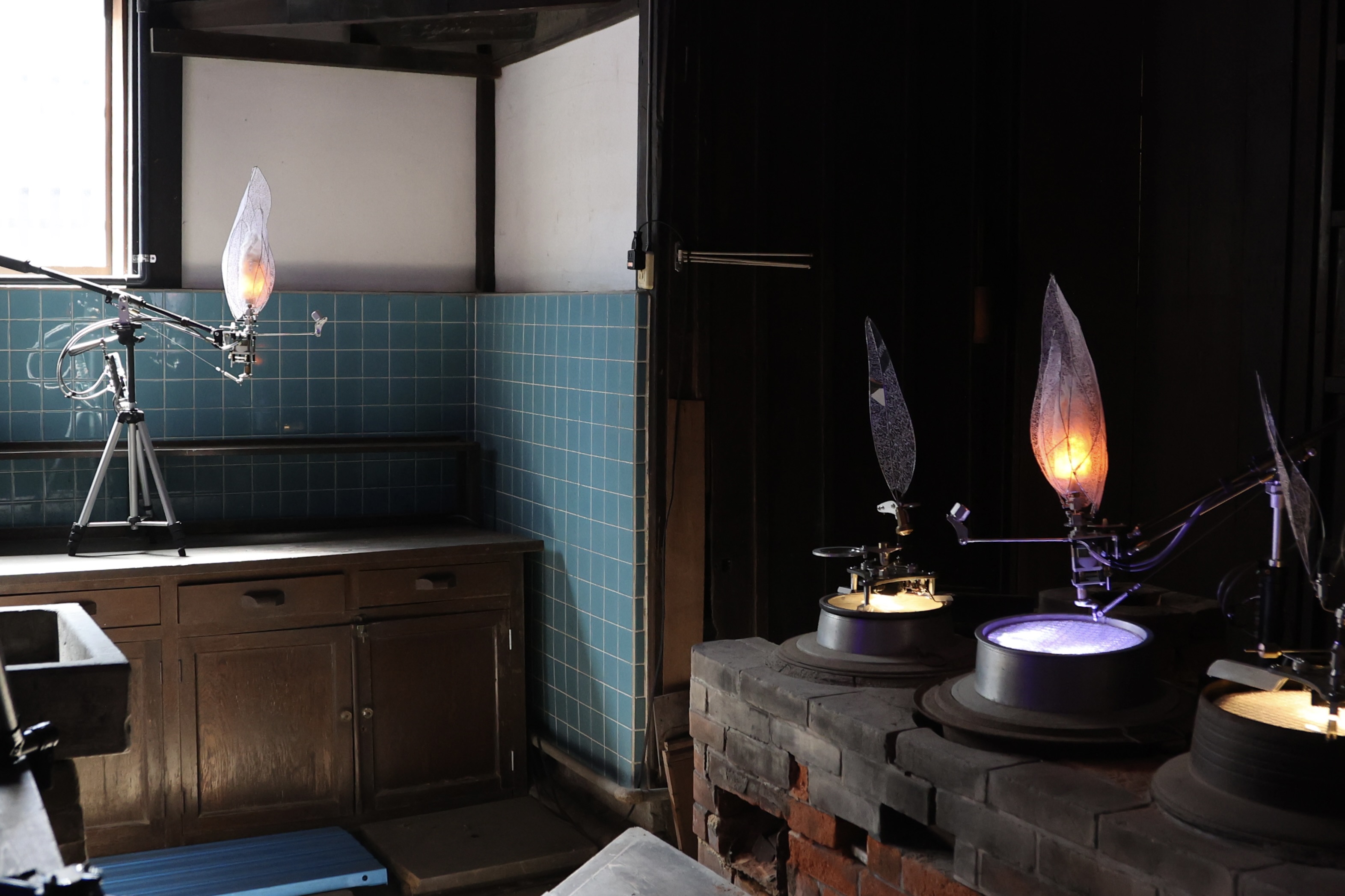 八木玲子は、琵琶湖の水をテーマにした写真インスタレーションで、近江八幡の水の文化にオマージュを捧げた。2階には米津真理奈が、遺跡や骨をかたどった、デカダンなガラス作品を展示している。