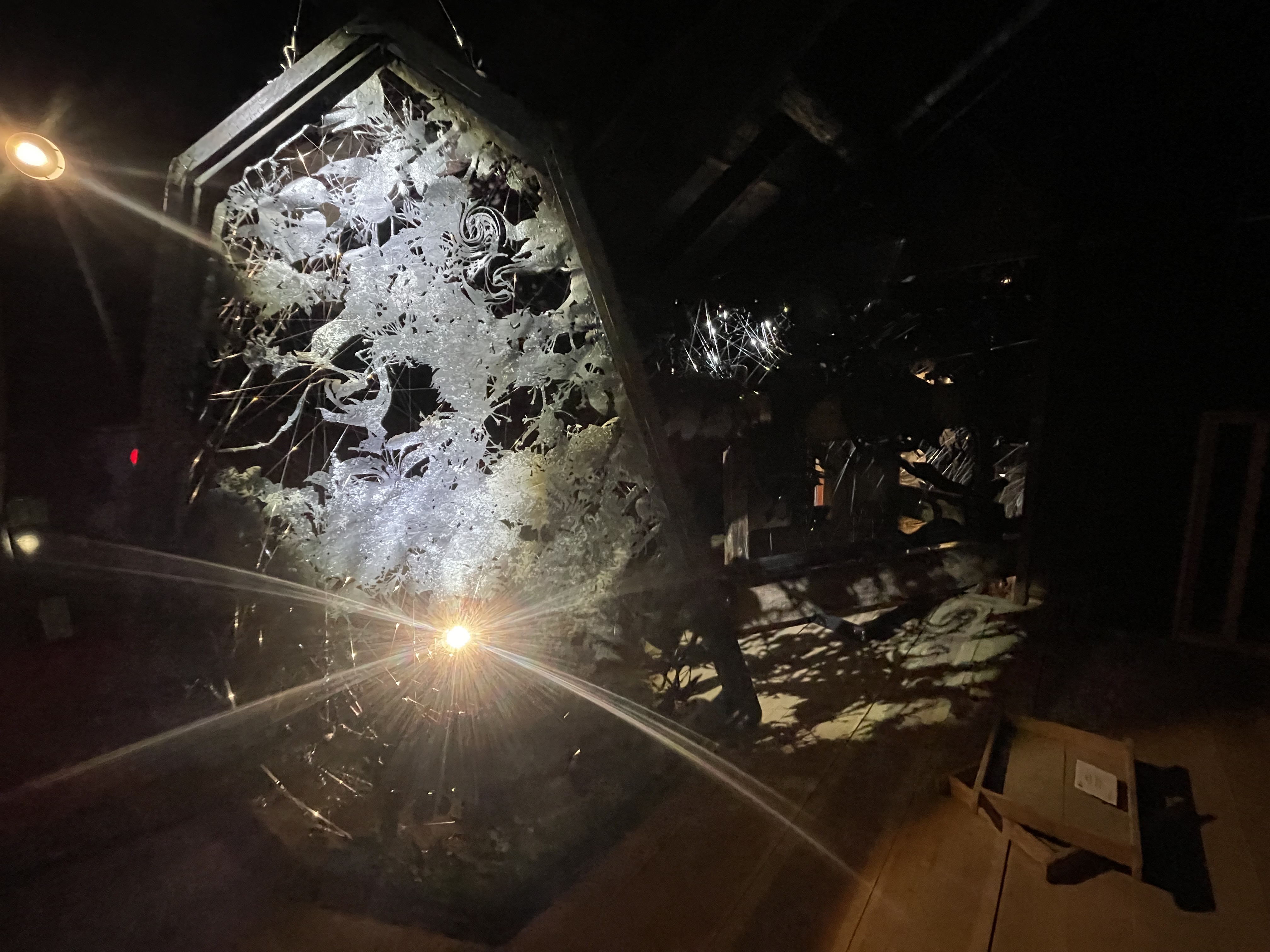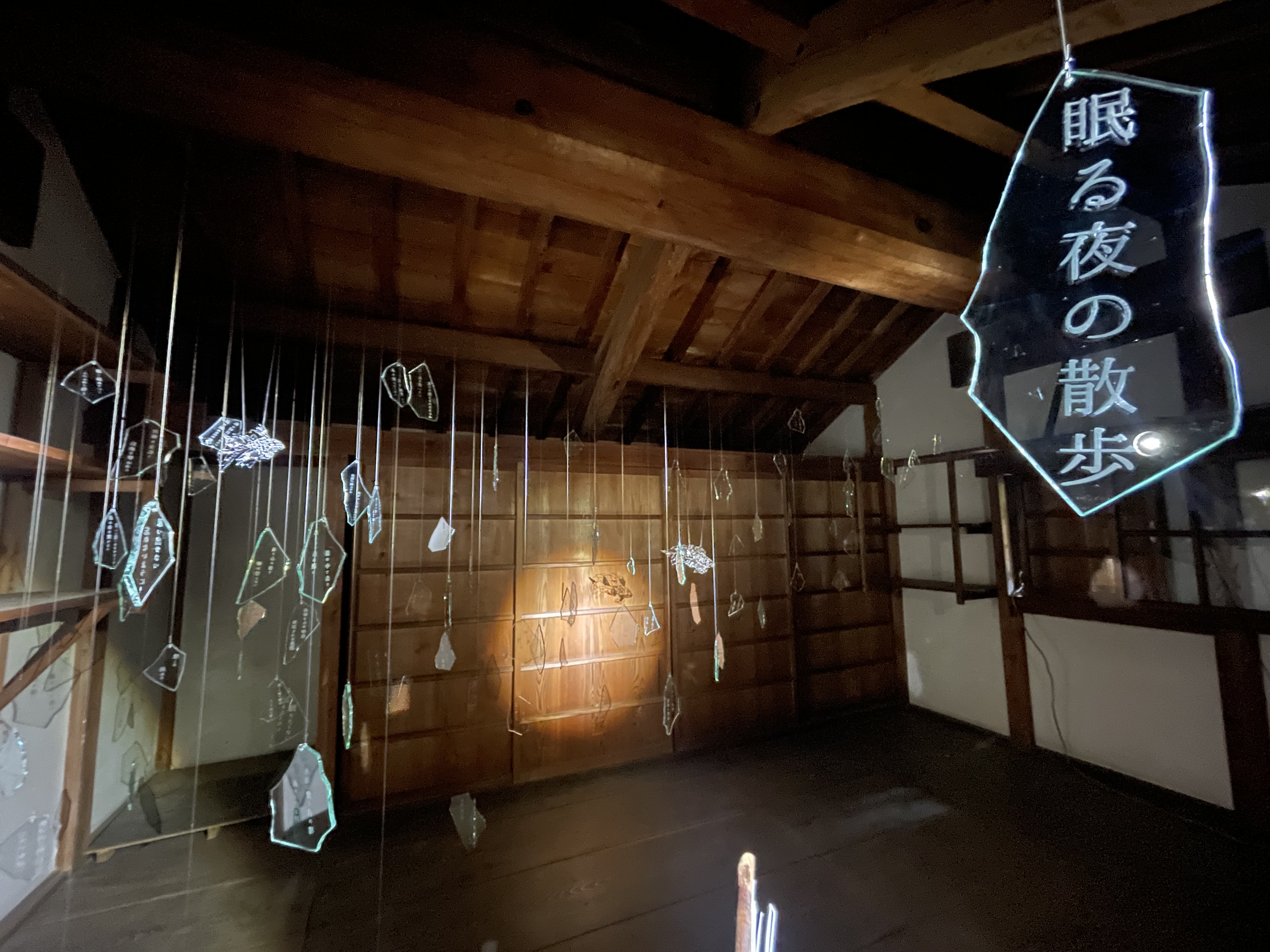 2階には幸小菜が天井から文字を刻印したガラス片を釣り下げる作品を展示していた。刻々と変化する自然光が、ガラスの作品と戯れるように透過、反射して、見ていて飽きない。