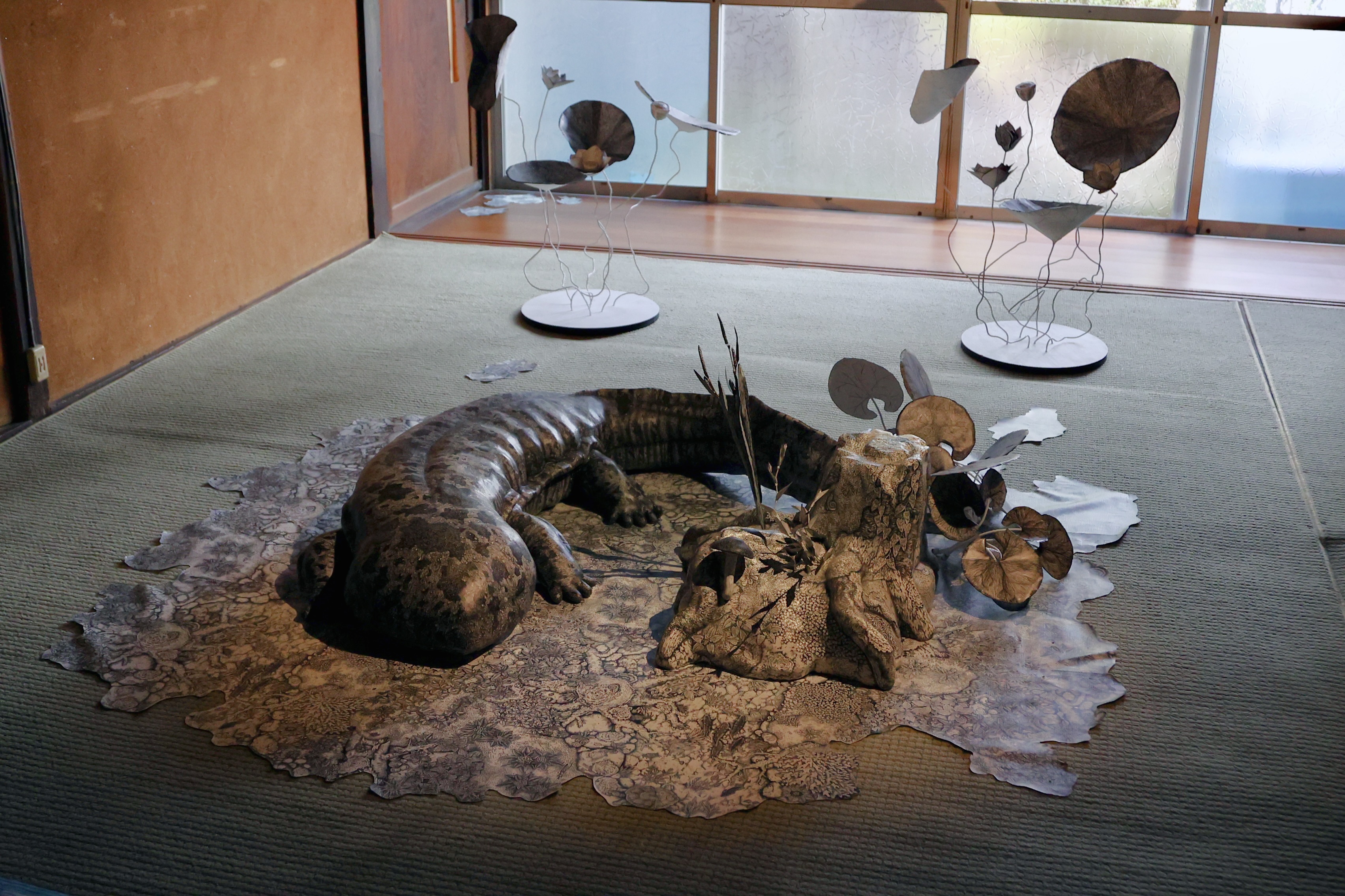 座敷に水と陸の動物たちが蠢くインスタレーションは、村山大明 《大山椒魚と宇宙》。立体にびっしりと描き込まれた細密なドローイングは、野生の命の強靭さと禍々しさを想起させ、居住空間とのコントラストが強い。
