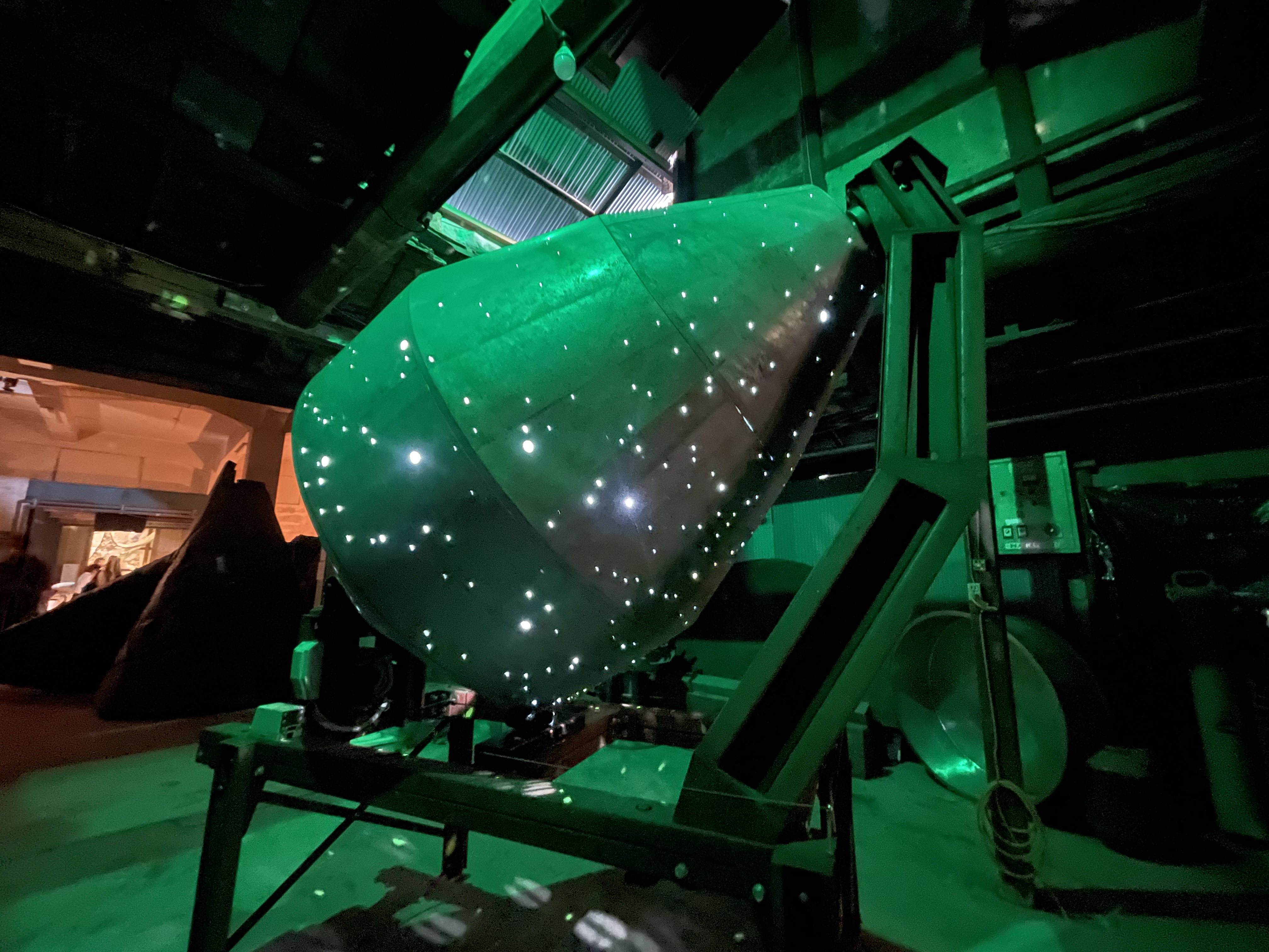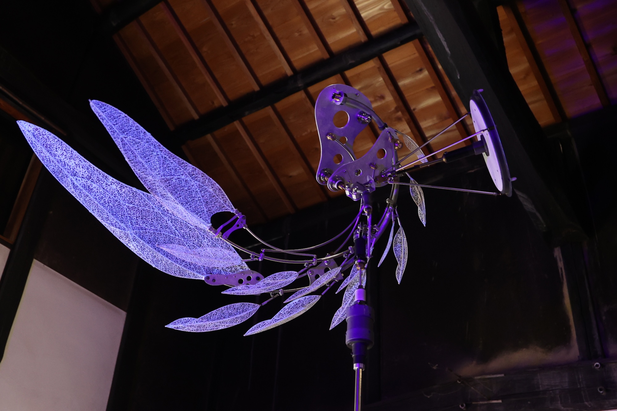 女性アーティスト、エヴァ・ぺトリッチ《第2の空、集合の夢》は、大きな網目の幕のようなスクリーンが吊られた中、地球儀を抱いた女性が眠るインスタレーション。彼女自身の呼吸音と、母国スロヴェニアの詩がオーバーラップし、地球と琵琶湖の映像が投影されている。酒蔵という胎内を思わせる包容力のある空間に、命と大地への賛歌を、大きなスケールで表してみせた。2階では、高い天井、明るい空間のなか、市川平とmiyoshi_makita(三好_槙田)のメカニカルな作品が、空気を切るように、悠然と動いていた。