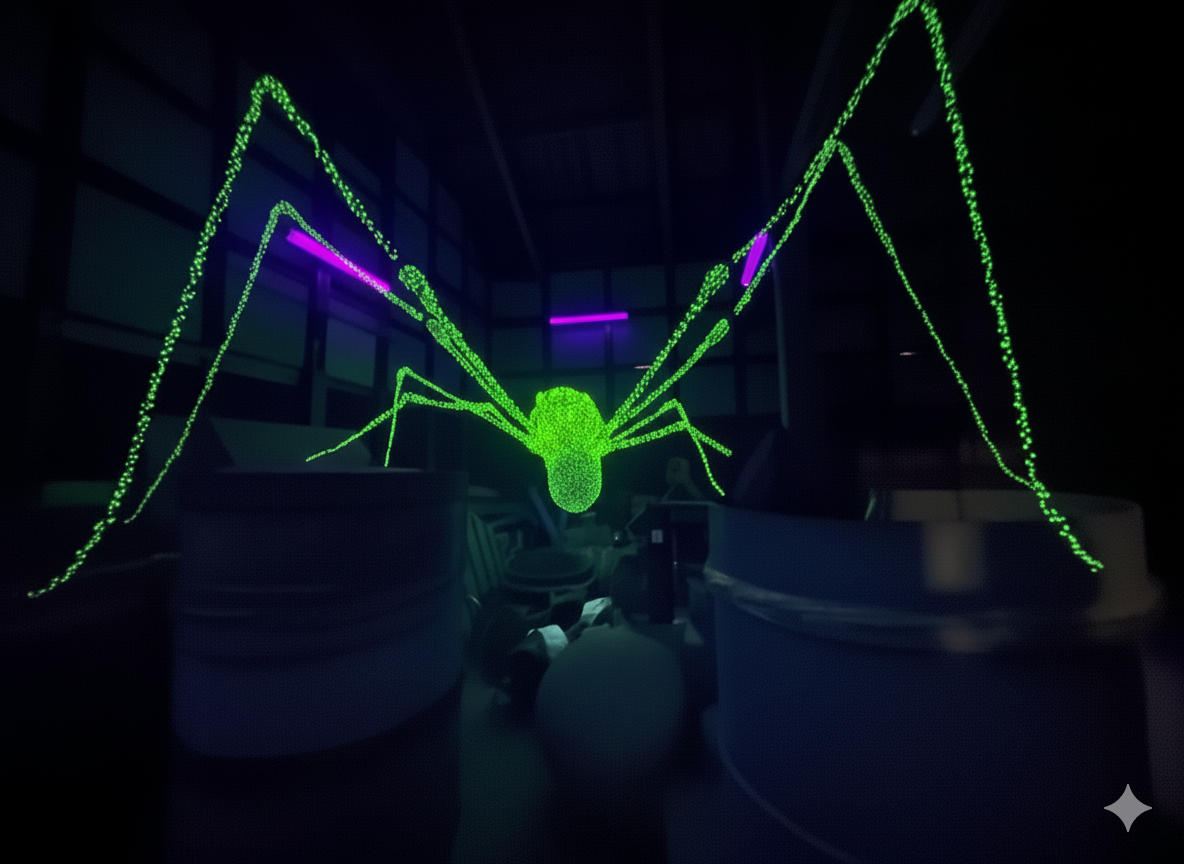 日本とオーストラリア人のアートユニット、米谷健+ジュリアは、暗い空間にウランガラスを素材にした蛍光色の蜘蛛のオブジェを浮かび上がらせた。タイトル《大蜘蛛伝説》は日本のウラン採掘地・人形峠に残る伝承にちなんでいる。原子爆弾被爆80年の今年を考えさせる作品だ。