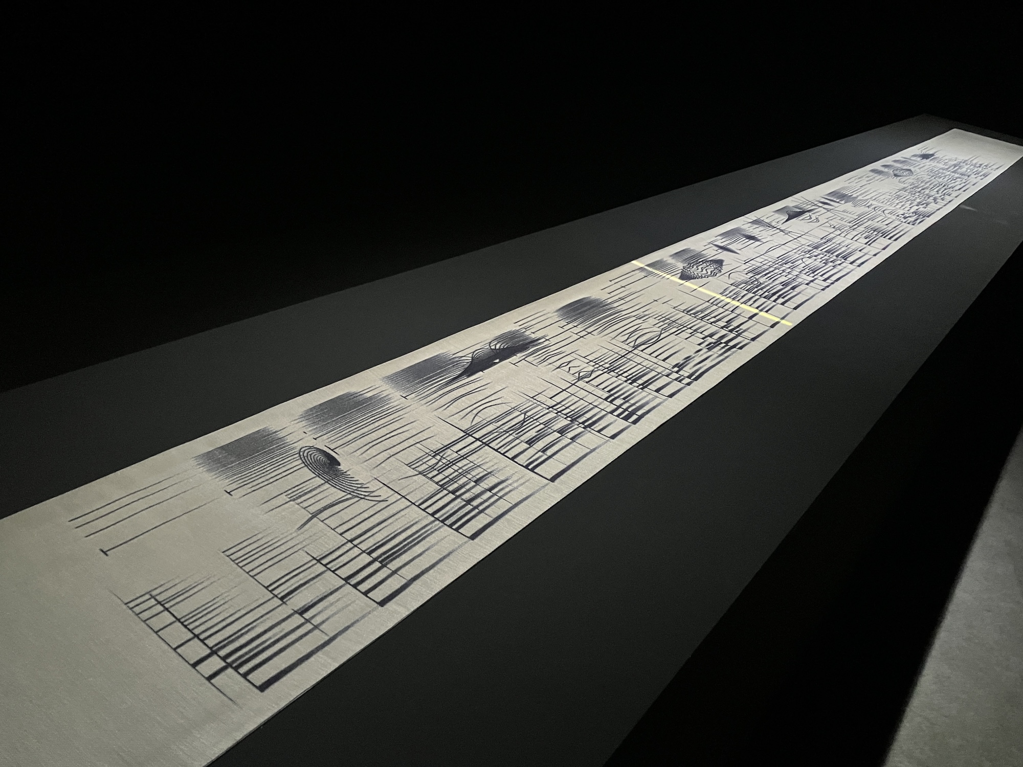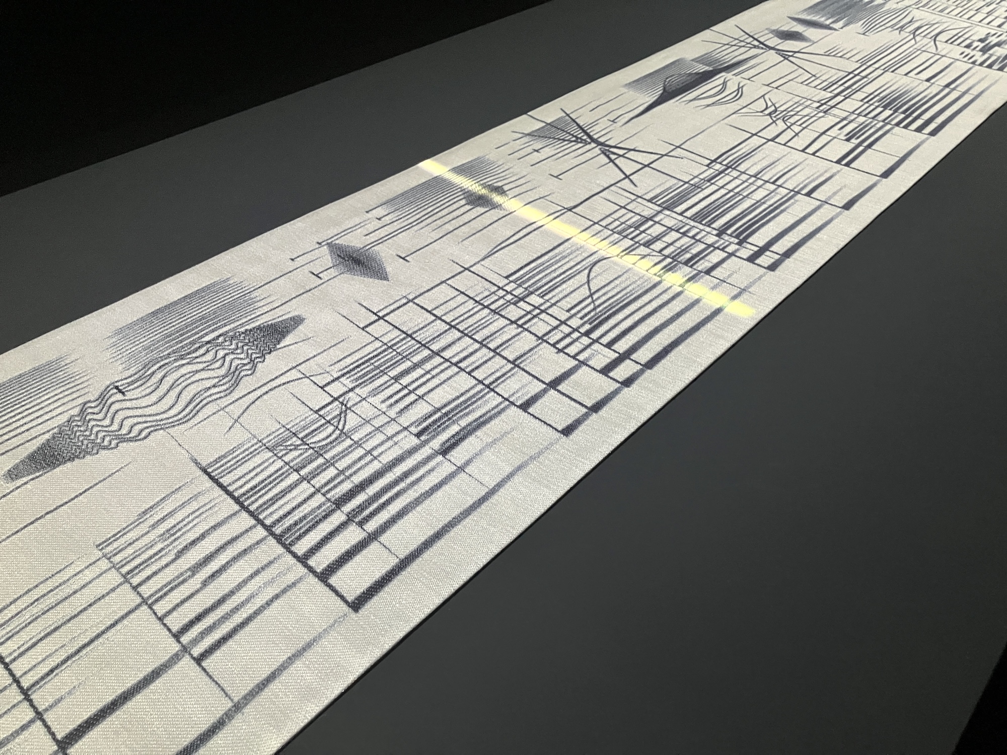 もうひとつの新作《Sono Obi》では、ソノグラム(スペクトログラムとも呼ばれる)の手法を使い、音そのものを織物に変換している。スペクトログラムは音の周波数スペクトルを横軸に時間、縦軸に周波数、信号の強さを色や明度で表し、視覚化したもので、音がパターンとして図像化される。ここでは音のデータが織りの設計図となり、ジャカード織機によって帯として織り上げられた。ニコライはこれを「織られた音楽」と呼ぶ。《Sono Obi》はこの帯と、デザインのもととなる作曲された作品の両方を指すのだという。原理的には織物からふたたび音にデータ変換することができ、帯は音のアーカイヴにもなっている。