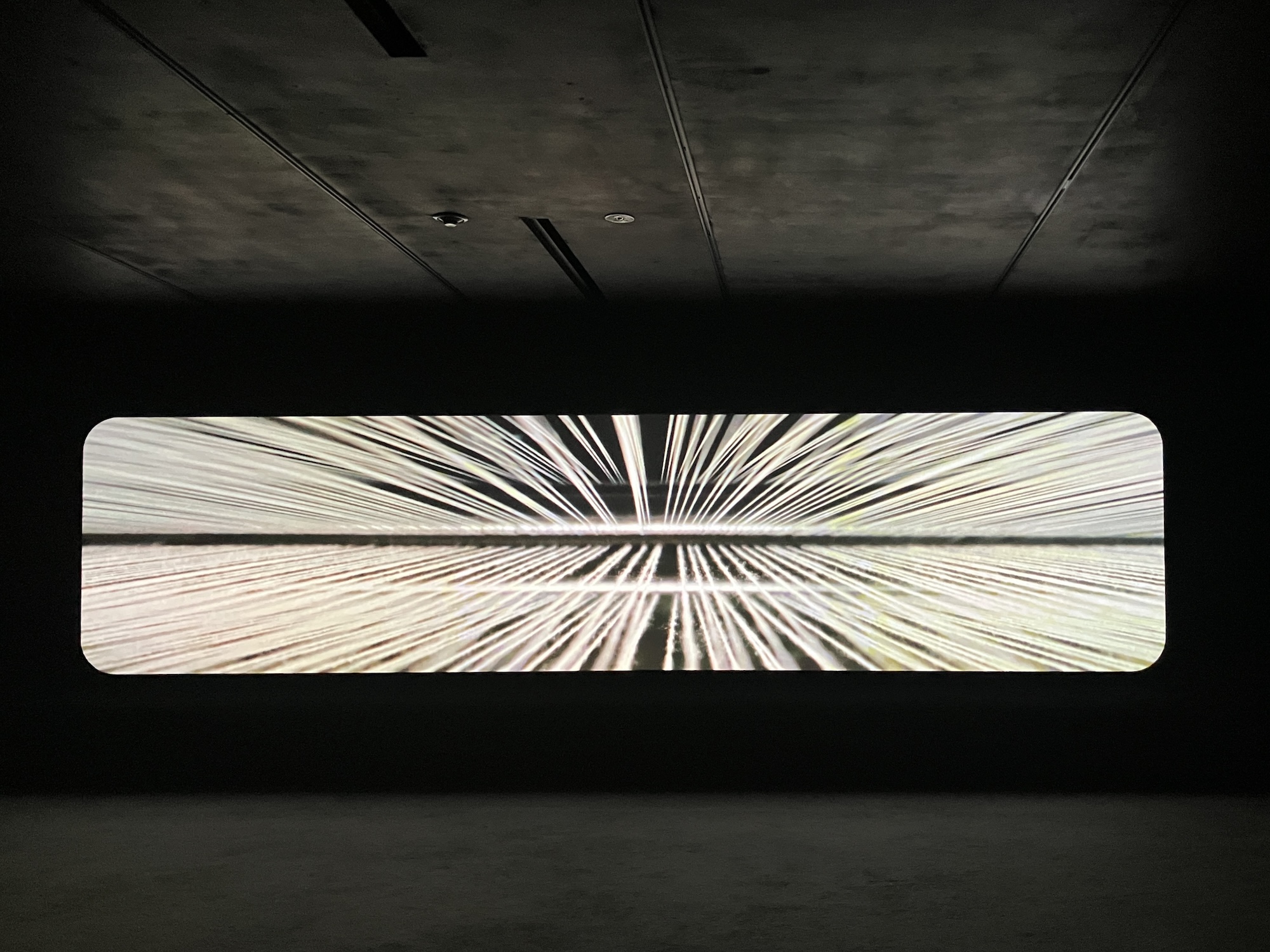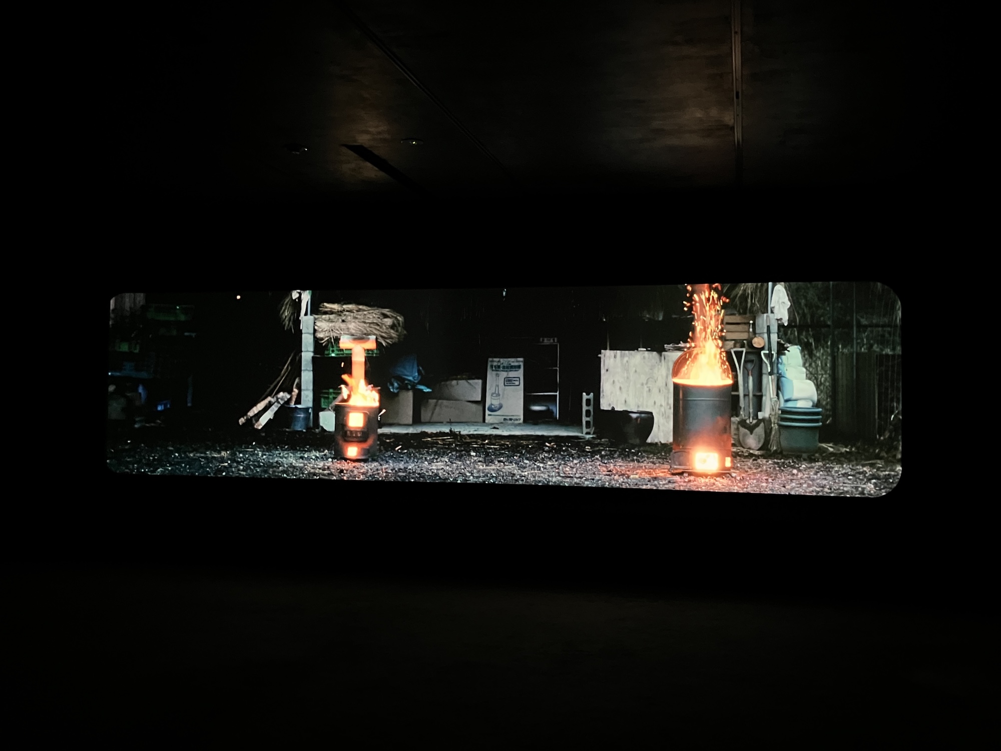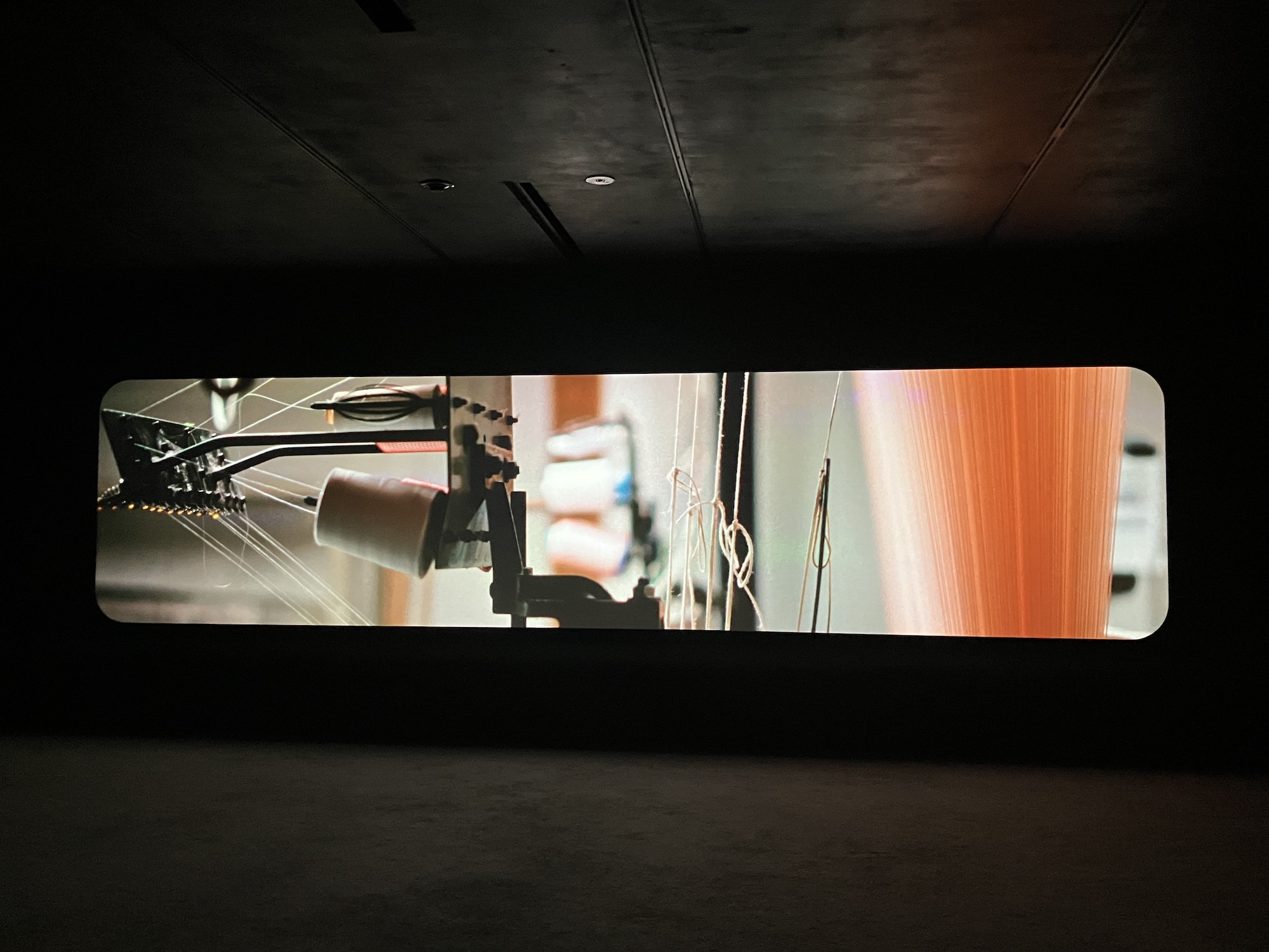 暗闇の中に設置されたスクリーンには、染色に使う稲藁が静かに燃える様子、工房で動く機械、織られていく糸や織機を接写した映像、そして丹波の幽玄な山並みなどが詩的に映し出される。パチパチと燃える炎や、経糸と緯糸を交差させる織機の上下運動など、映像の中の音やリズムがミニマルな電子音と呼応し、織物やその素材の制作過程が詩的な映像世界として立ち上がる。