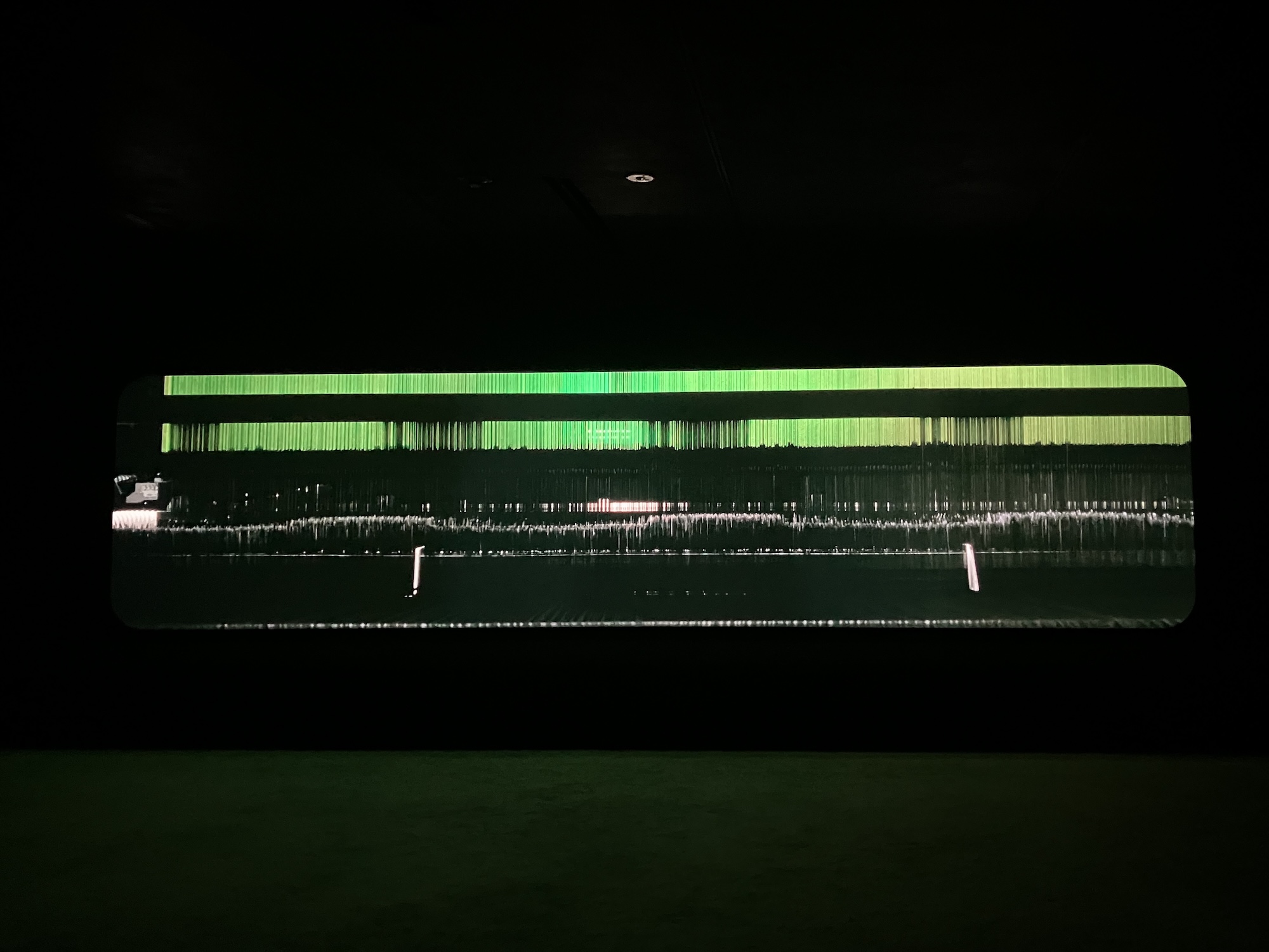 実際に展示されている帯《Sono Obi Landscape》を見てみると、織られた模様は山並みや波紋、幾何学的な図形など、音の痕跡が風景のように姿を変えながら現れている。また、《Wave Weave》で流れる音楽は、《Sono Obi》の帯のパターン生成に使われた作曲データをもとにしており、映像と織物が音を介して循環的に結びついている。