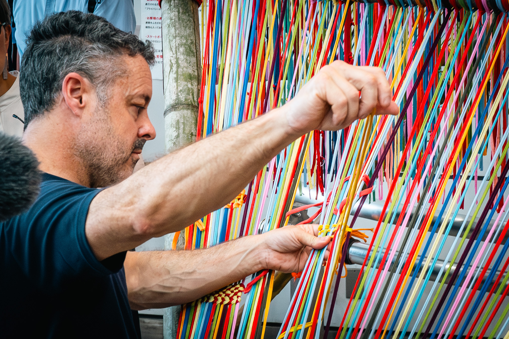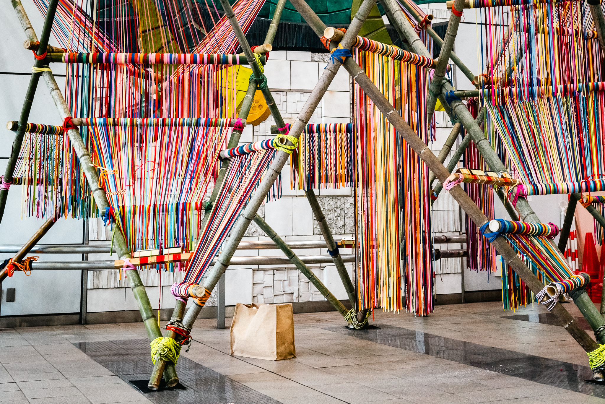 たとえば、スロー・アート・コレクティブの《STATION to STATION》は、会期中に一般の人々が、作品の骨格を成す竹に紐という自由度の高い素材を編み込んだり、結んだりしていくにつれて、ボリュームのある装飾的な姿へと成長していく作品だ。また作品に設置された楽器を叩いて鳴らしたりすることもできる。