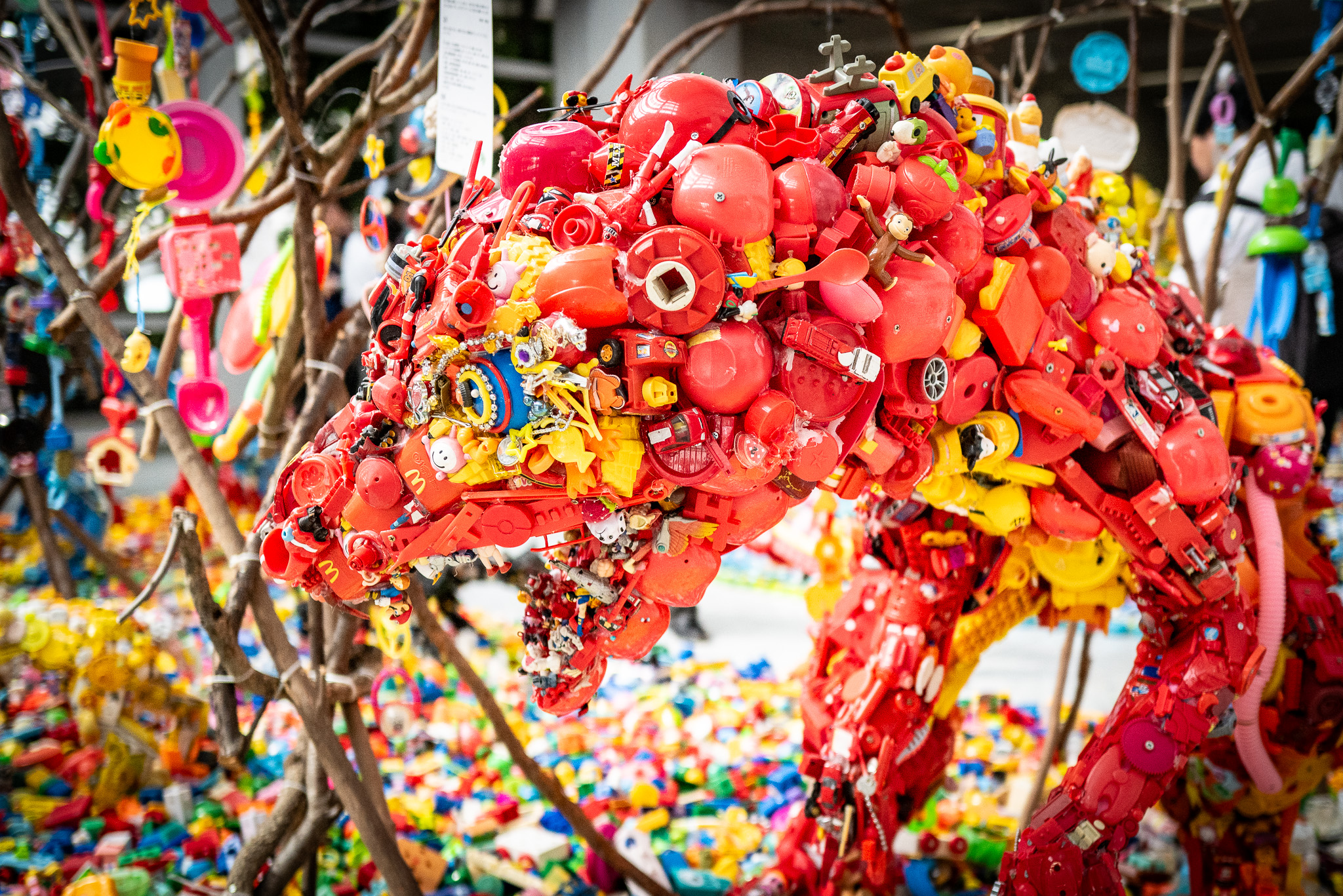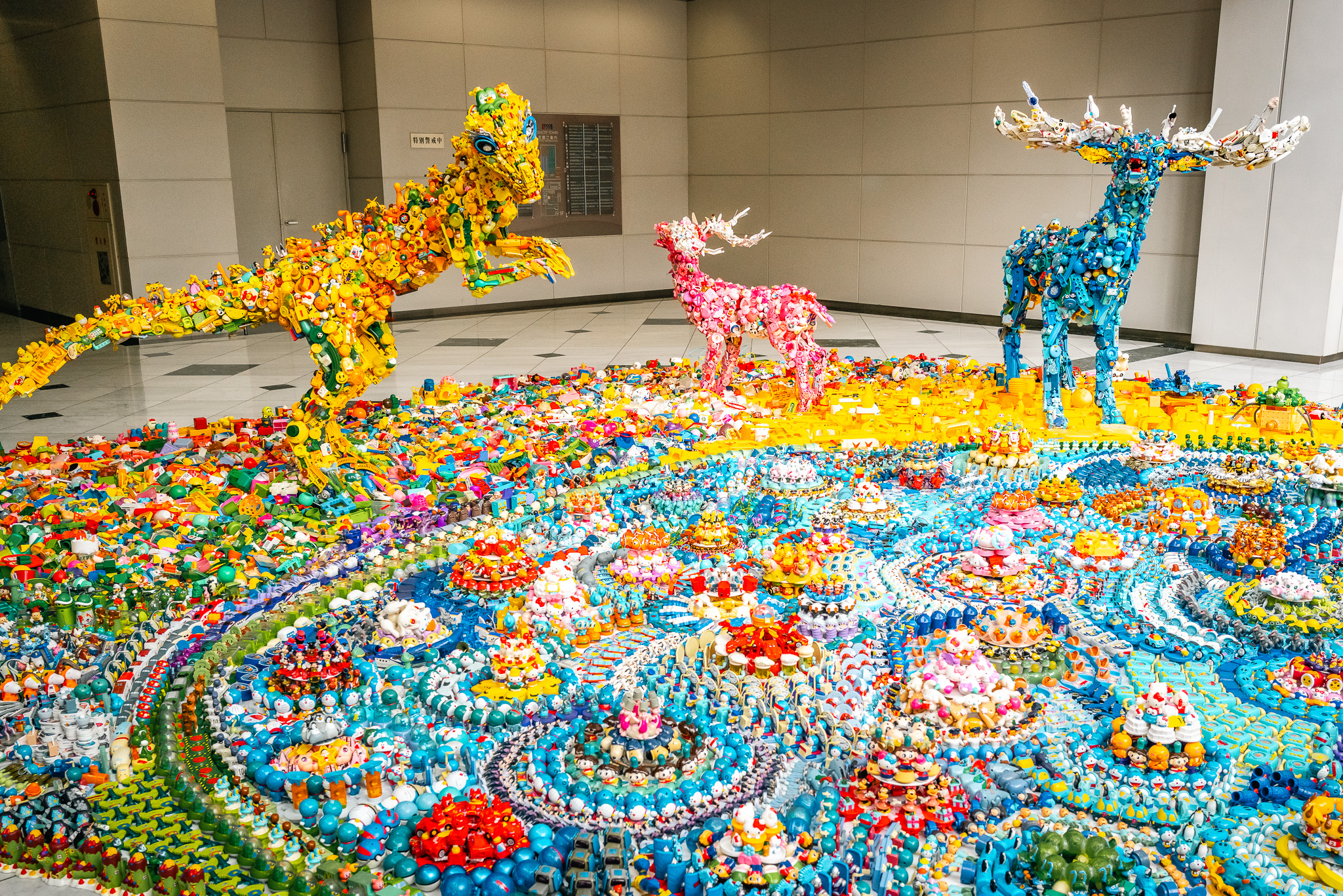 藤浩志は、子供たちが不要になったおもちゃを交換する「かえっこバザール」を2024年から千葉市内の複数箇所で開催。会場では集まったプラスチック素材を用いて制作された《かえるの池》が展示されている。