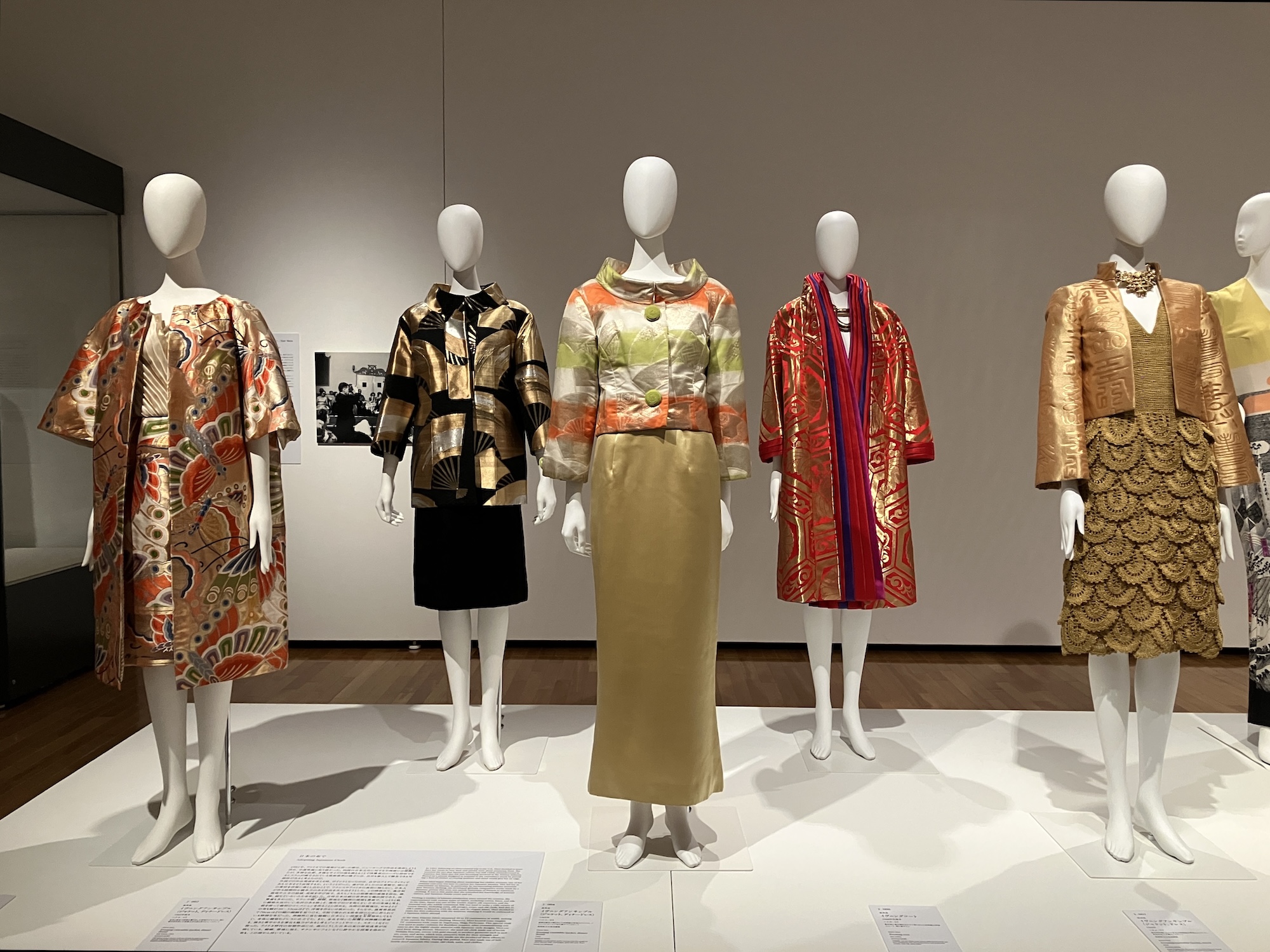 第2章では、百貨店文化を背景にアメリカのファッション業界に挑んだ森の仕事を紹介する。見どころは、金糸を用いた絢爛な西陣織の帯地によるイヴニングアンサンブルや、伸縮性とさわやかな肌感が特徴の縮緬を用いたドレス、藍染の浴衣地をパッチワークしたワンピースやジャンプスーツなど、森による丹念な日本の素材研究の成果が結実した作品群。こうした日本の素材や紋様への視線は、後のオートクチュールの代表作にも受け継がれていく。