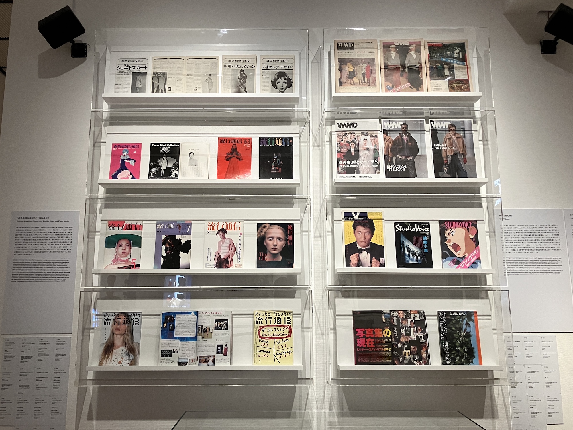 その出発点ともいえる雑誌『流行通信』の創刊だけでなく、長男の森顕が原宿に開いたライフスタイルショップ「スタジオV」の広報誌として創刊した『STUDIO VOICE』、アメリカのファッションビジネス新聞「Women's Wear Daily」の日本版『WWDJAPAN』など、ハナエ・モリグループは最先端のファッションとカルチャーを日本に紹介する活動を精力的に展開した。会場ではバックナンバーが壁一面に展示されている。