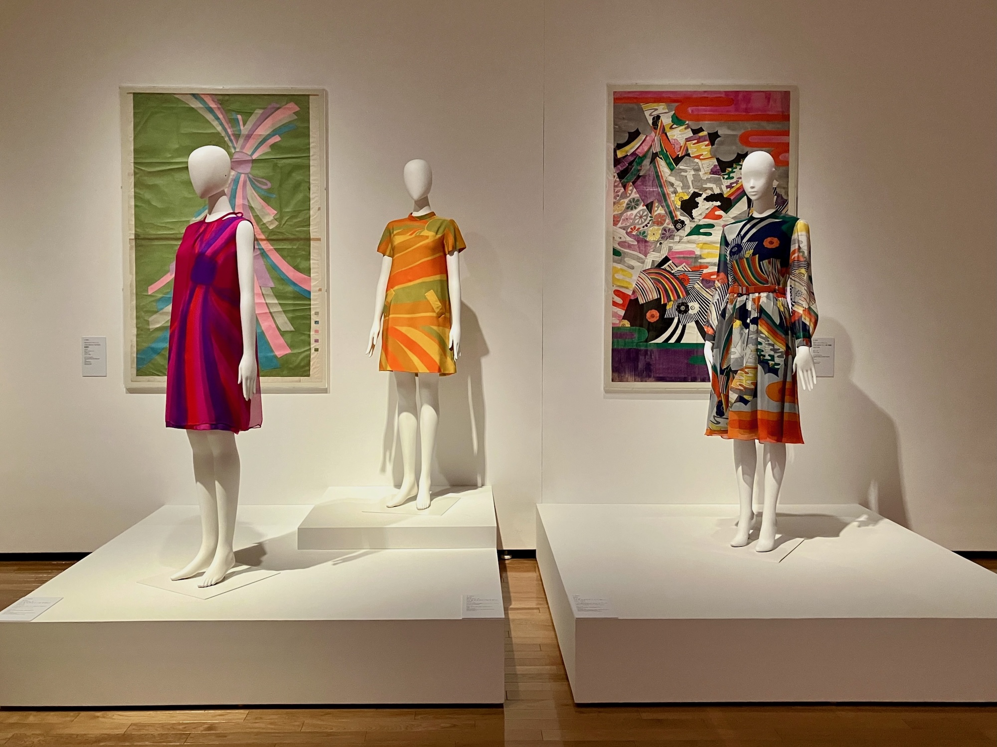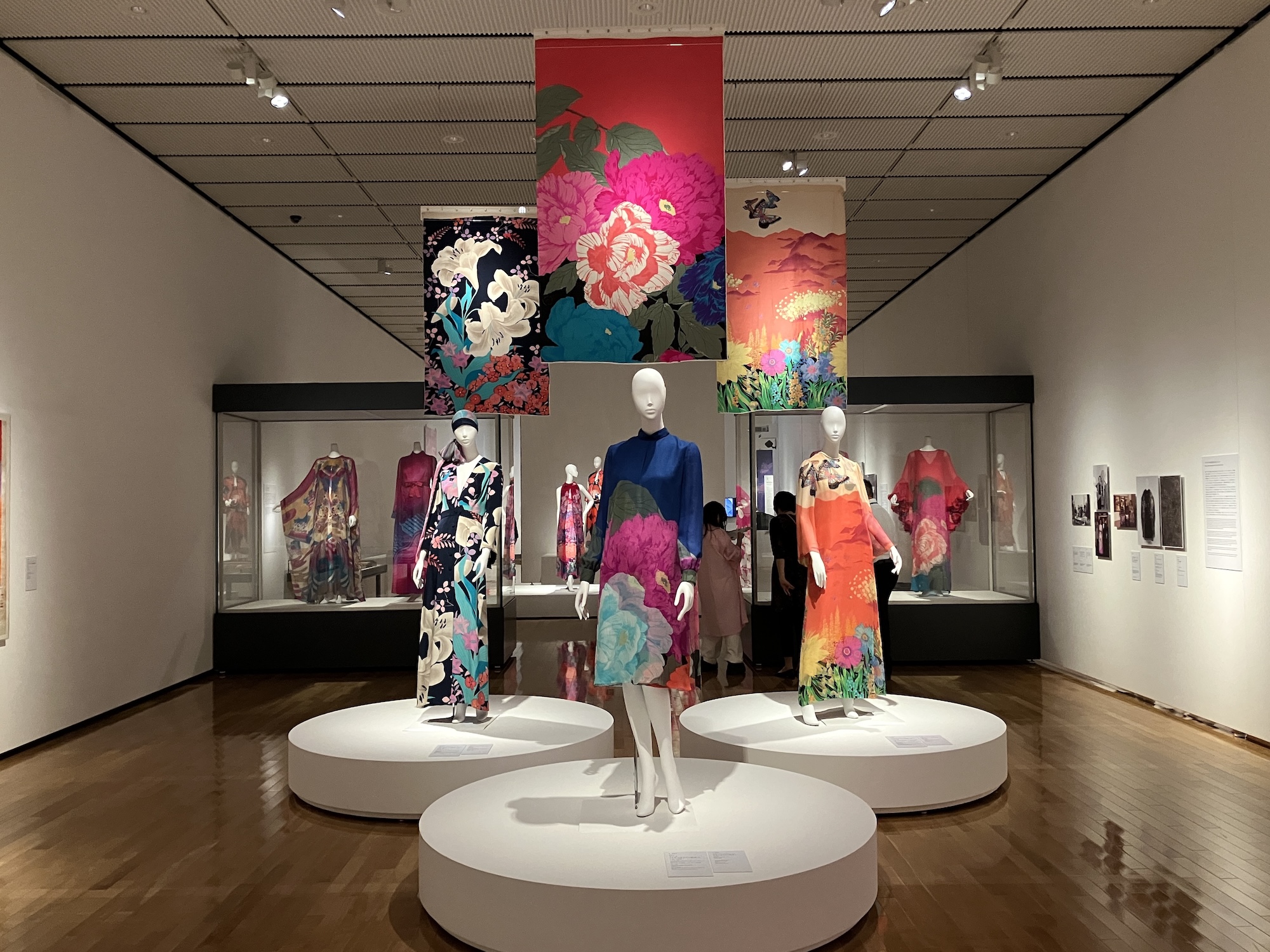 本展では、森のアメリカでの躍進を支えた重要な要素として、テキスタイルデザイナーの松井忠郎(1930〜2009)が手がけた絹地にも注目する。松井は日本の伝統的なモチーフなどを取り入れた多彩な図案を手がけ、手捺染と呼ばれる手法で絹に染め上げた。その絹地はファイナルコレクションまで森の創作を支え続けた。会場では貴重なテキスタイル原画や、布にプリントする前の「絵刷り」を初公開。色鮮やかで独創的なテキスタイルがドレスに生まれ変わるまでの過程に想像を喚起される。