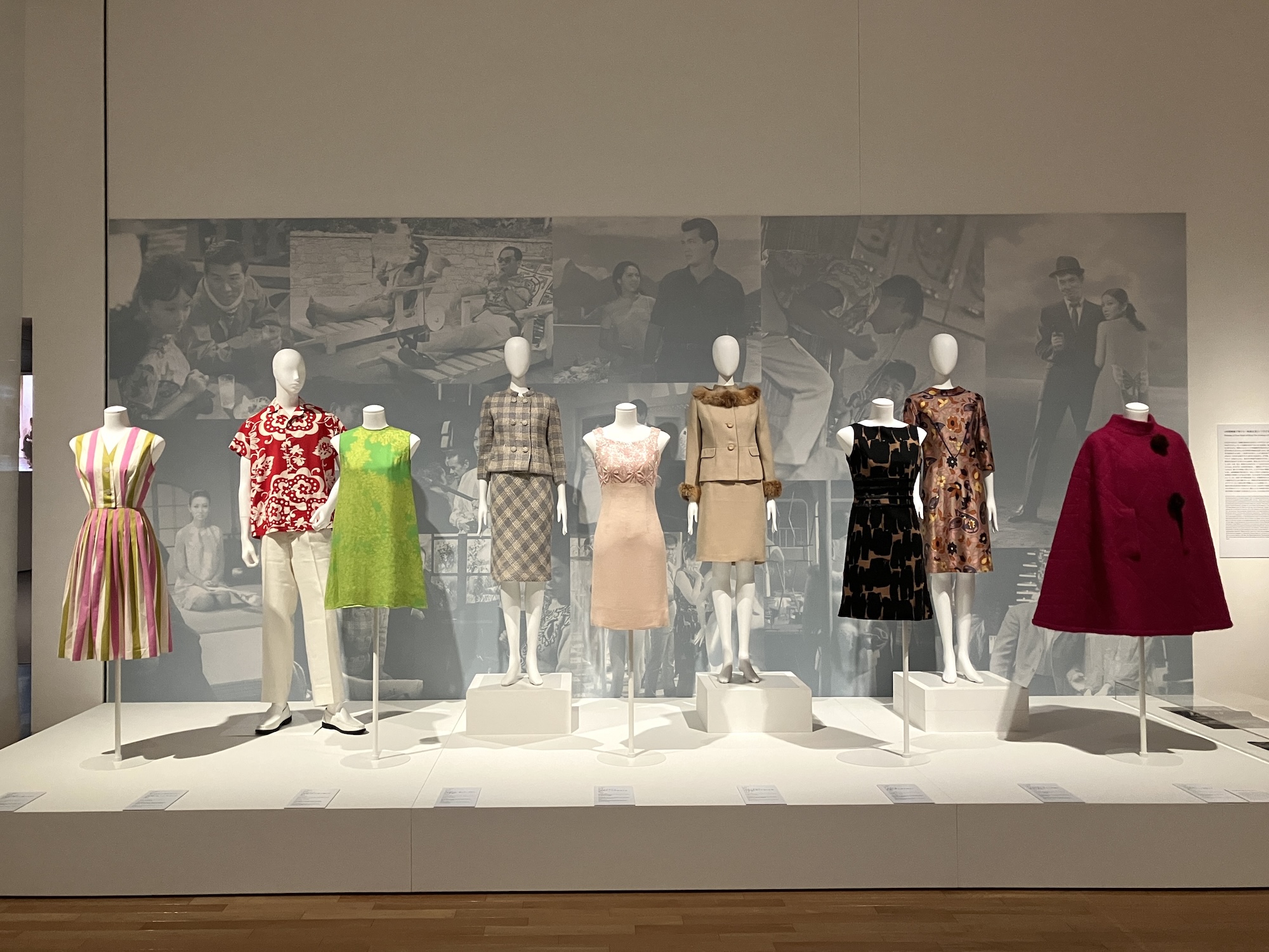 以降、自身が「修行時代」と呼んだ約10年の日々のなかで数百本の映画の衣装を手がけた。会場には『狂った果実』『波止場の鷹』をはじめとする映画の衣装がスチル写真を背景にずらりと並ぶ。当時は映画の衣装担当者をクレジットする習慣がなく、森が関わった映画の全貌は不明だという。