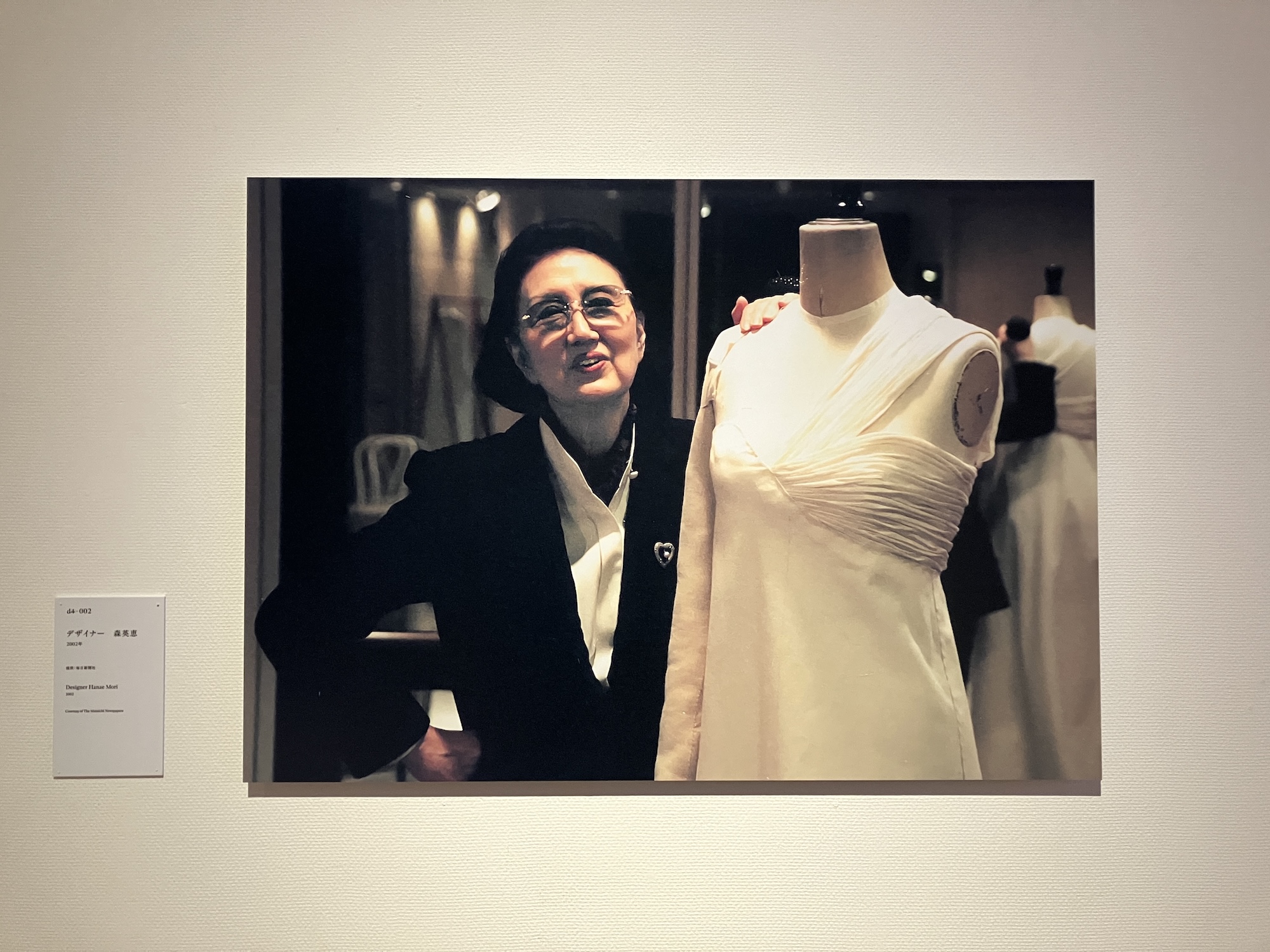 「月」や「花」といった漢字やかな文字が大胆に筆で描かれたモノトーンのドレスや、「折る」「重ねる」といった日本の意匠を取り入れたスーツ、手仕事で精緻にモチーフを描き出したビーズ刺繍のドレス、役者絵をあしらったファイナルコレクションのイヴニングドレス、各シーズンの新作コレクションの最後を飾っていたブライダルドレスなど、森がライフワークとして取り組んだ挑戦の軌跡を一望できる。