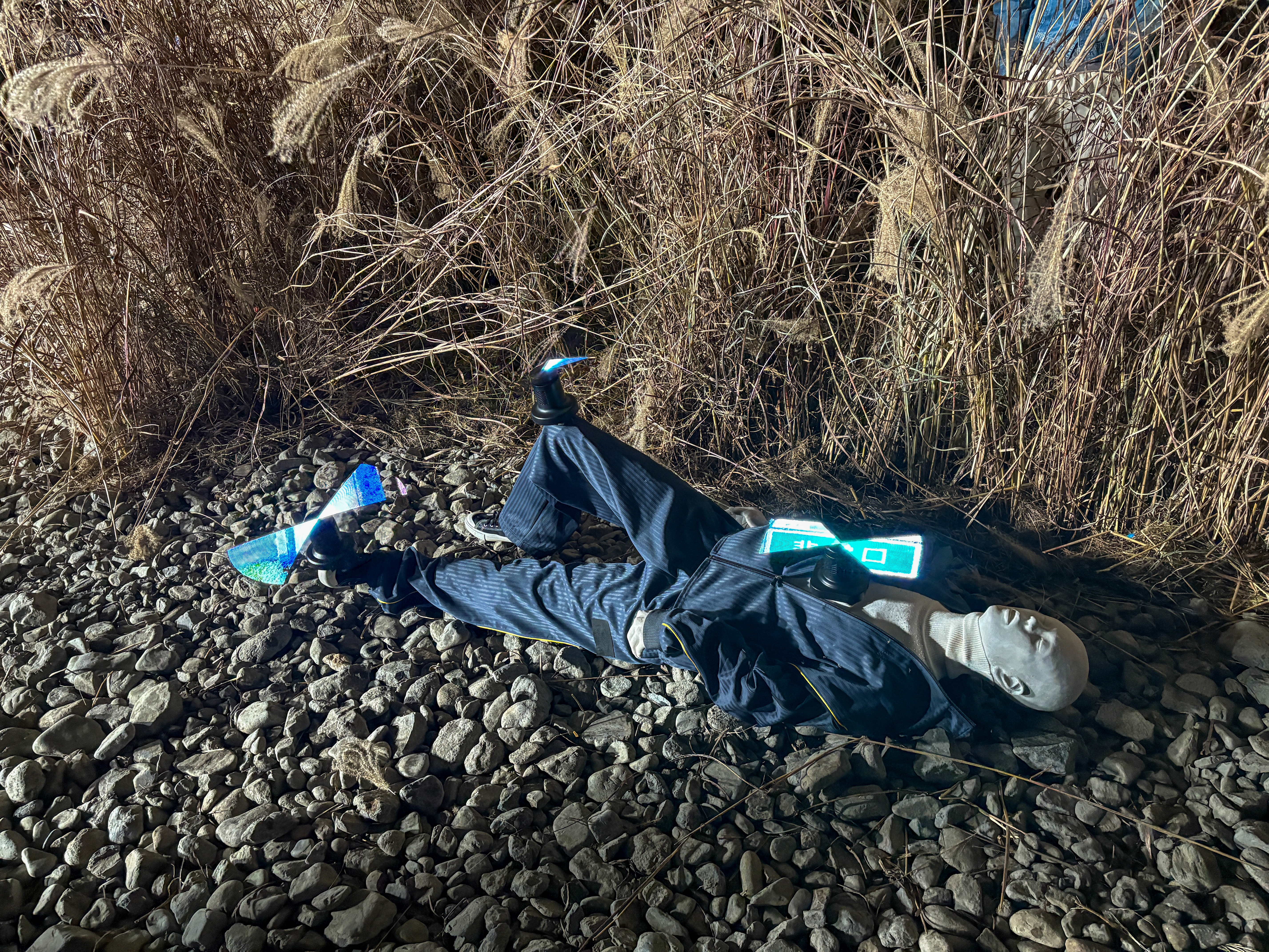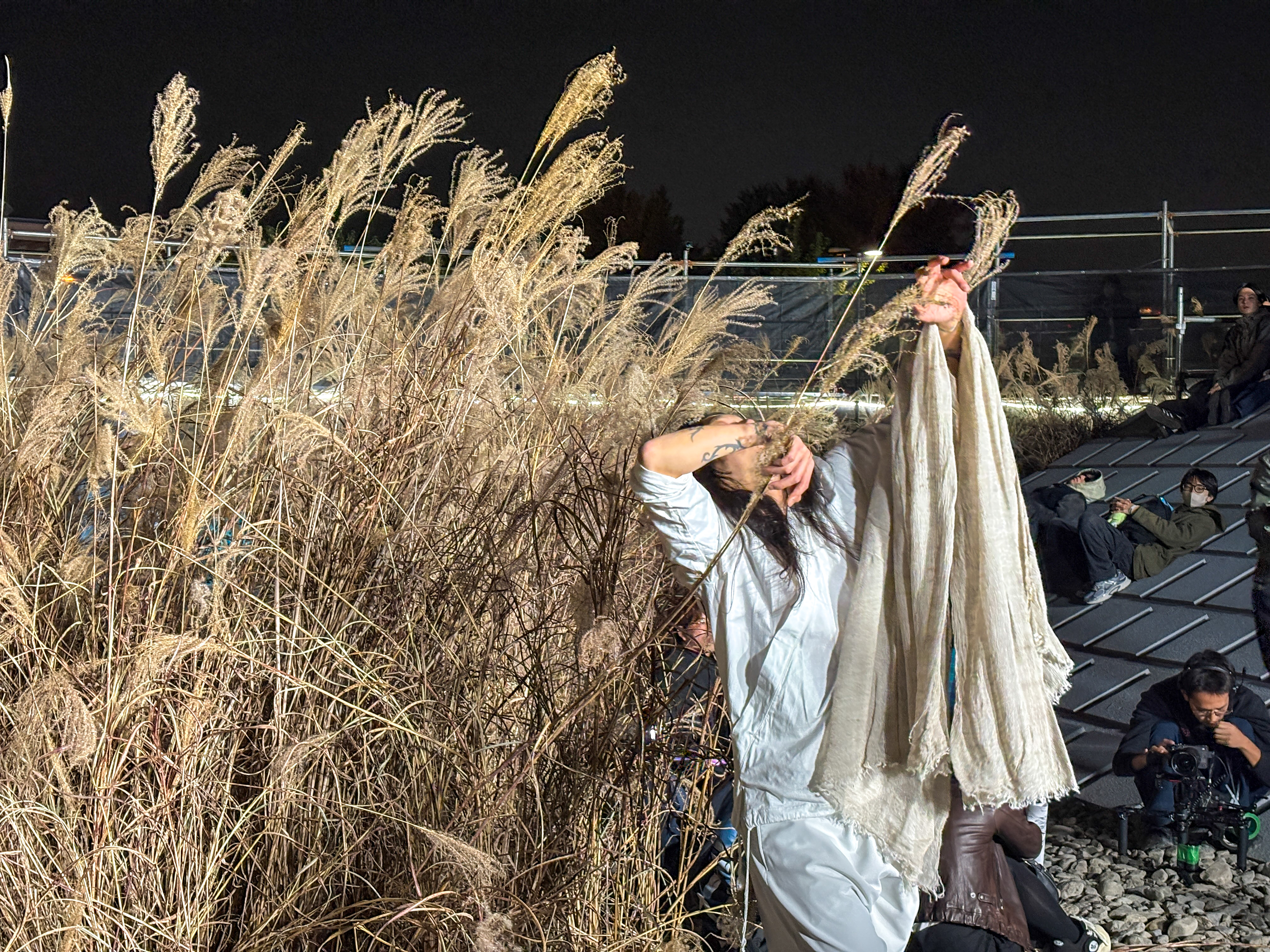インスタレーションの中には、プロジェクトに初期から携わっている彫刻家、横手太紀や、クィア、非西洋中心主義をテーマに活動を行う磯村暖、海野林太郎によるキネティックな彫刻作品も配されている。筆者が訪れた初日(7日)の夜にはすでに多くの人が集結し、さながらフェスのような雰囲気に。訪れた人びとは、すすき原を探索したり、作品を興味深げに見つめたり、土手に寝そべって目当てのパフォーマンスを待っていたりと、おもいおもいのスタイルで時間を過ごしていた。