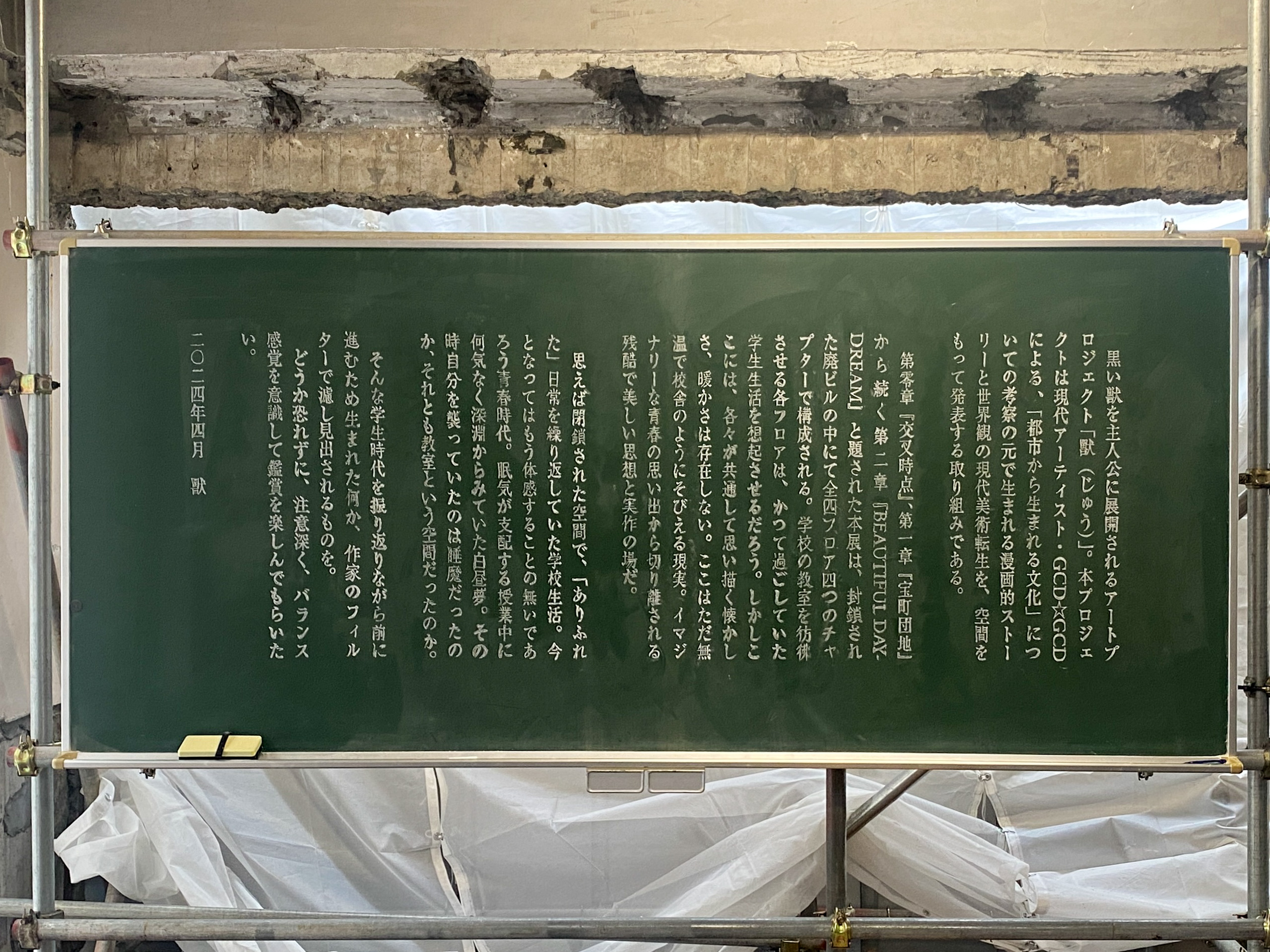 「獸」はGCD☆GCDが2021年から主宰する、現代アートの展示とライブパフォーマンスを組み合わせたアートプロジェクト。映像作家の太郎とともに制作した映像作品が毎回発表され、東京の青年をモチーフにした「黒い獸」をめぐる物語が、1年ごとに展開される。