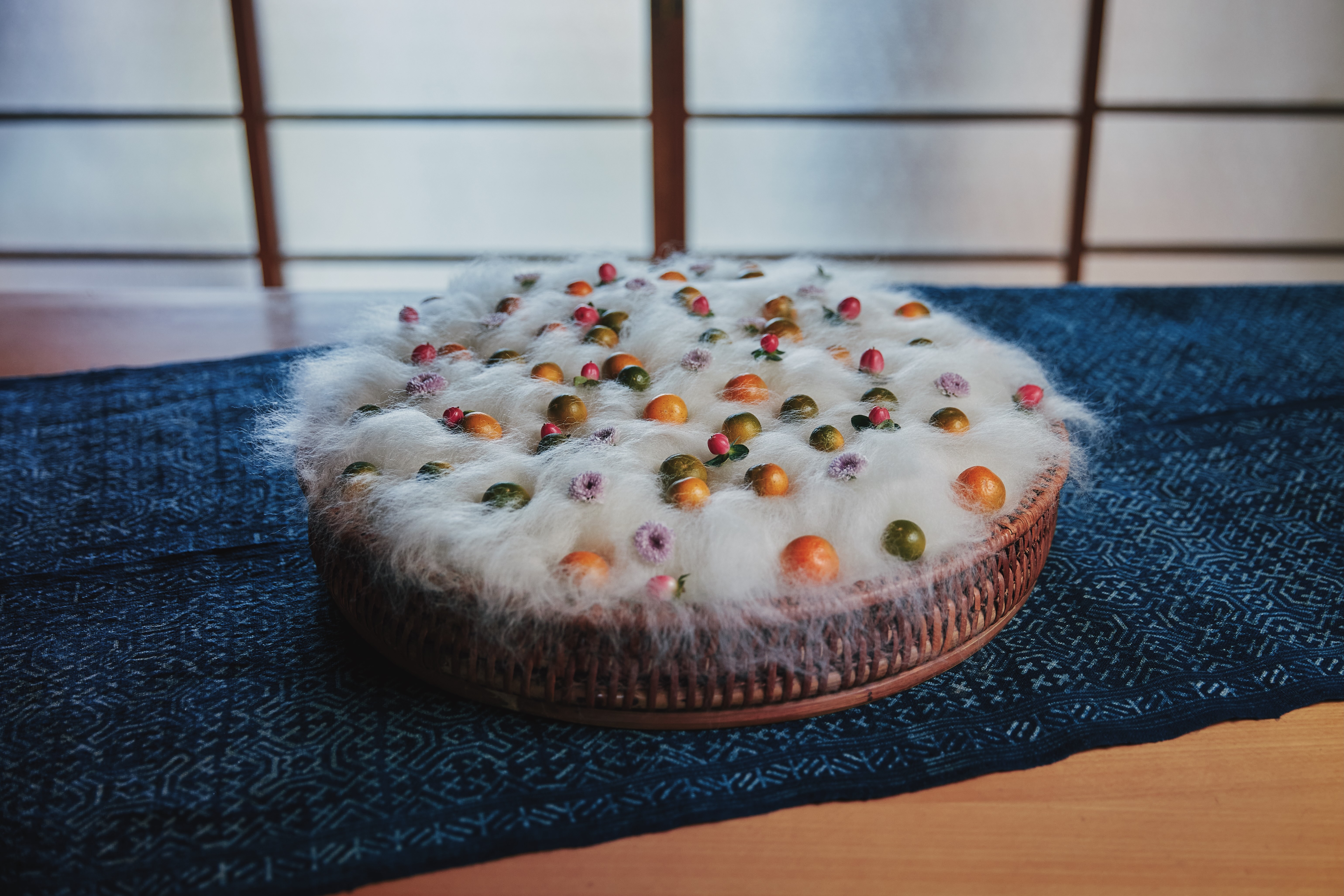 このときは雪がなかったので、代わりに羊毛をちぎって、細かくして。ふわっとしたところに、上から物が落ちてきたら、沈み込むじゃないですか。その重みをそのまま表現しようと、きんかんを落としました。雪も上から物を落とすと穴が開きますし、そういうのは人為的なことだけども、ちょっと面白いですよね。以前、アニマルセラピーのバスツアーで、能登町の施設を訪問し、羊たちと遊んだことがあります。その元気だったときのことを思い起こしながら作りました。