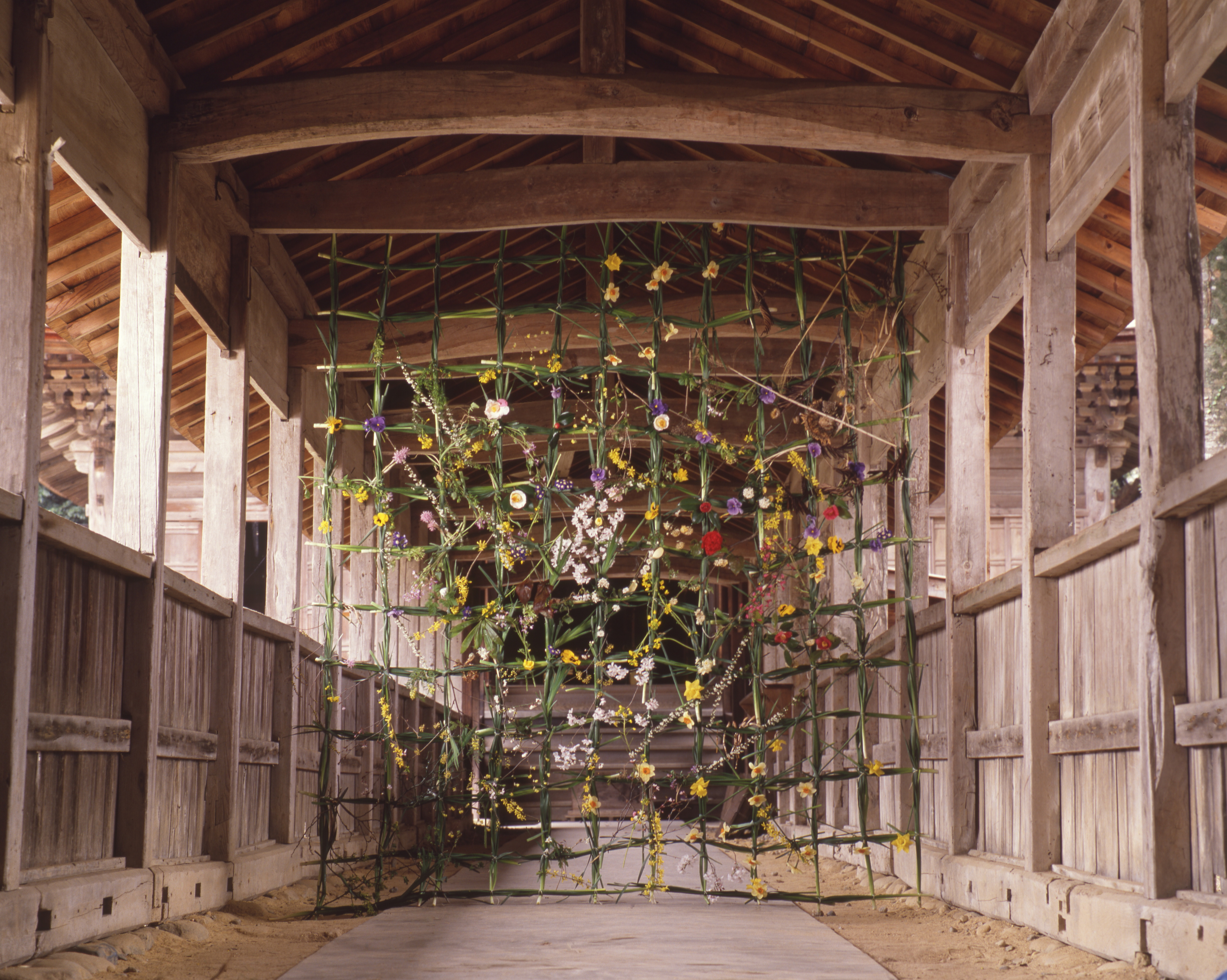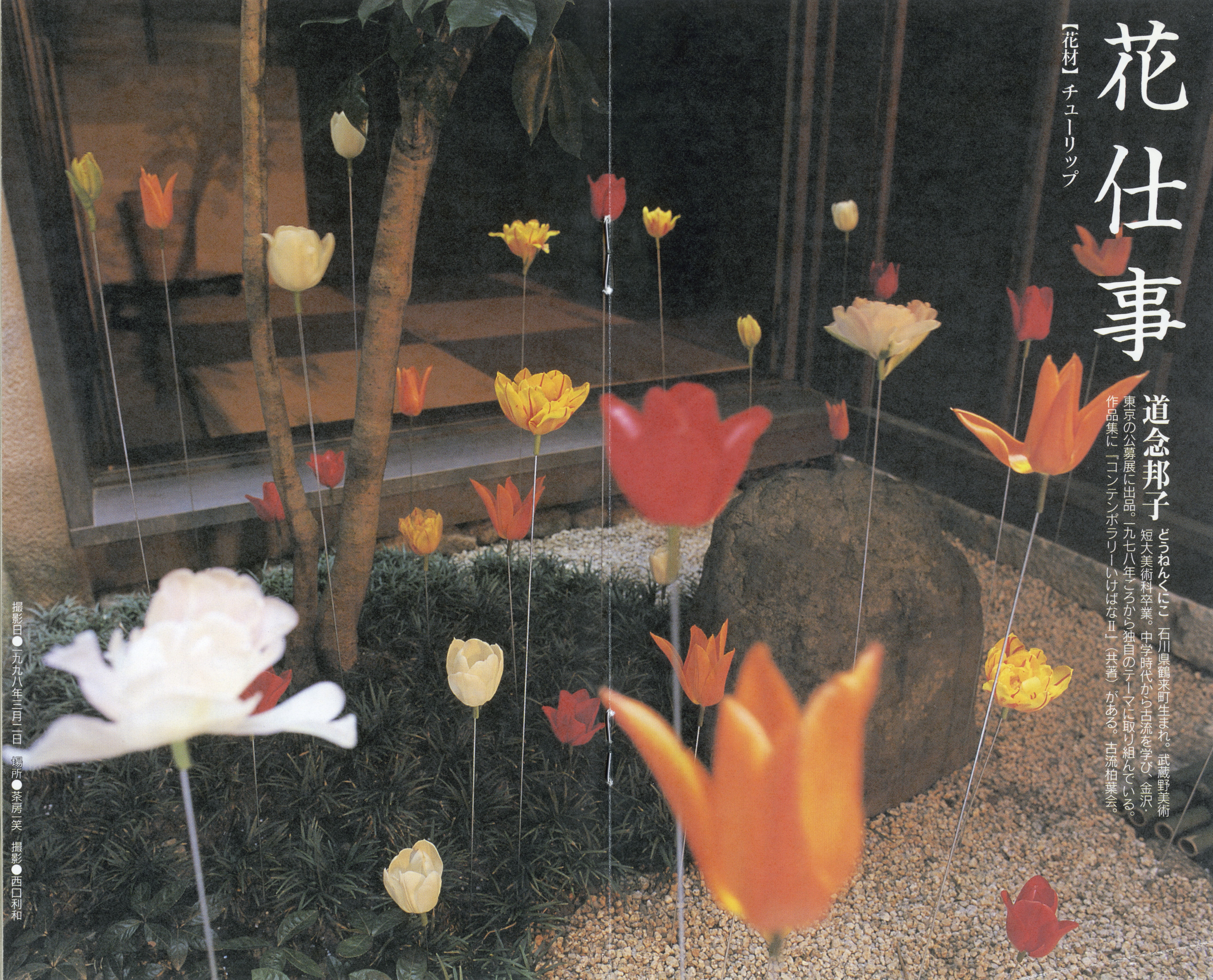 《花仕事 一笑》(1998)はお茶屋さんのアンテナショップの茶房の中庭で、ワイヤーにチューリップの花先だけ挿しています。チューリップって、お日様のほうを向いてしなるんですね。暖かいほうにばぁーっと花開く。私はいわゆる伝統的ないけばなを習ってきたのですが、そのなかでは、チューリップの形を整えるために、茎の中にワイヤーを通して、そしてそのワイヤーを曲げることで、伝統的な形に従わせるということをしていました。ただ、ワイヤーが届いているところまでは人工的な形を作れるけれど、ワイヤーが届かない茎の上部から花先までのあいだはやっぱり動いたりするんです。どうしても形が崩れる。それでね、どうしてこんな無理なことをするのかな?という疑問が湧いてきた。結果的に、もういっそのことワイヤーに花だけいけるというこの作品を生んだんです。