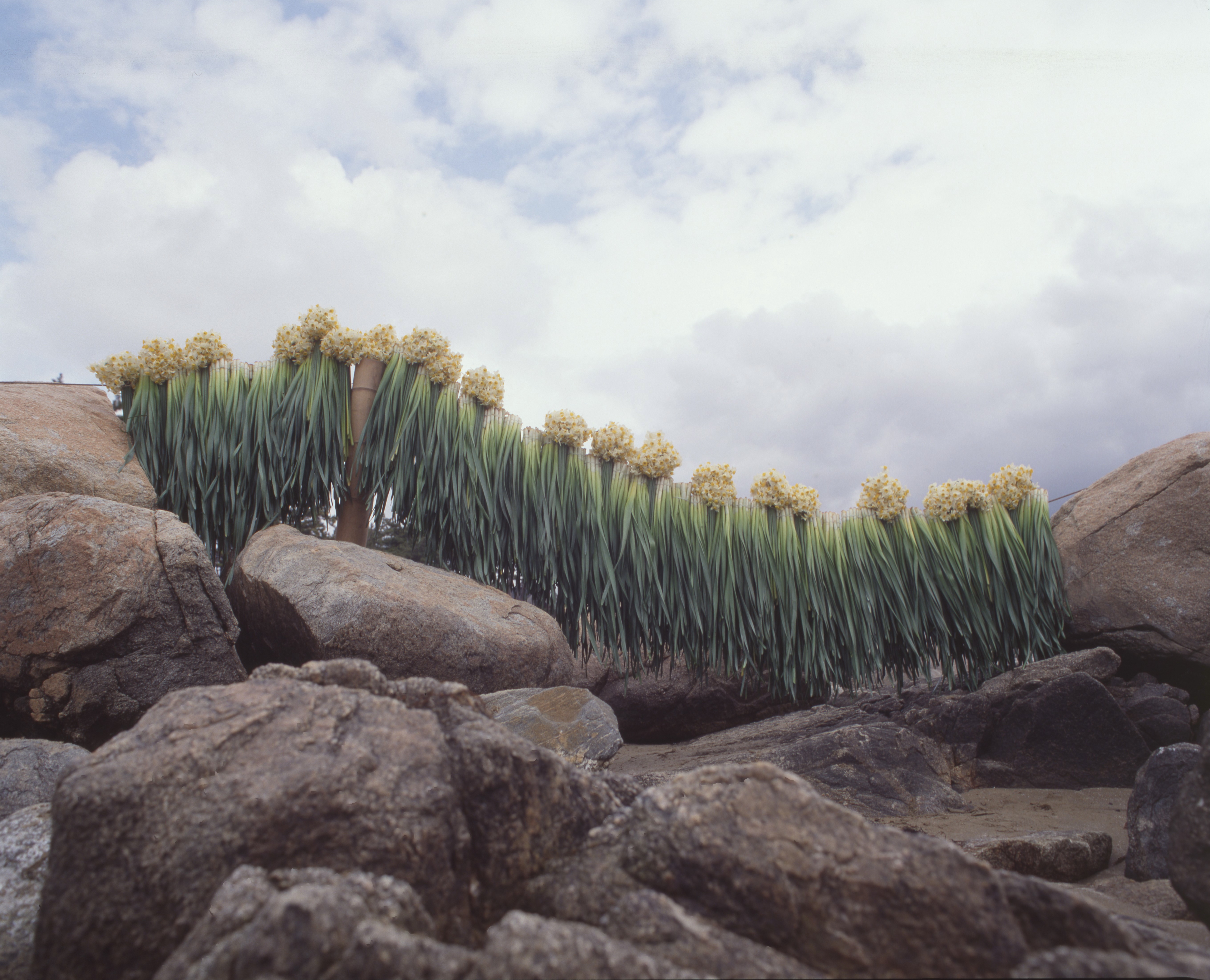 道念邦子さんの作品を初めて知ったのは、金沢21世紀美術館の「開館20周年記念 すべてのものとダンスを踊って―共感のエコロジー」(2024〜25)の内覧会だった。1本の竹を丸ごと使い、長さを切り揃えて複数のキューブを作った《孟宗竹 キューブ》(1988/2024)、そして会場のパネルで写真を見た《房咲水仙》(1989)。その美しく凜とした姿に、一目で強く惹かれた。