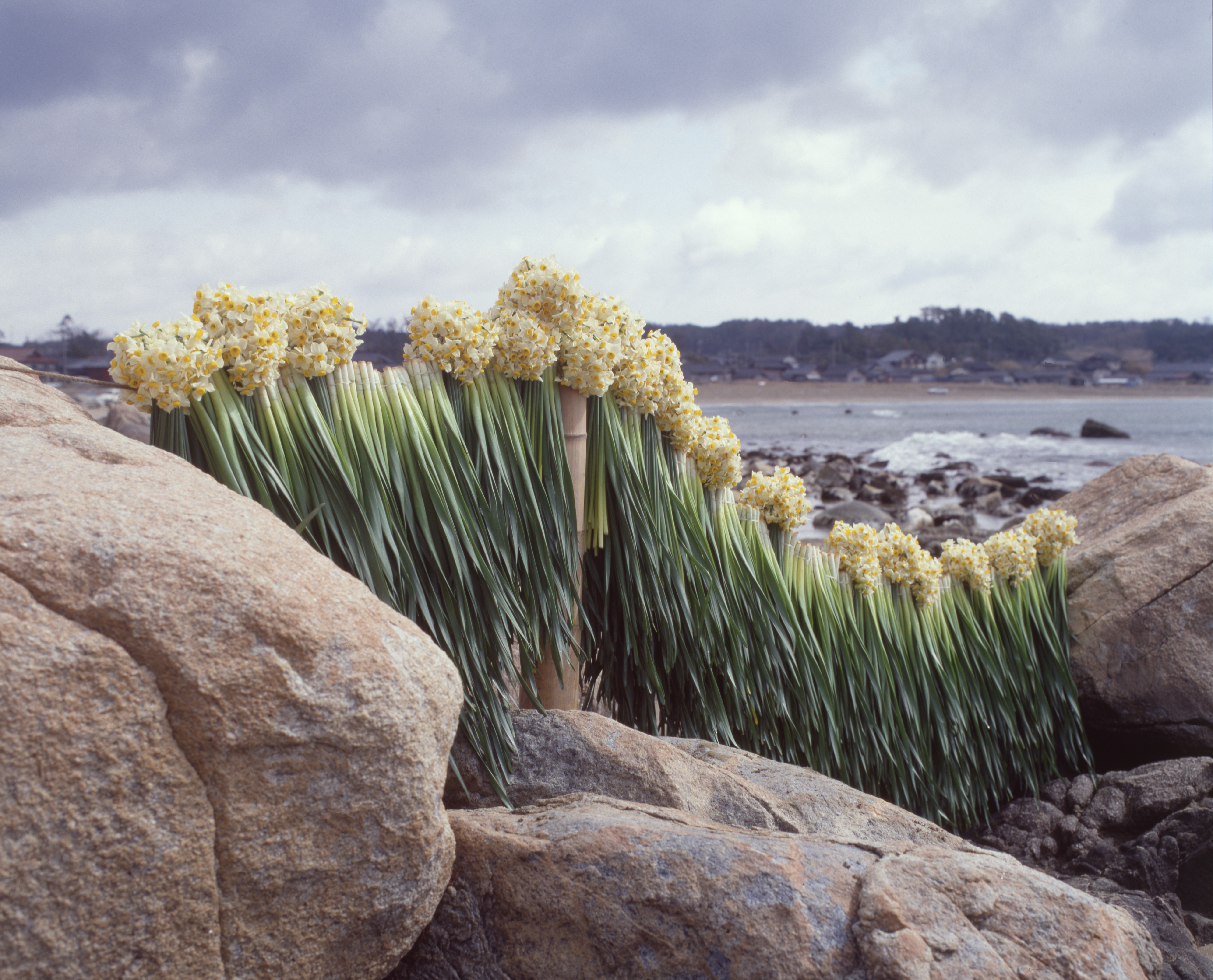 《房咲水仙》(1989)の水仙は、越前(福井県)の海岸沿いの崖地に自生していた水仙なんです。冬場の潮風に当たるせいか、とっても強いんです。茎を切るとトロトロと粘液が出てくるぐらい強い花なので、水なしの状態でも、こうやって長時間扱うことができました。越前で切っていただいたものを能登(石川県)の柴垣海岸へと運んでいけました。そこは私が幼い頃、両親と一緒に海水浴に行った遠浅の海岸です。本当に水も綺麗で、岩も綺麗。この空は北陸の空ですね。写真を見るとぼんやりして見えるかもしれないけれど、これが北陸特有の冬の空なんです。