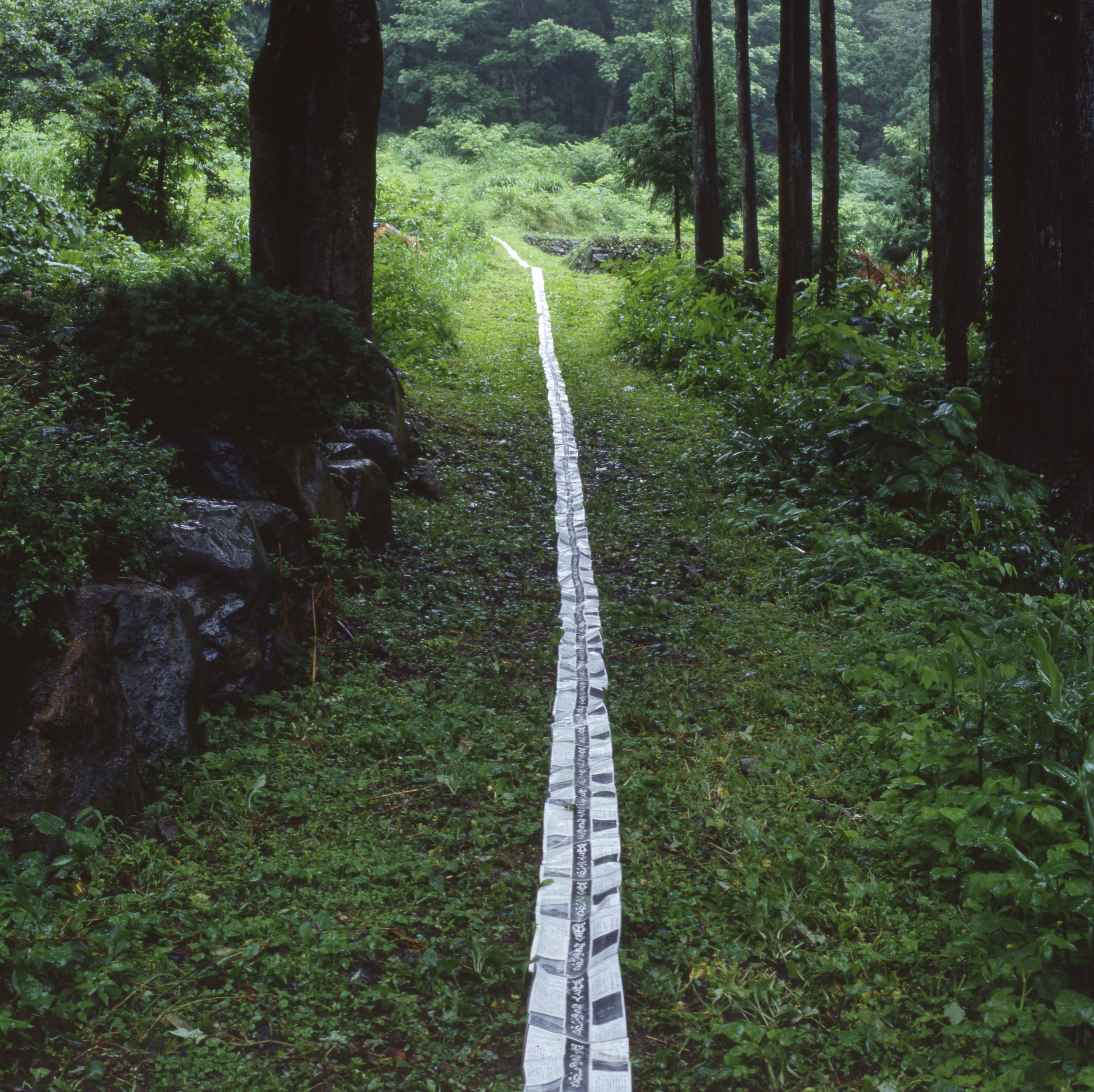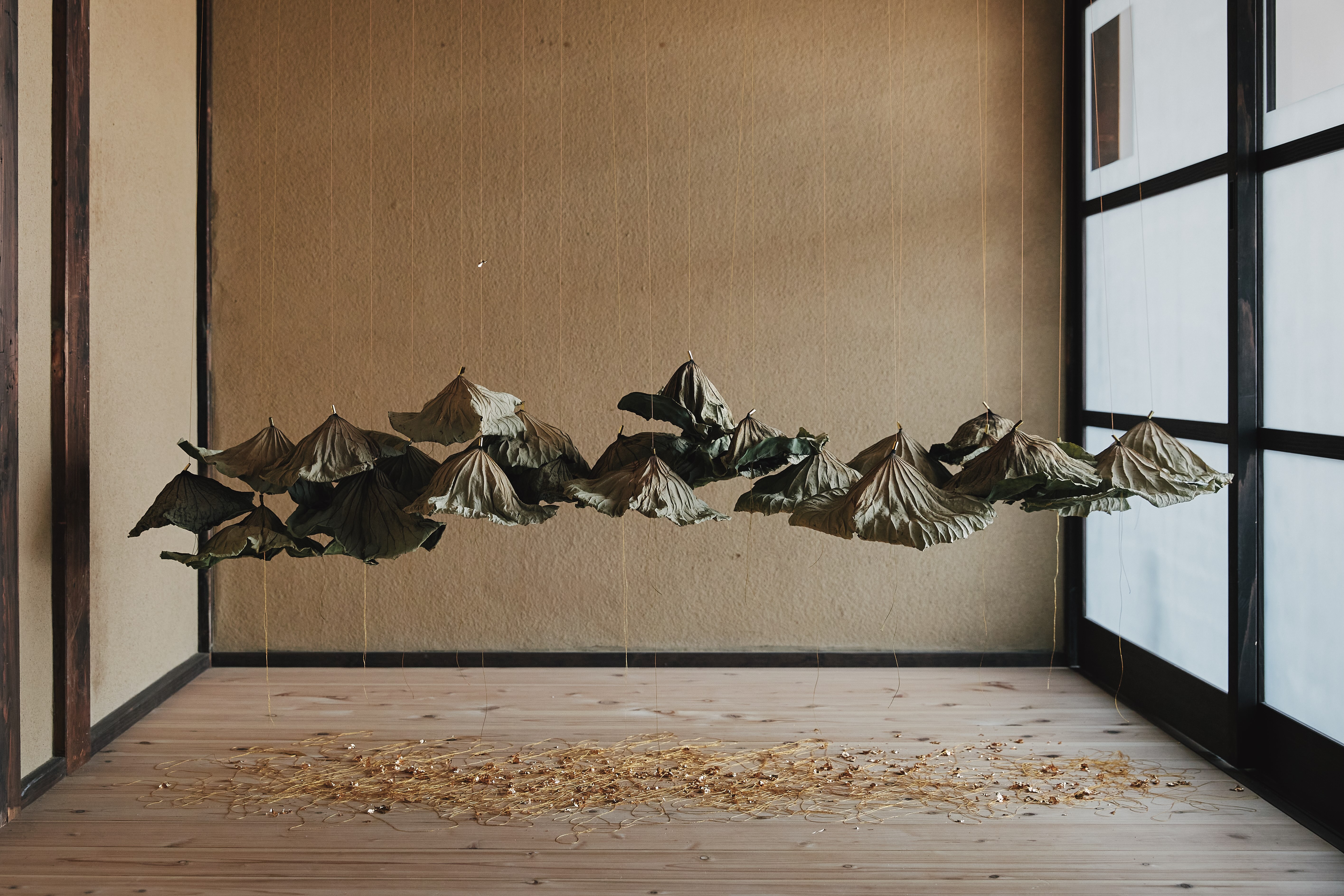 同時に、キュレーターの長谷川祐子さんから、作家は金沢で活動する80歳の華道家で、美術館で展示するのは今回が初めてだと聞き、驚いた。また同日、金沢市内の空き家を使ったグループ展「消えつつ 生まれつつ あるところ」展(キュレーション:中森あかね、清水冴)でも道念さんの作品を見る機会を得、会場で購入した作品集『花 道念邦子』(2024)を開くと、“いけばな”のイメージを超えるようないけばなの数々に、ますます魅了された。その作品は、清廉で、意表をつく驚きに満ちている。そして森をわけ行って歩き、花と向き合って命を交わし合った、自然界と道念さんとの深い交歓の軌跡だった。
