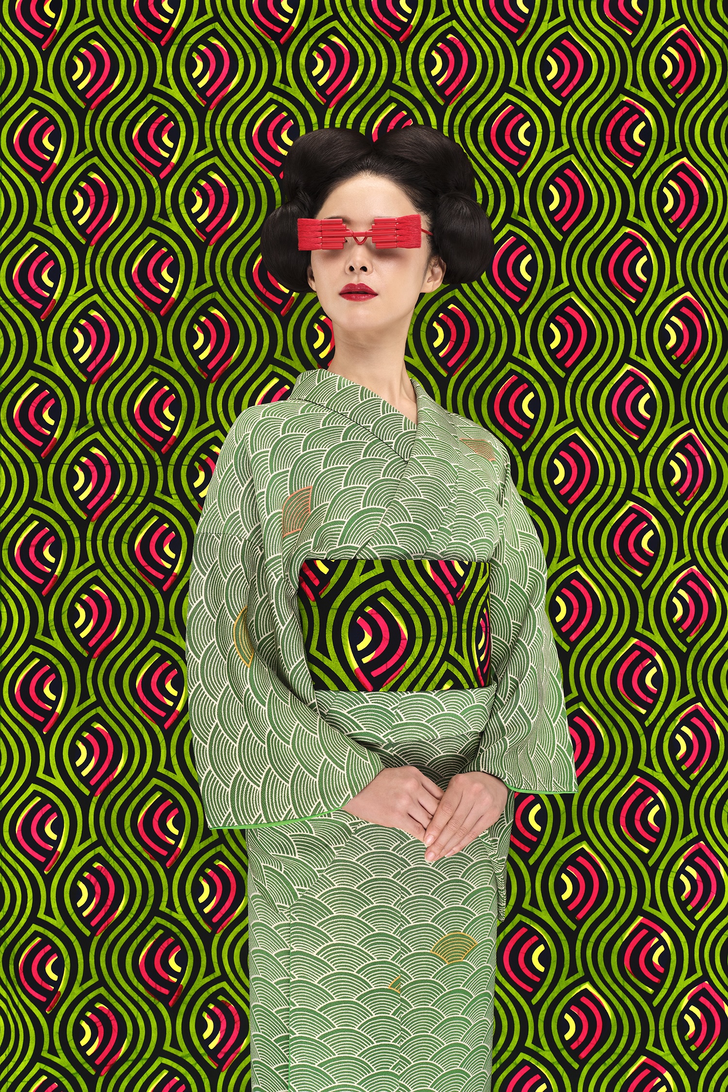ケニアのダンディウェ・ムリウは、鮮烈な色彩とパターンで女性像を再構築する作家。今回は着物の要素も取り入れ、日本とアフリカの視覚文化を交差させている。