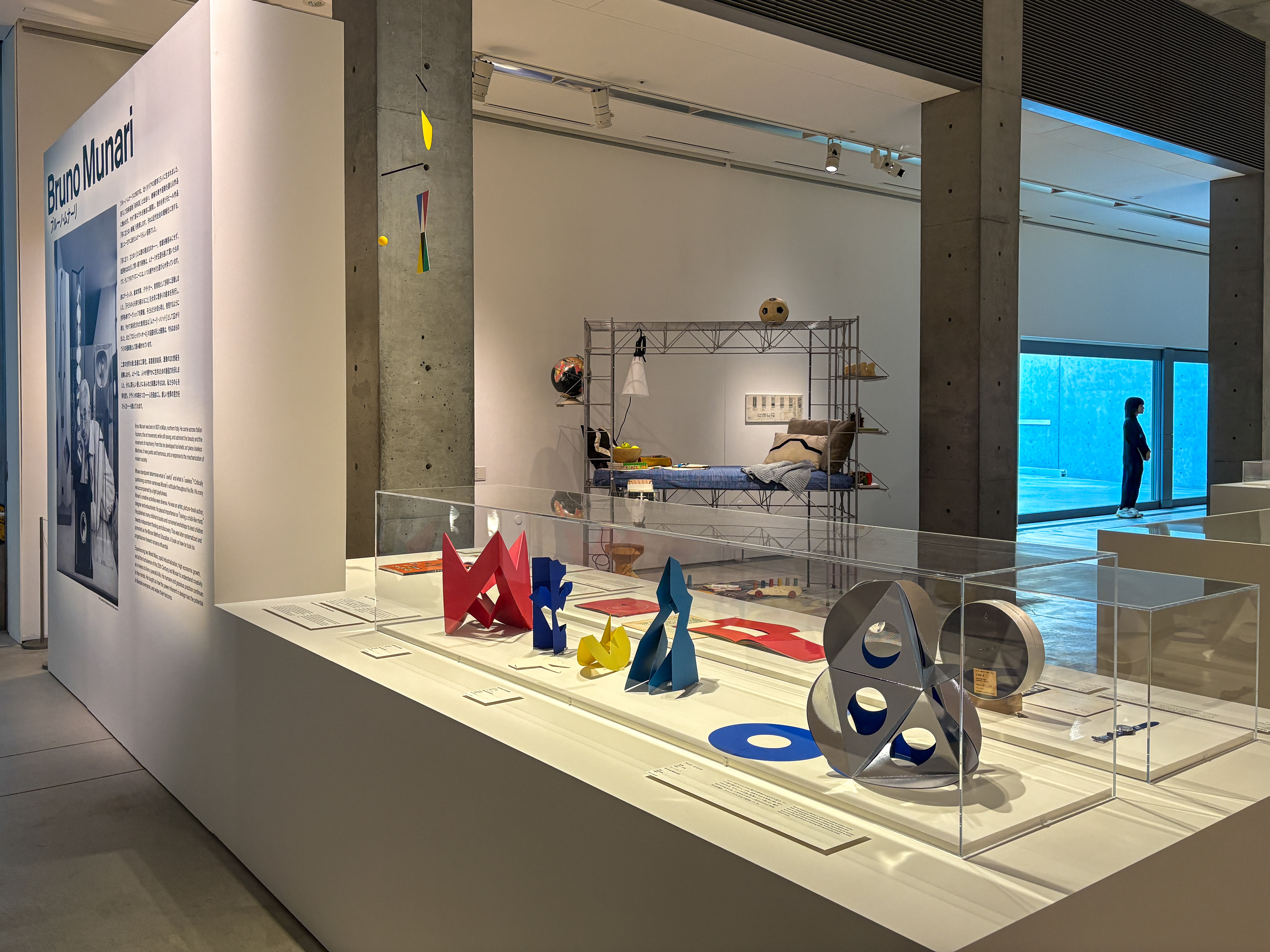 展示室の手前に配されているのは、ブルーノ・ムナーリのセクション。ムナーリはキャリアの初期、イタリアの前衛芸術運動「未来派」の一員として活動しており、機械美や運動、速度を讃える作品に触れていた。そうした影響下で制作されたモビール作品「役に立たない機械」や「旅行のための彫刻」は、一部の特権的な人びとのものだった芸術をより多くの人に届ける試みとして高く評価されている。