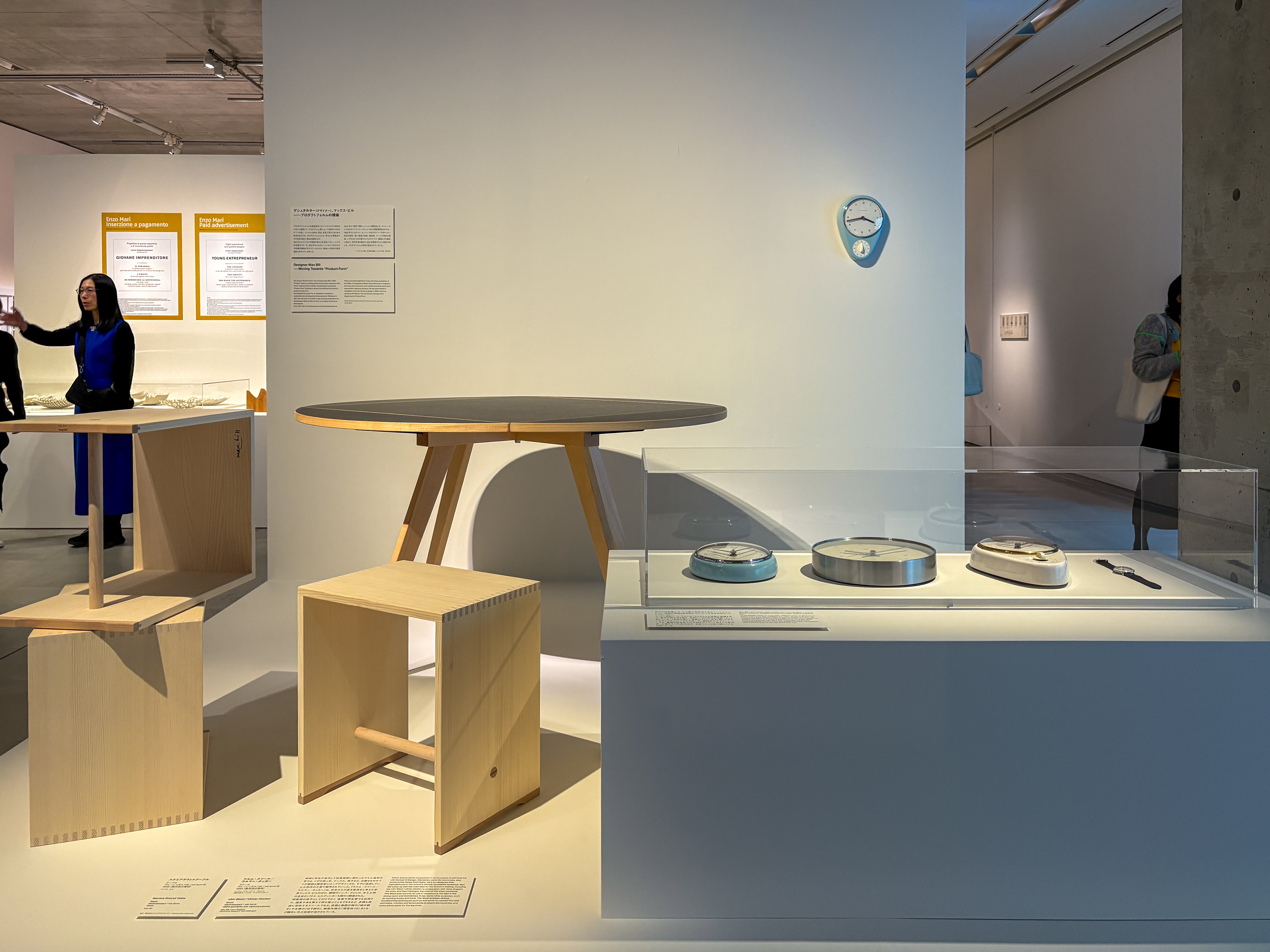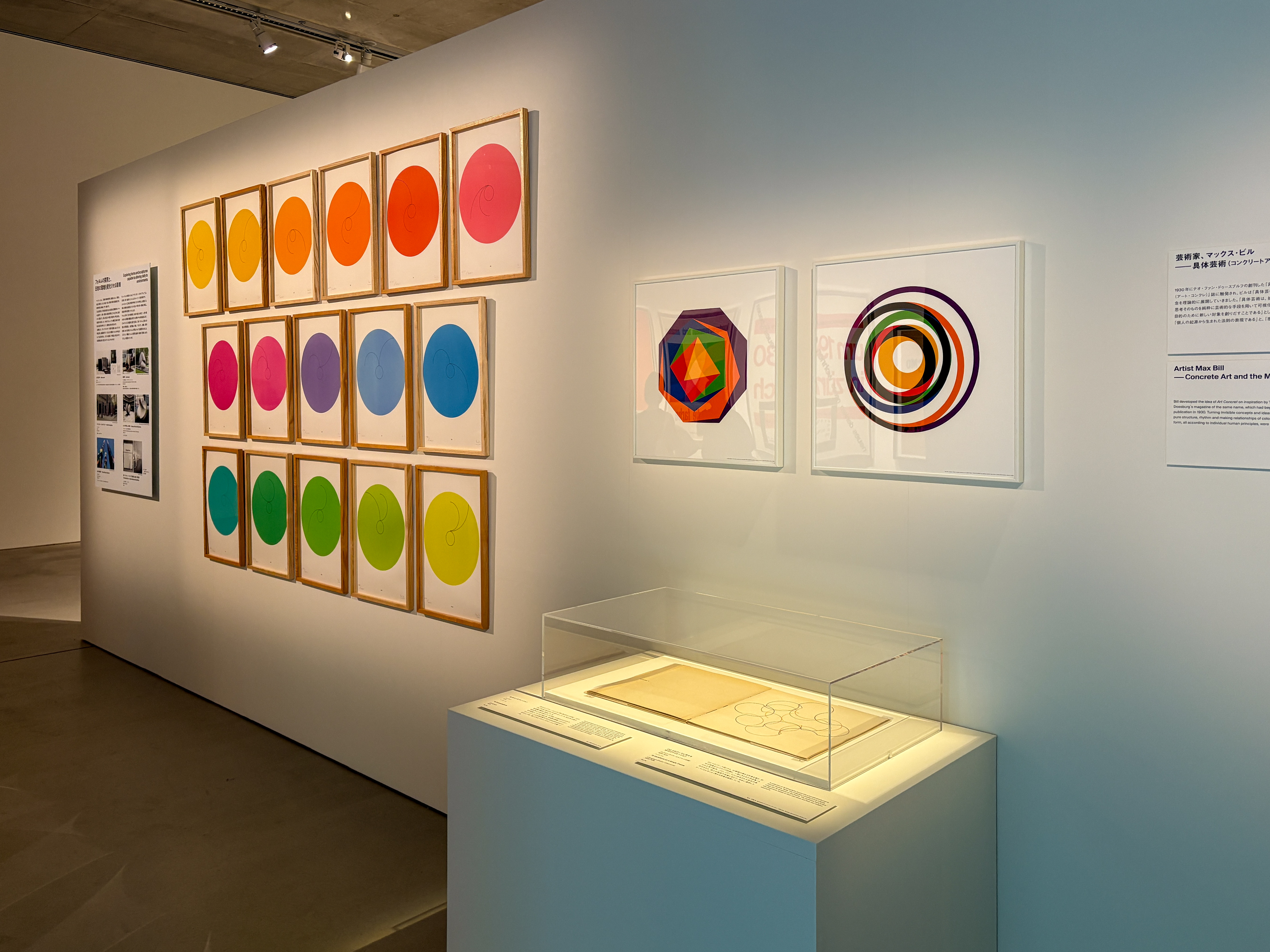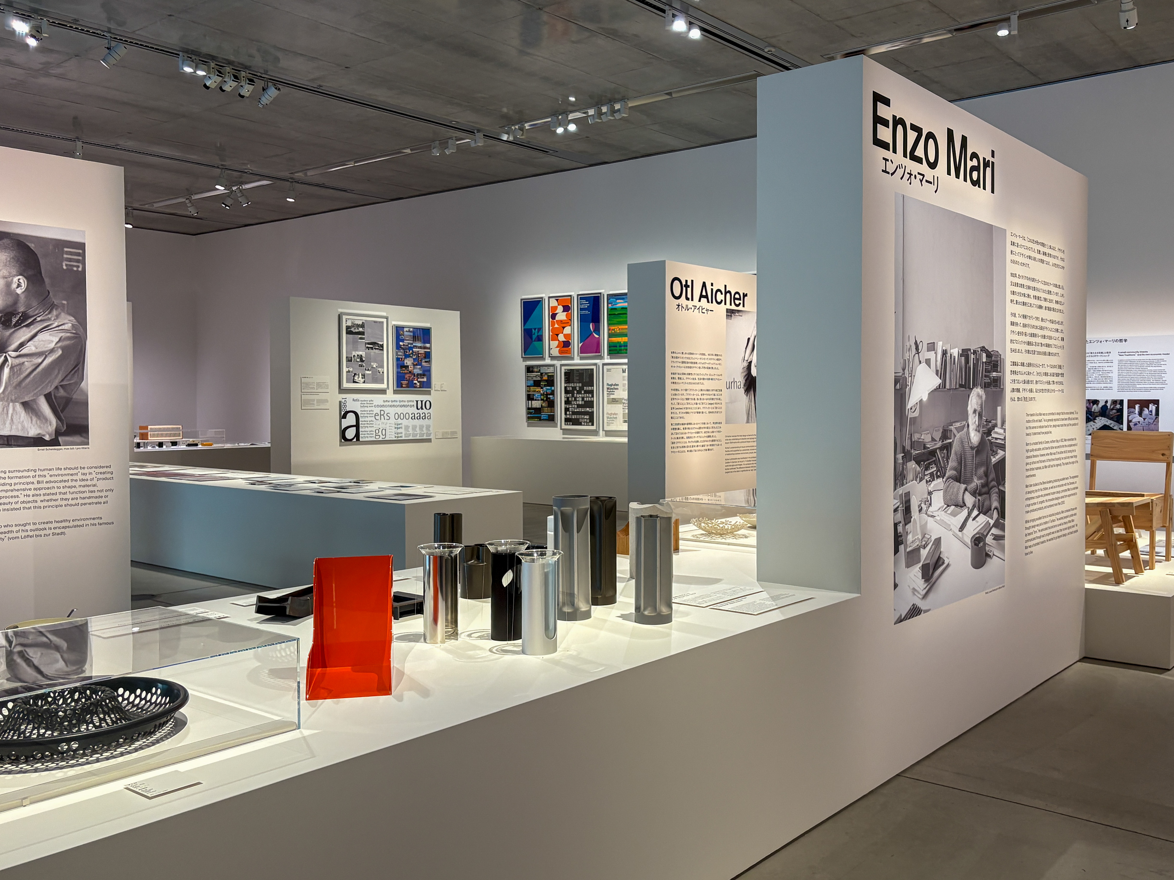 最後に紹介するマックス・ビルは、近代ドイツにおける建築、アート、デザインの礎を築いた学校・バウハウスの出身。戦後、アイヒャーらとともに創立したヴルム造形大学は、バウハウスの近代デザイン運動を正統に引き継ぐ教育機関であり、ビルはその初代校長を務めていた。日本におけるデザイン学の礎を築いた向井周太郎は、同校の元生徒であり、本展では両者の関わりについても触れられている。