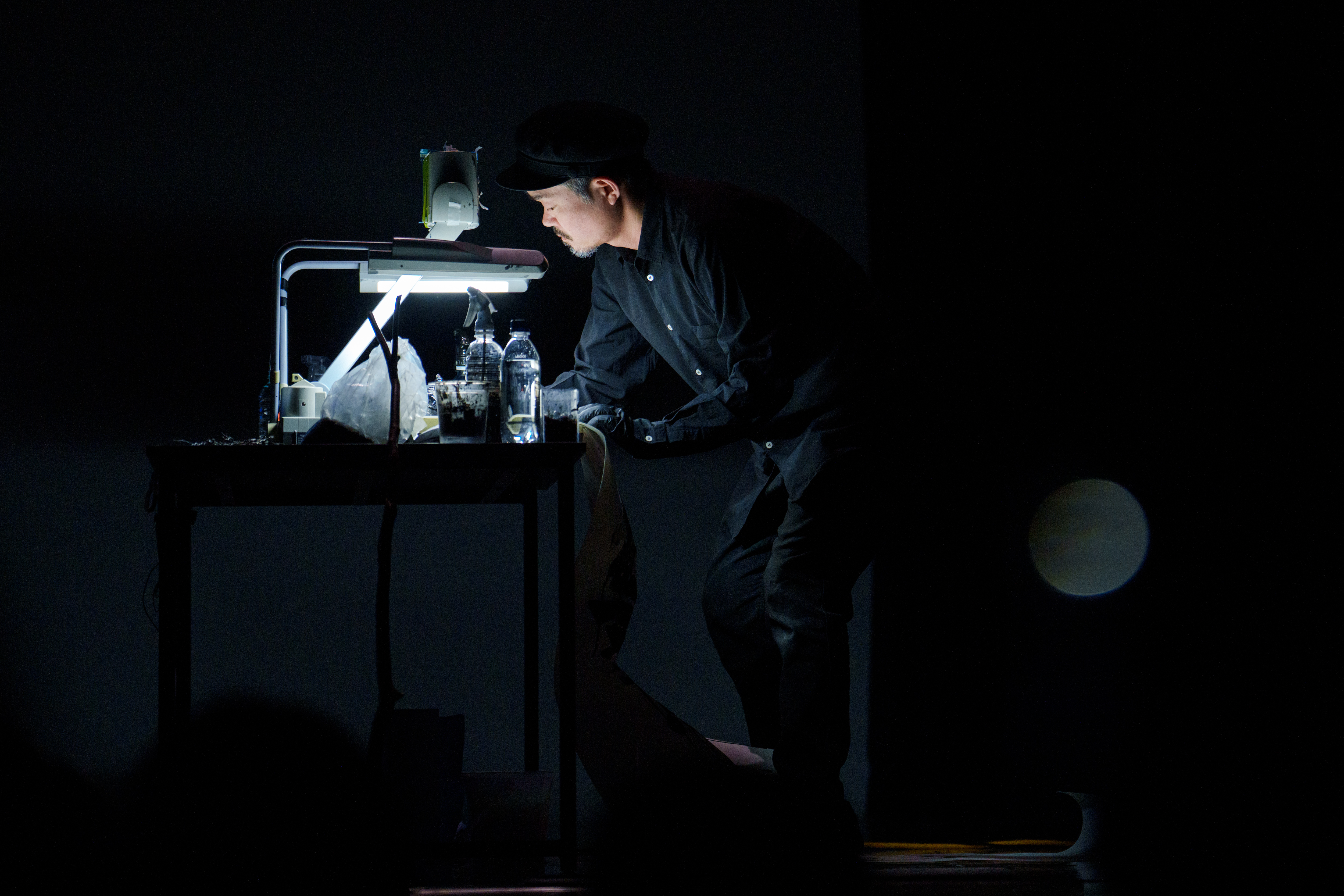 いっぽう、鈴木ヒラクは、どんぐり、強炭酸水、砂などの素材を用いて紙に線と形を描いた。青い絵具には港の海や宇宙のイメージを、砂にはサヘル・ローズが触れた“砂漠のバラ”への応答を込めたと説明した。パフォーマンス後には、「思い通りにはいかないが、生きている感覚があった。対話から生まれる時間には、そのための“場”が必要で、m〜mはその場になっていくと思う」と語った。