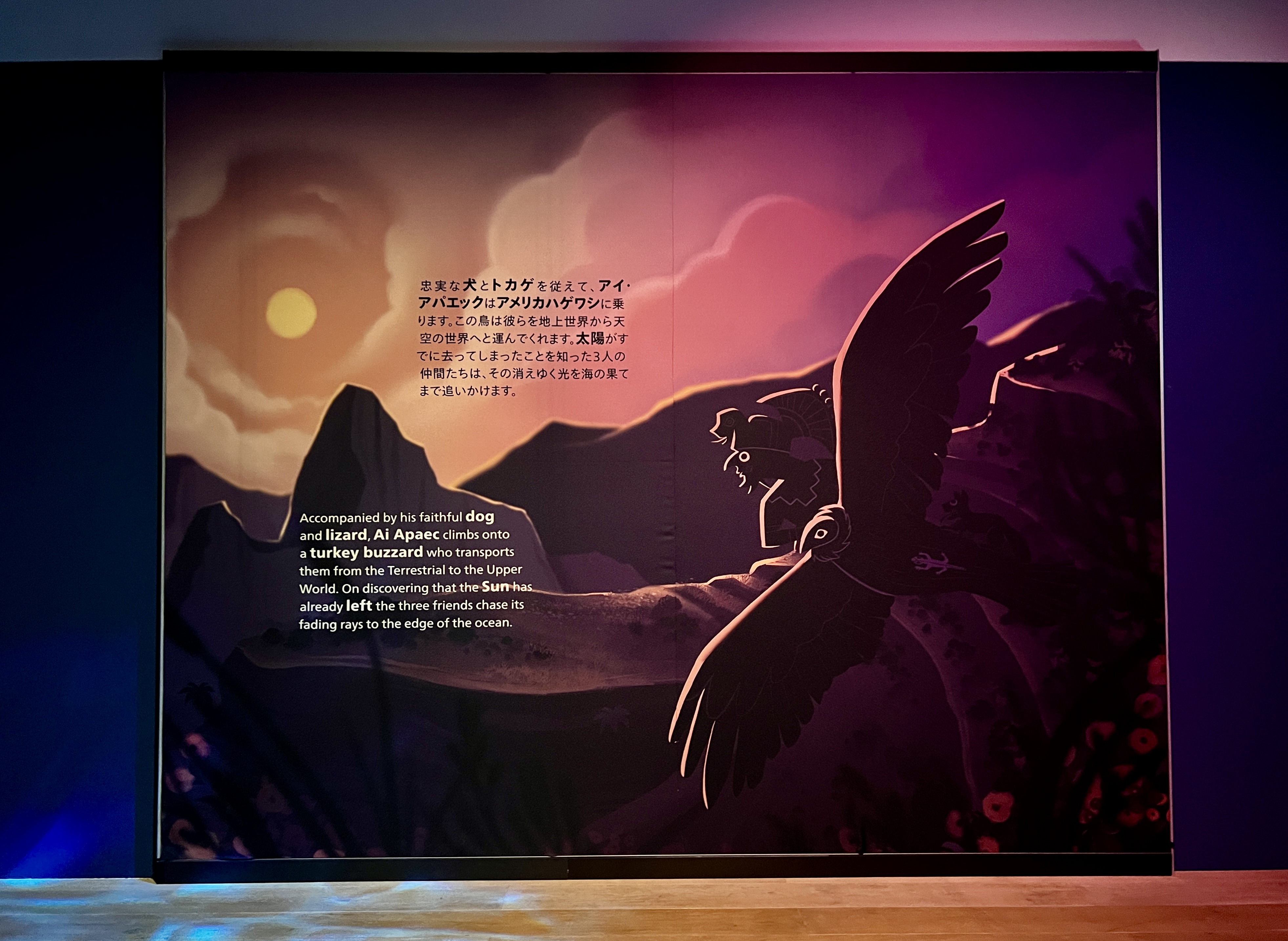 アイ・アパエックは3つの世界を旅し、様々な課題に直面。ときに忠実な犬やトカゲを従えアメリカハゲワシに乗って天空の世界を目指し、ときに超人的な力を持つウニやフグ、カニなどと戦い、勝利して力を得る。本展では様々な動物に姿を変えたアイ・アパエックの姿を見ることができる。