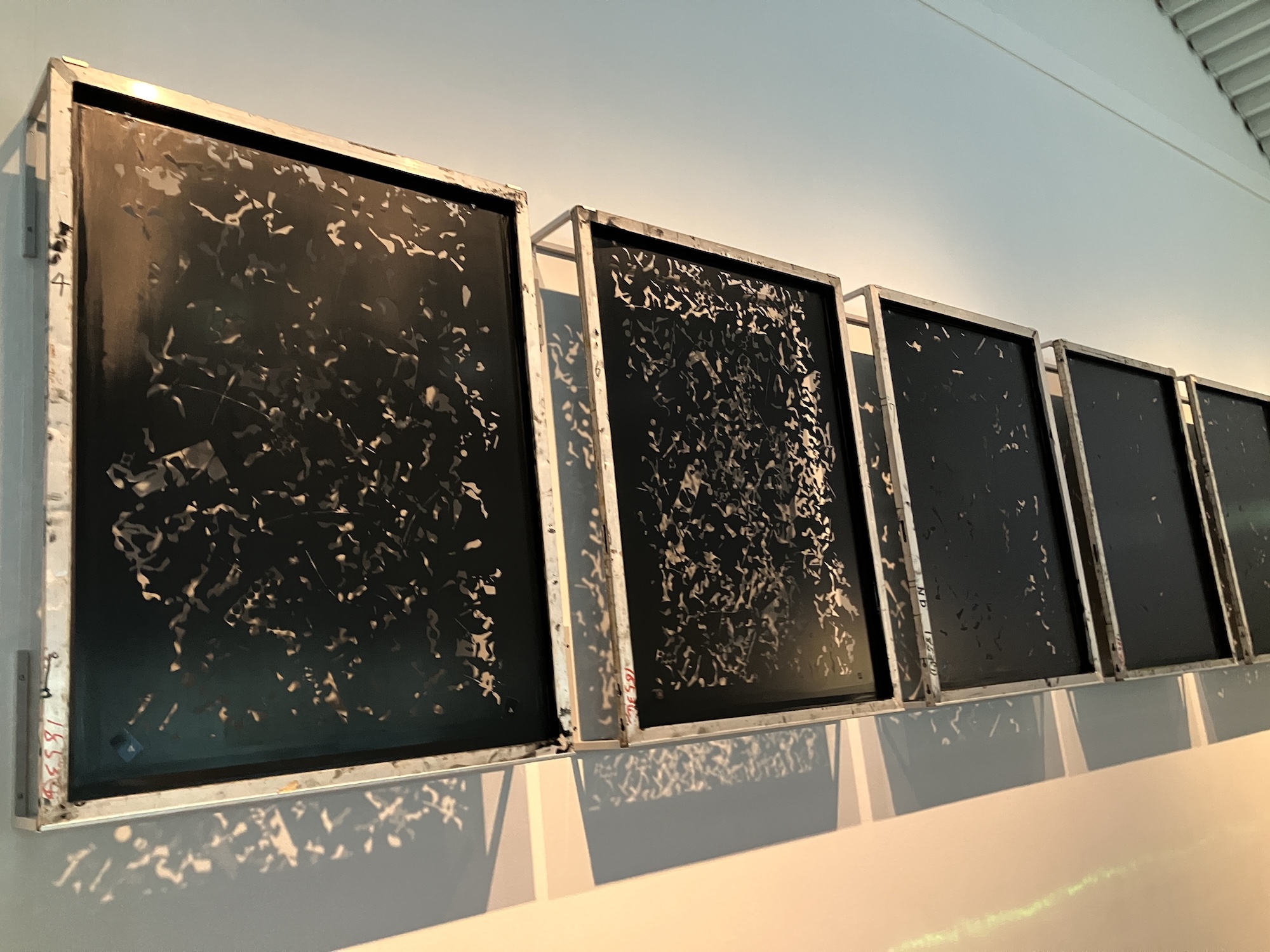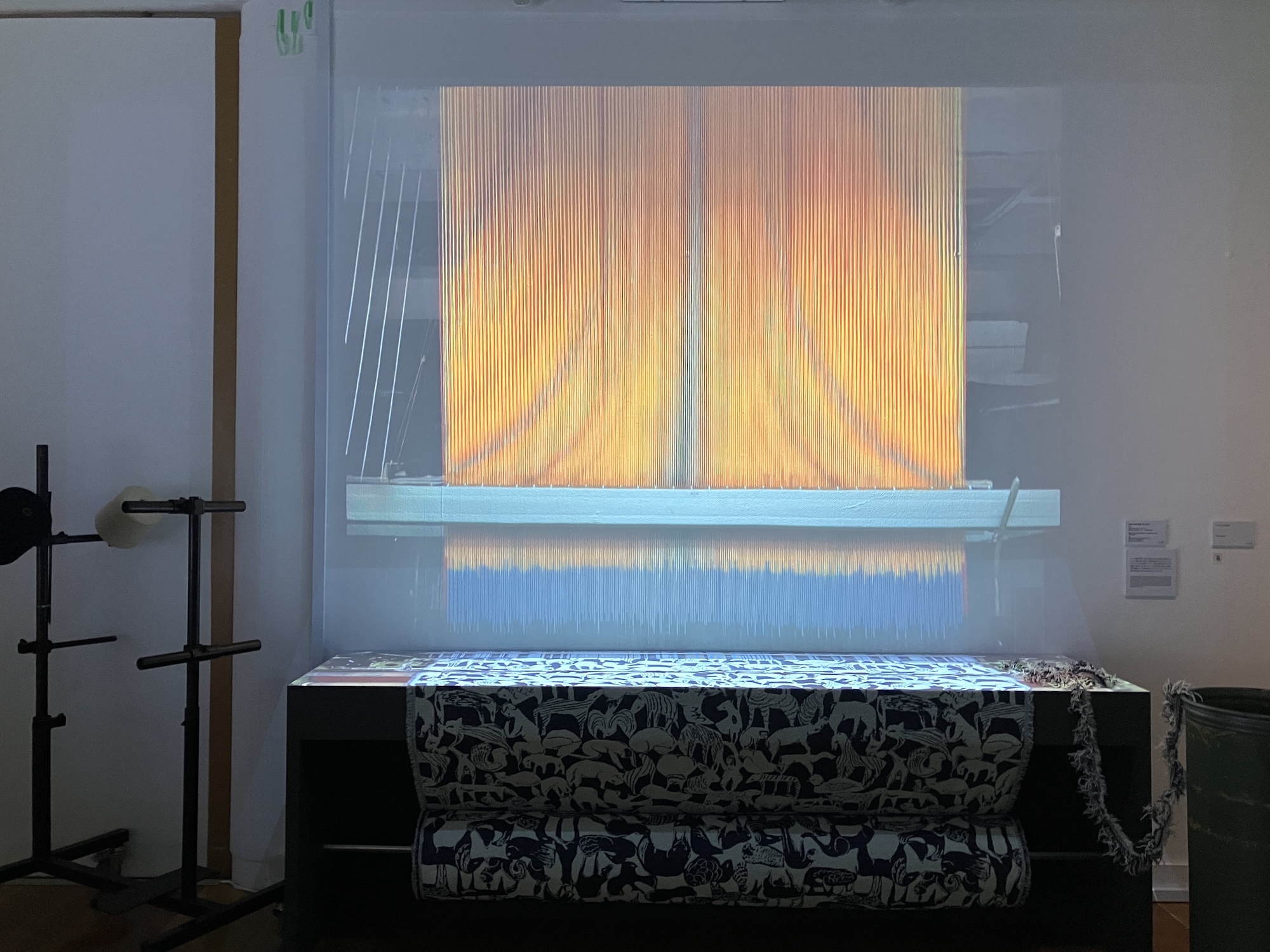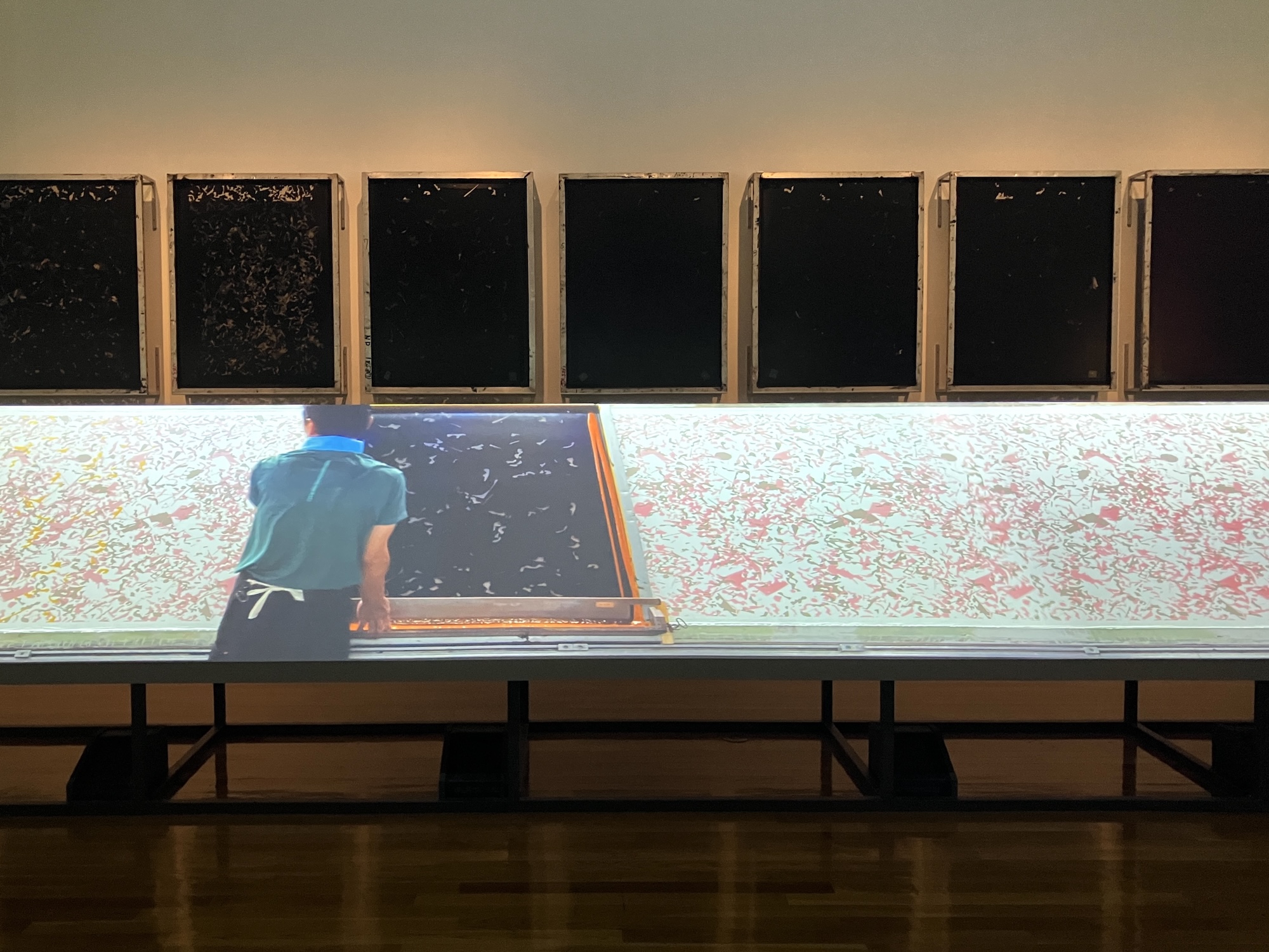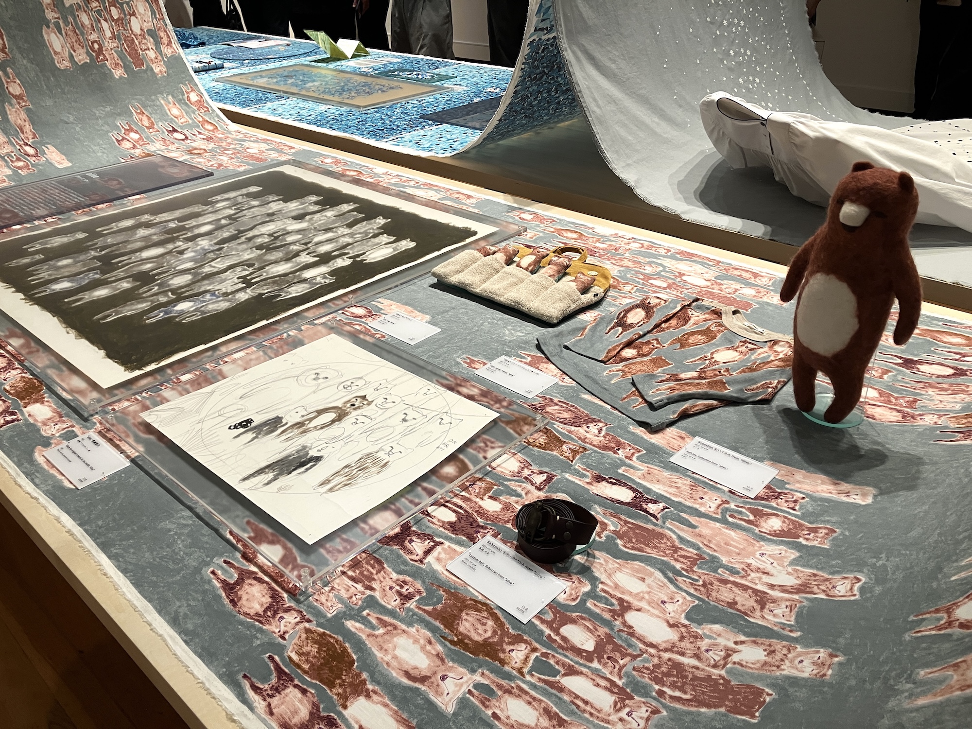 さらに実際に使われたプリント用のスクリーン版の前に設置された映像では、横長の生地に職人が実際にプリントしていく様子を目の前で見ているような体験ができる。このほか実物大のジャガード織り機の動きを再現した映像や、60時間以上かかるという刺繍が生地に施されていく様を巨大スクリーンで映した映像など、臨場感のある演出でミナ ペルホネンの製造現場を垣間見ることができる。