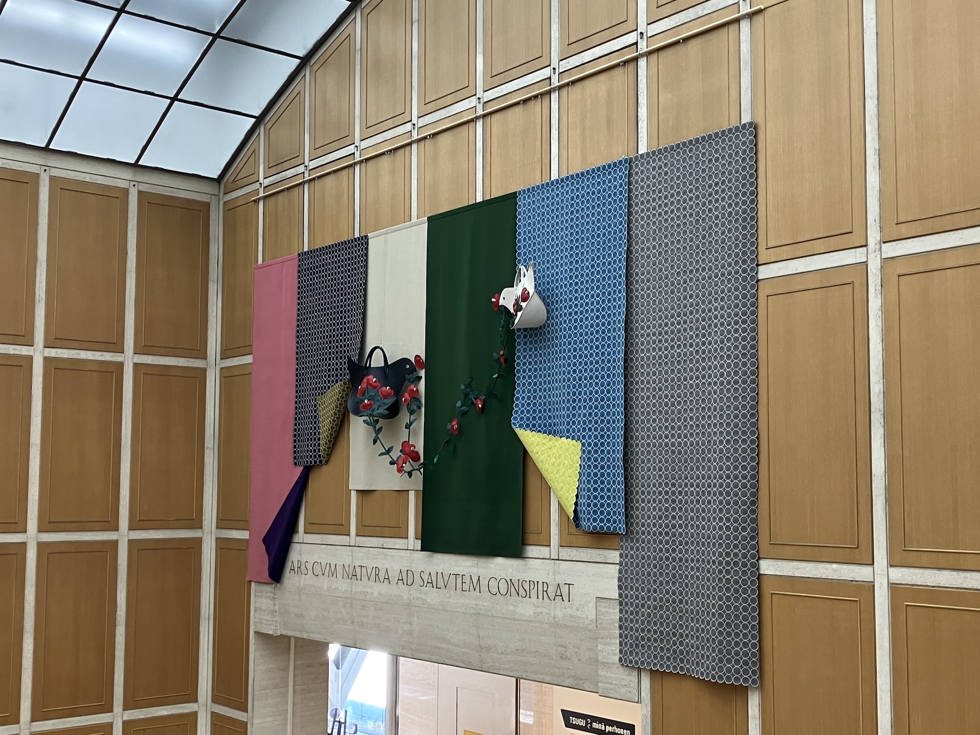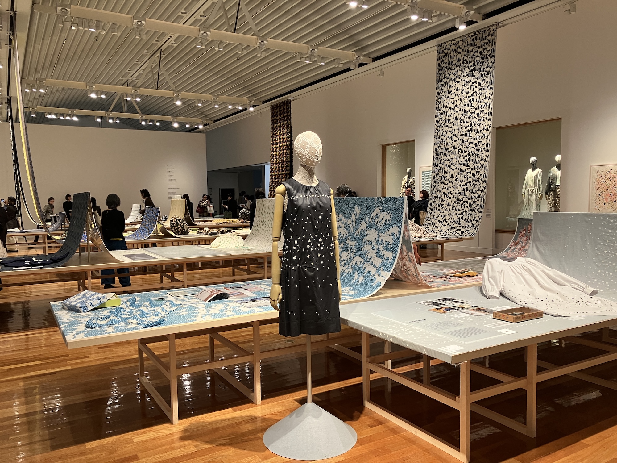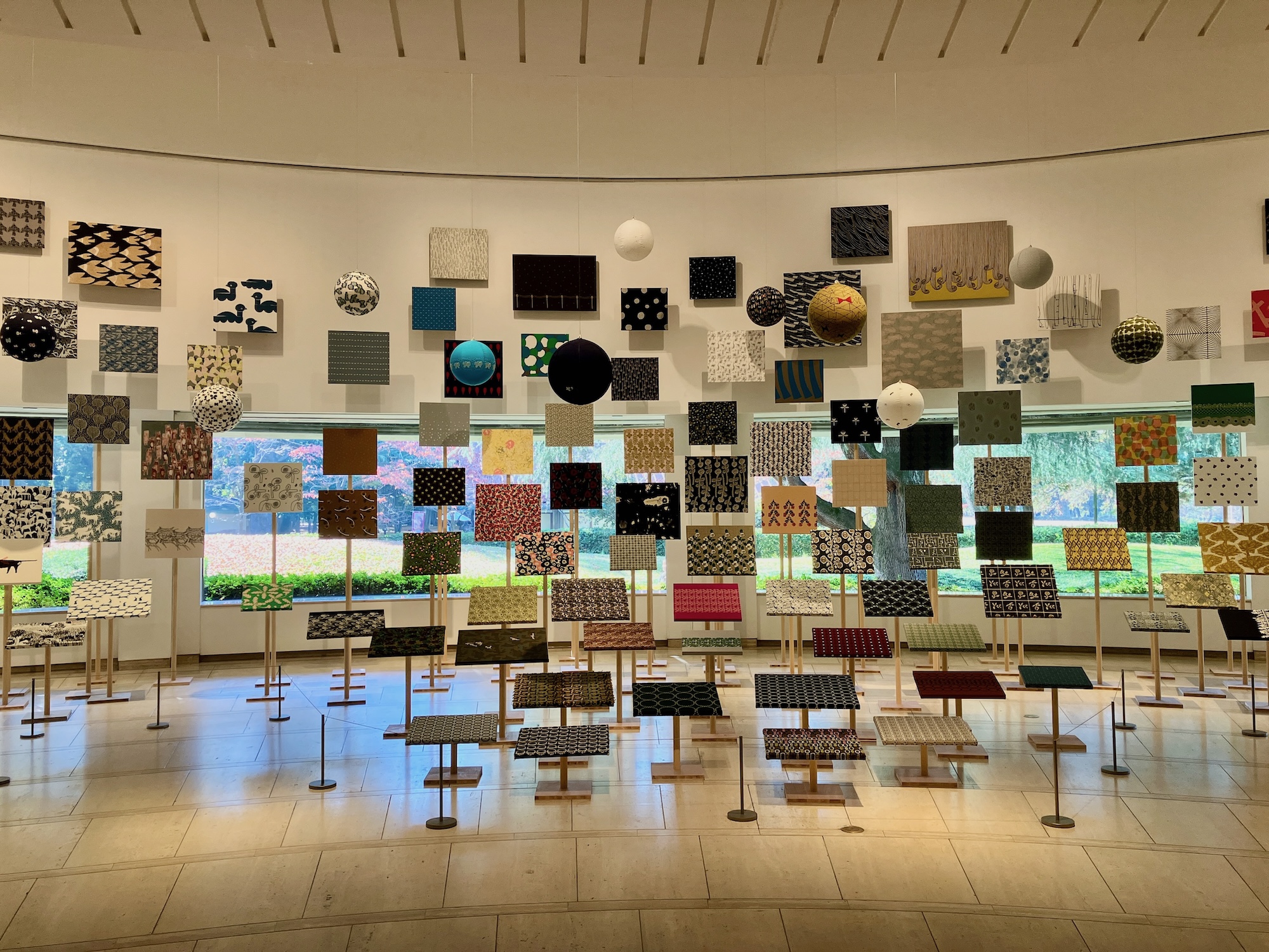 最初の「chorus」で目に飛び込んでくるのは、美術館の扇形展示室にずらりと並ぶ多様なテキスタイルだ。ガラス窓から見える砧公園の緑とミナ ペルホネンの柔らかで有機的なデザインが調和した空間が、来場者を迎える。
