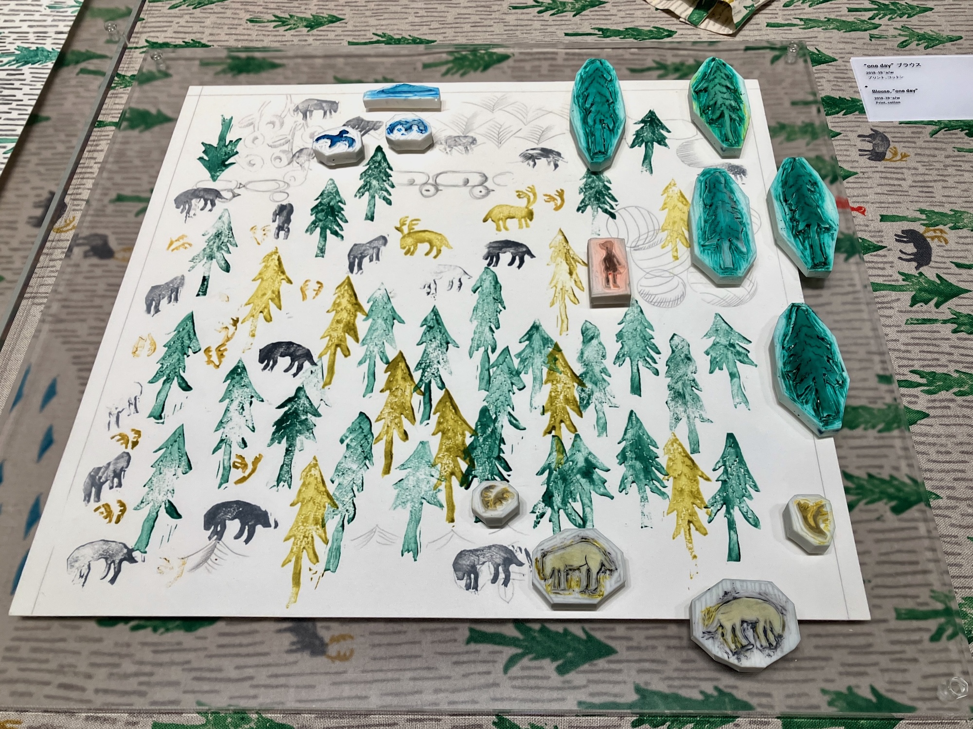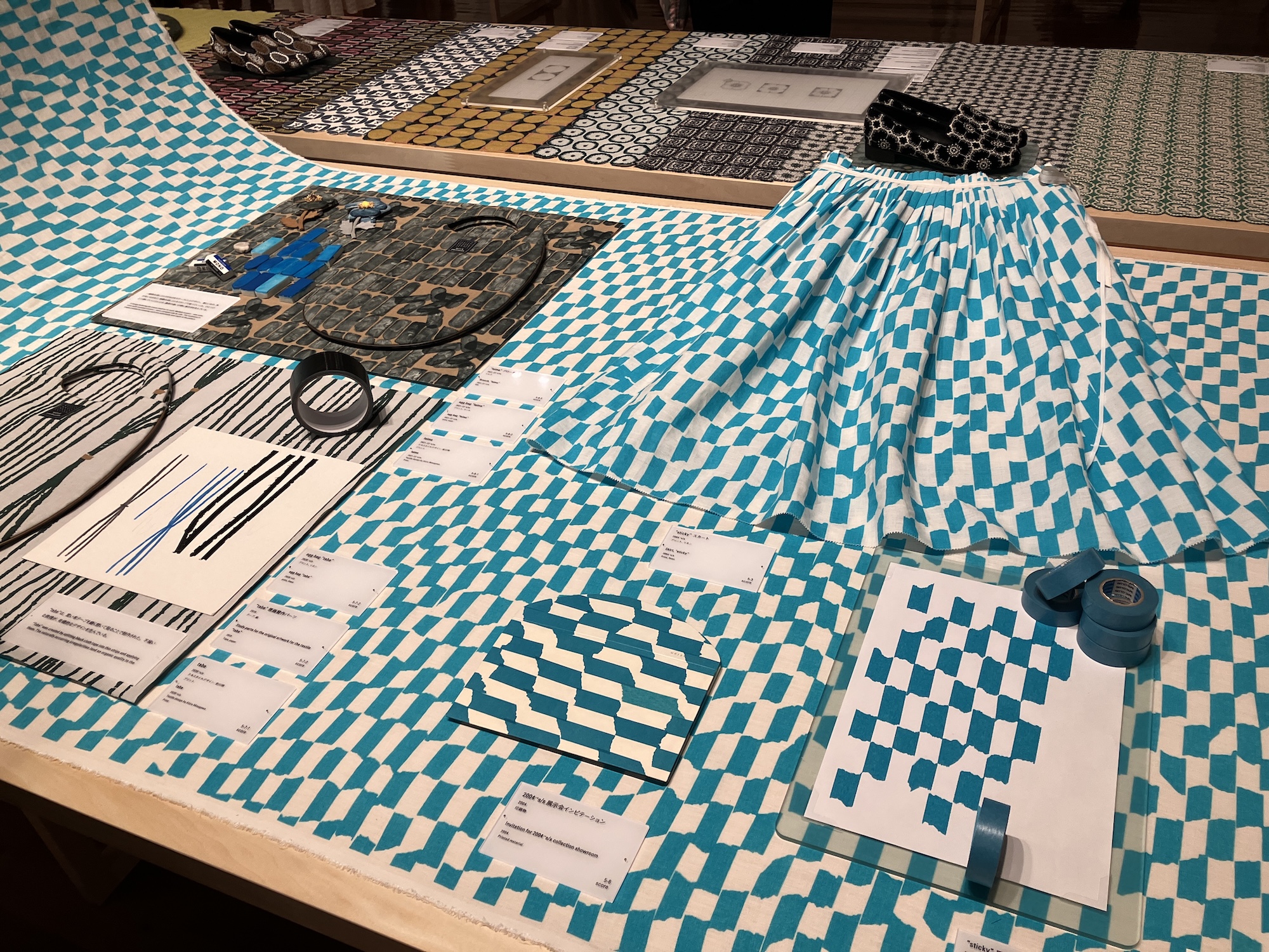 2018-19 A/Wの「one day」では、森の木々や動物たちを手製の消しゴムハンコで表現。不定形な青い矩形が並ぶ「sticky」は、青いマスキングテープを手でちぎって格子状に紙に貼った原画から生まれた。原画とテキスタイル、そして実際のプロダクトを一つひとつ見ていくと、身近な素材を使った手作業から、独特の温もりを持つテキスタイルが生まれていく過程に心が動かされる。