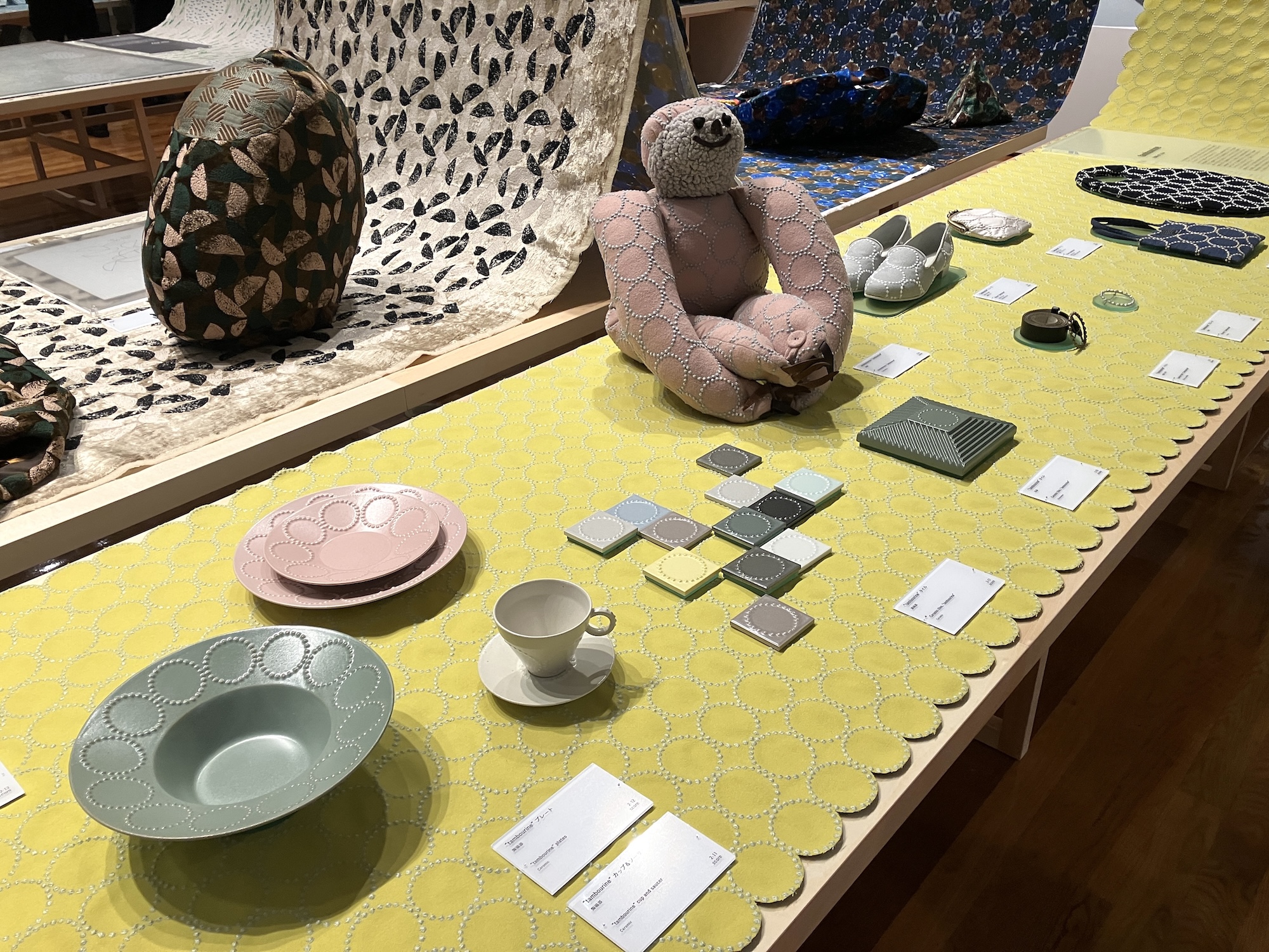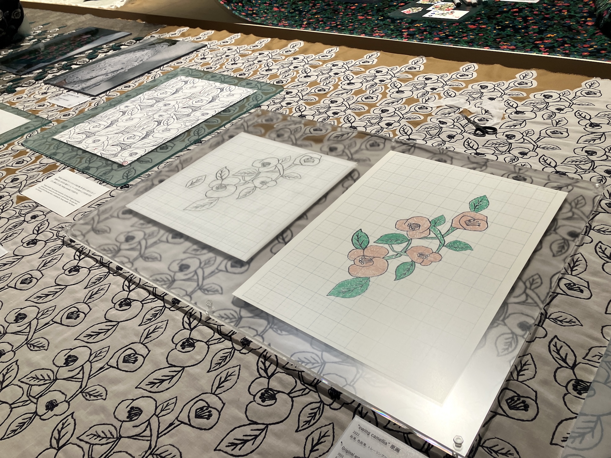 21の柄にフォーカスし、デザイナーの構想とスケッチから試作を繰り返して生産へとたどり着き、さらに洋服やファッションアイテムに変化していく過程を、原画やデザインに使われた道具、実物の洋服やプロダクトなどを通して見ることができる。一つひとつのデザインに宿るストーリーやこだわり、その発展を存分に感じられるエリアだ。
