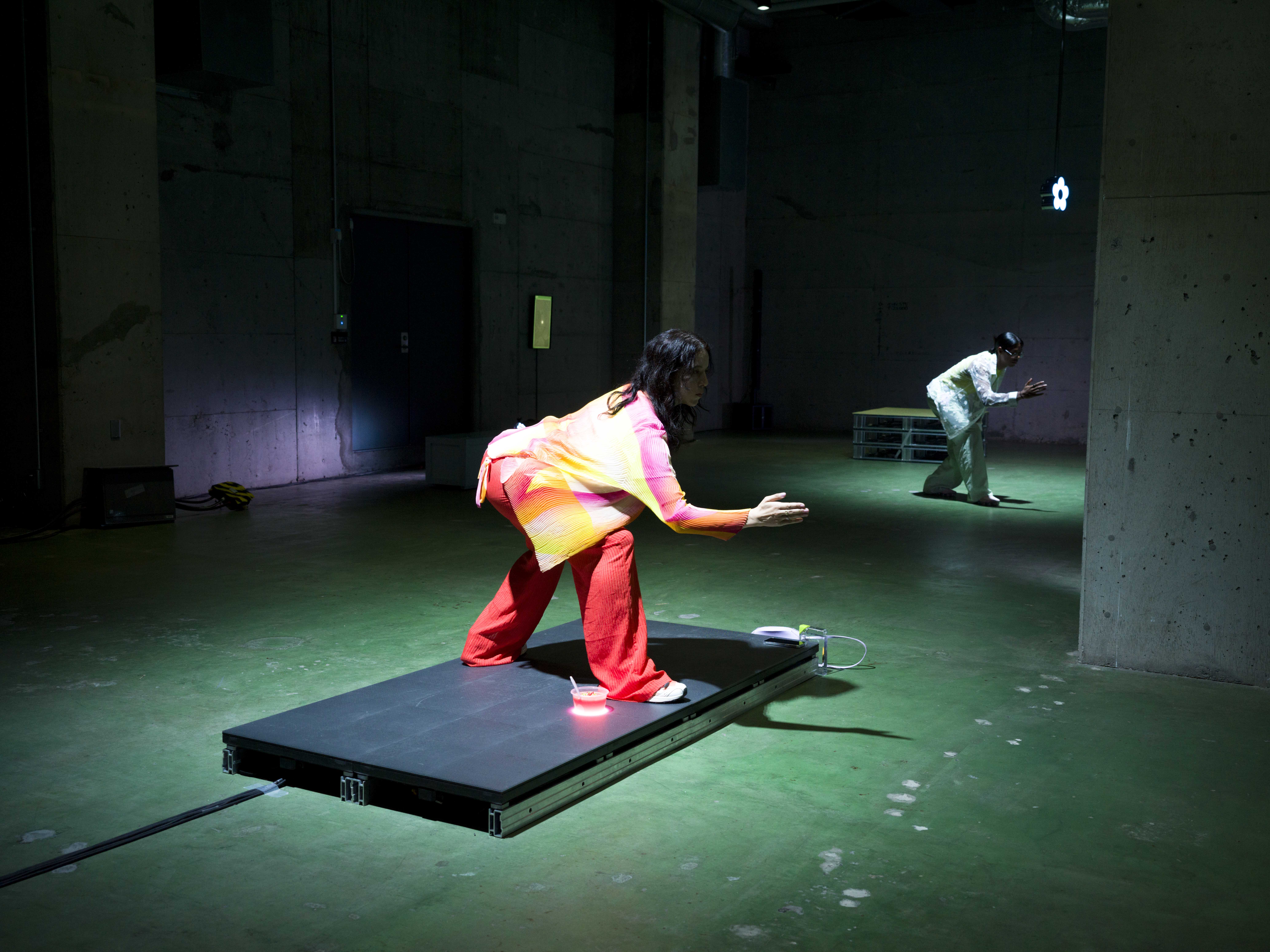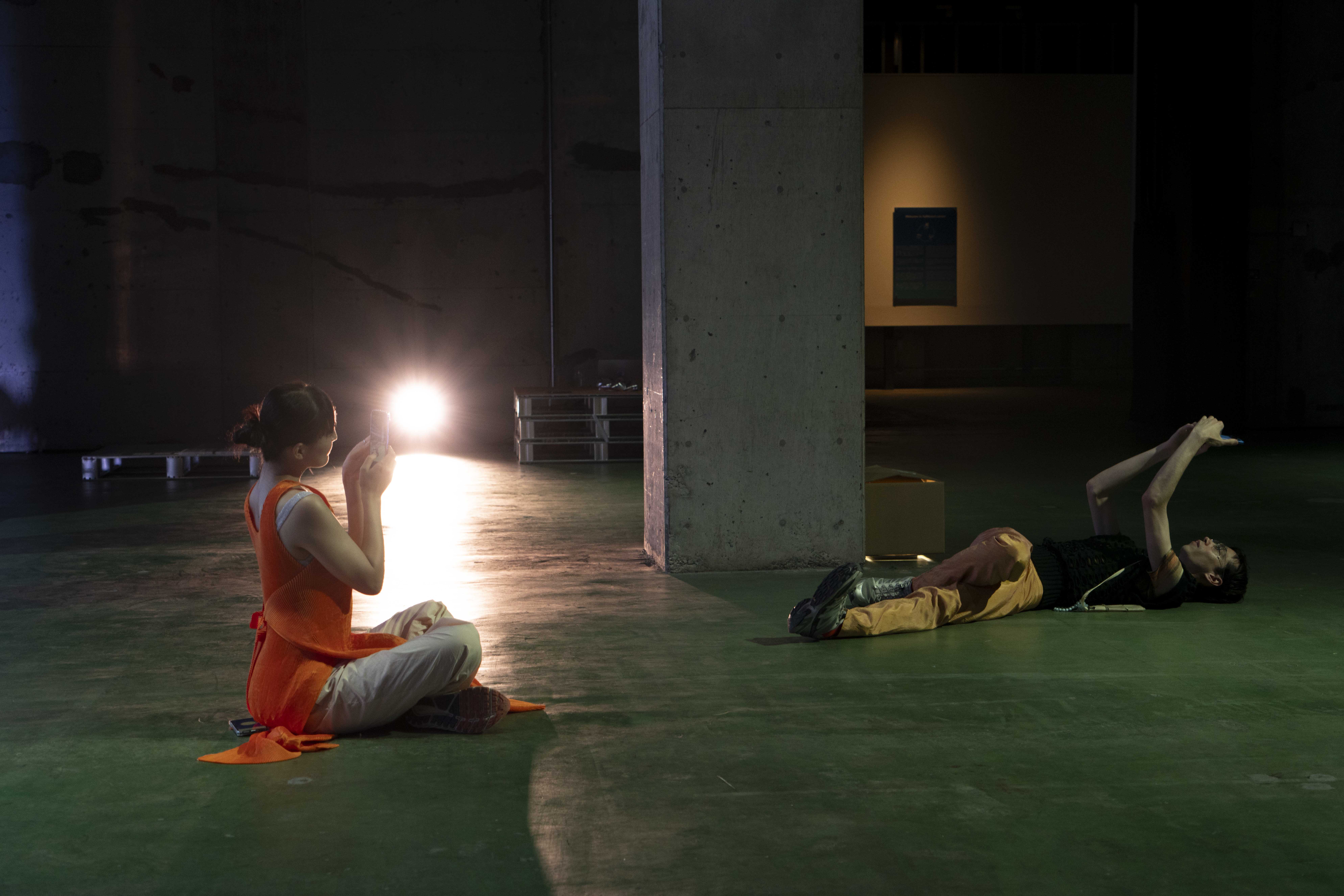 そこでパフォーマーは、あたかも、そこにたまたま置かれた箱と同じようなあり方で、流通過程の空間の中に佇んでいる。流通過程のロジスティックスに適合的な軽さにおいて存在している。光、音響、映像の流れが作るアーティフィシャルな雰囲気に包み込まれたパフォーマーの身体は、互いに関係なさそうでいて、ときに携帯のカメラでその様子を撮影したりもする。彼らは放って置かれているわけではなく、そこに散らばるモノたちと同じようにして生きた感じを放出している。「モノは生命に不可欠だ」という文章が会場内のモニターに映し出されていたが、それは所有とはまた別のあり方で、モノと人間の身体が相互に連関し合う状況のなかで発生する、生きた感じを指し示している。