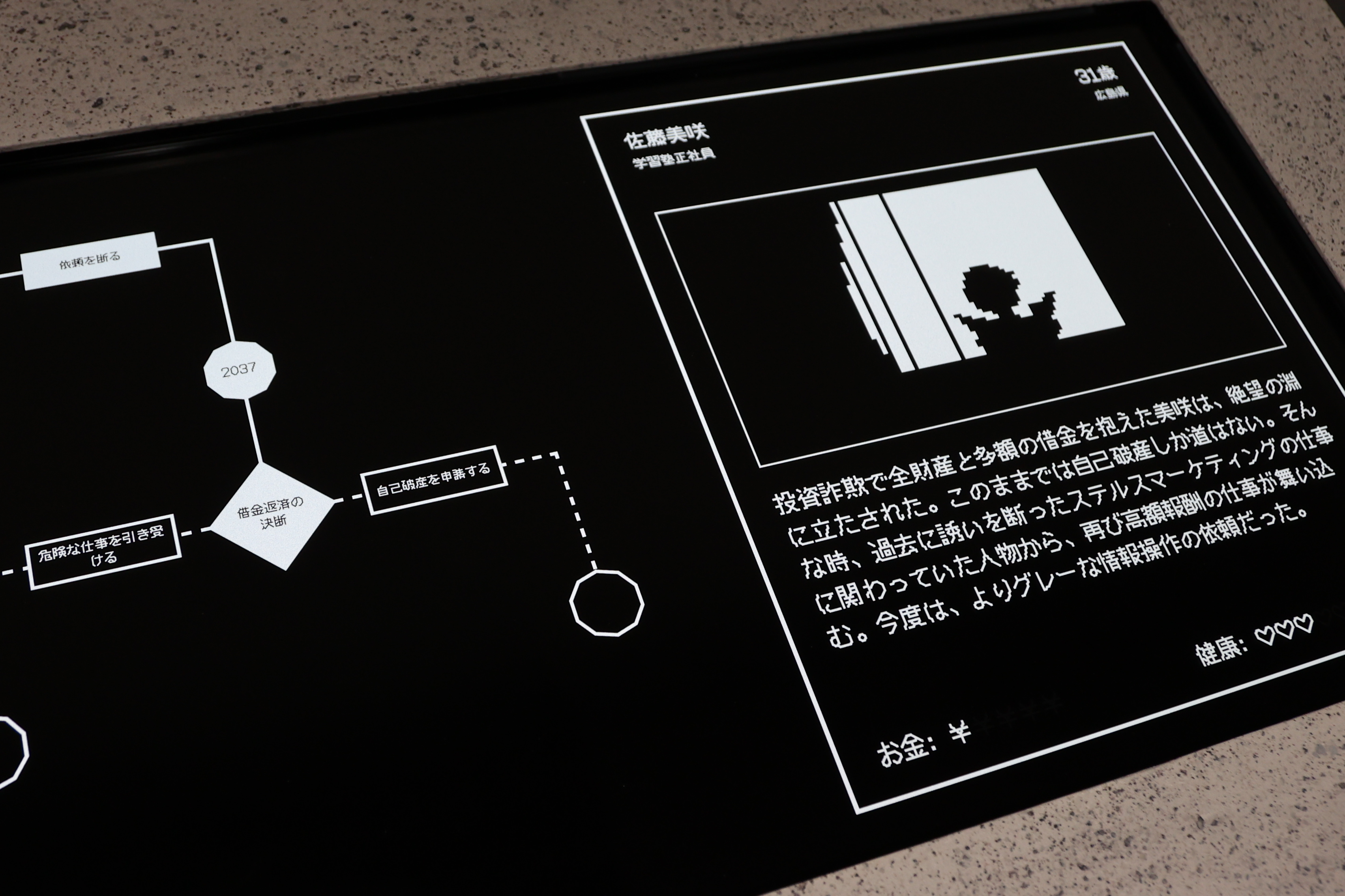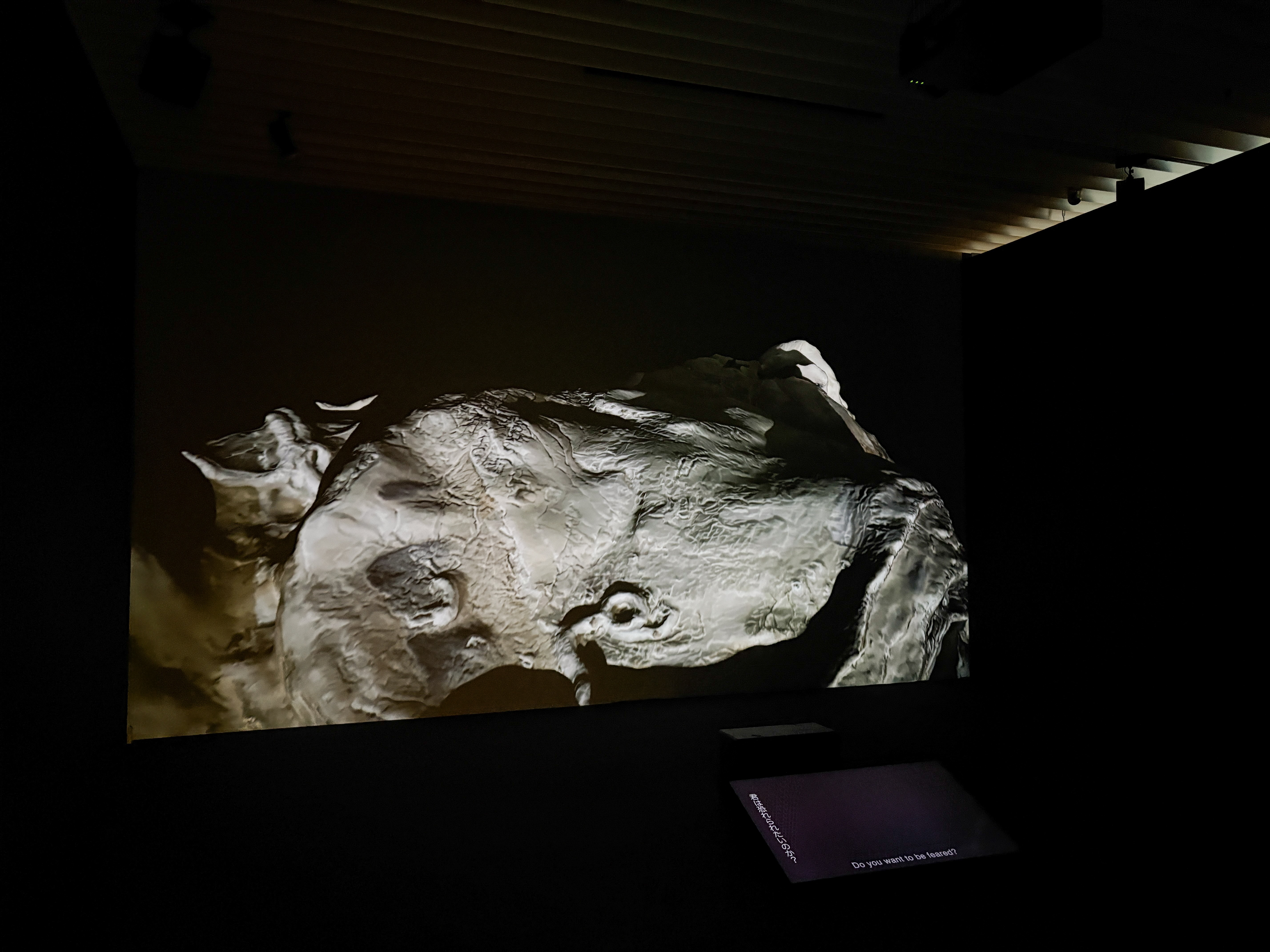 展覧会は、マヤ・ワタナベの永久凍土に現れたマンモスの死骸を映し出す映像インスタレーションと、木原共のAIを用いた人生ゲームによって幕を閉じる。古代と現代、ふたつの時代における生命の不可逆性を、ひとつの風景として立ち上げる両作品は、他者へと想いをはせることの重要性をまったく異なる角度から感じさせる。