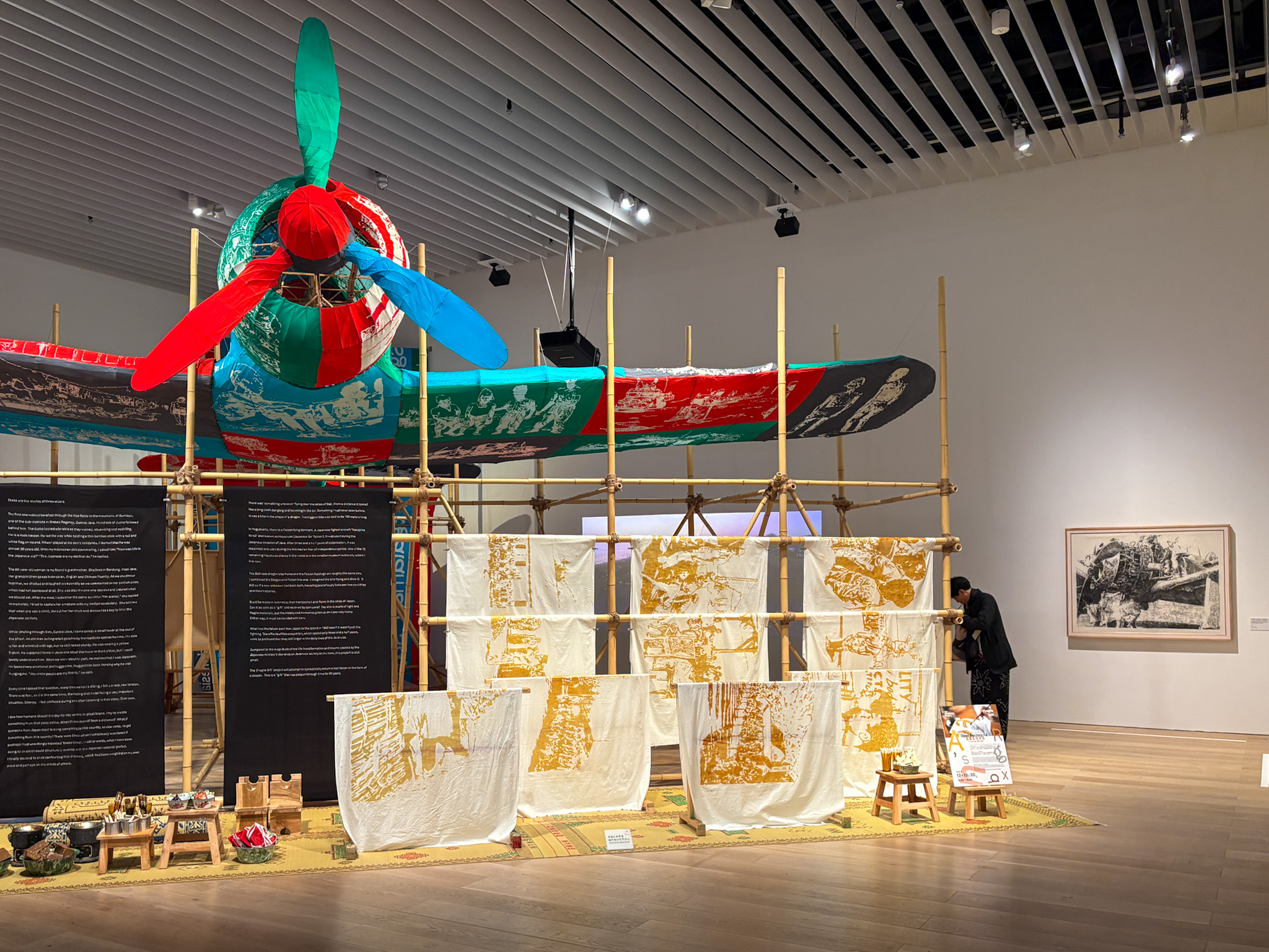 ジャカルタを拠点に、国内外の人びとと多様な実践を展開する北澤潤は、2021年から続く長期プロジェクト《フラジャイル・ギフト》を発表。同プロジェクトは日本軍による侵攻の際に使用され、後のインドネシア独立戦争ではインドネシア軍によって再利用された戦闘機「隼(はやぶさ)」との出会いをきっかけに始動した。竹や手染めの布などの壊れやすい素材でできた実寸大の凧には、当時の記録写真や証言などが織り込まれている。