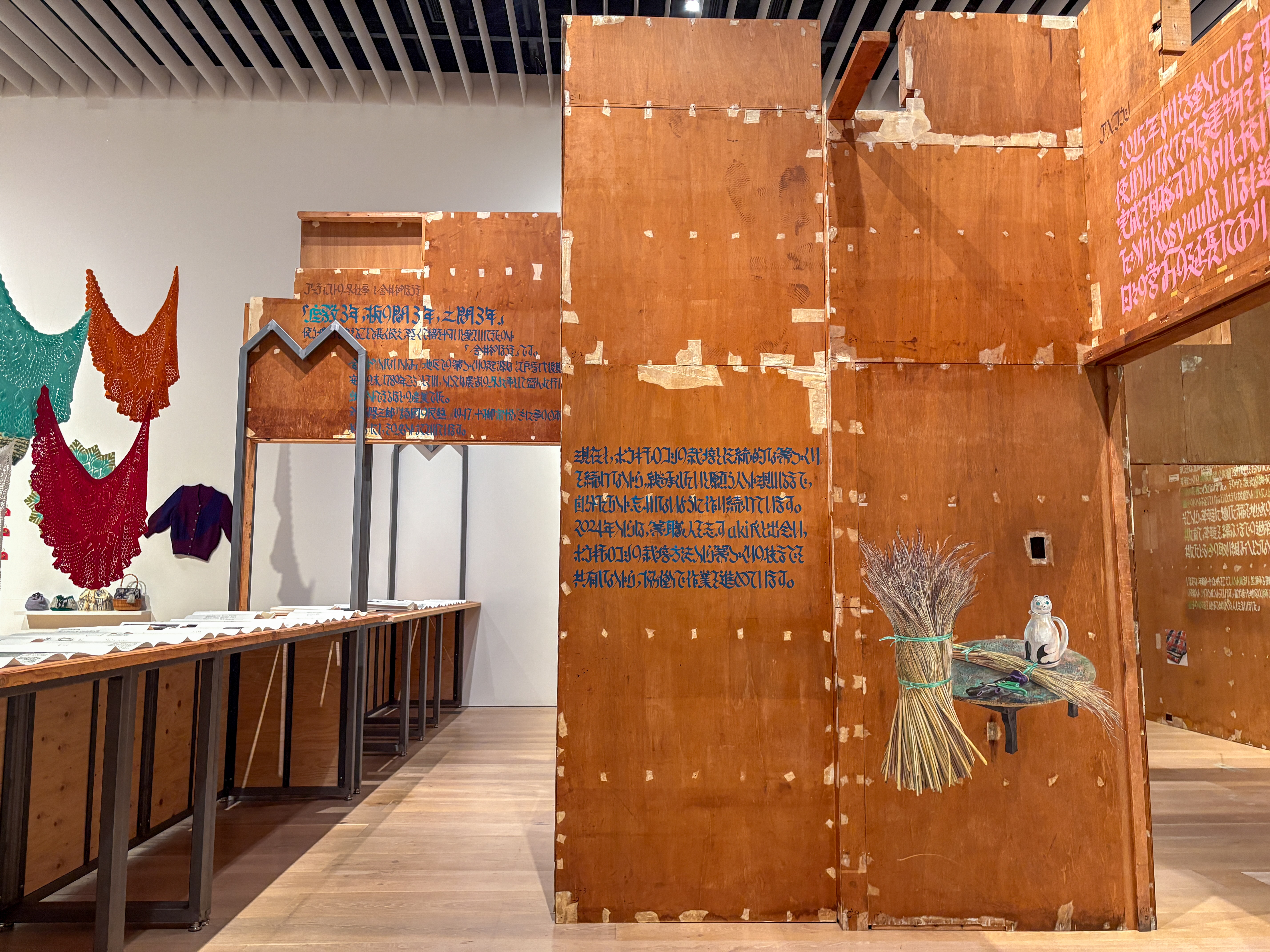 山形県長井市で活動するアーティスト・コレクティヴのアメフラシは、制作の拠点である「こしゃう(山形の方言で『つくる』の意)」の木材や構造体を再利用したインスタレーションを発表。地域の伝統工芸を継承する草鞋(わらじ)や箒(ほうき)に関連する取り組みは、作家がその場所特有の時間へと長年向き合うことによって実現したものだ。