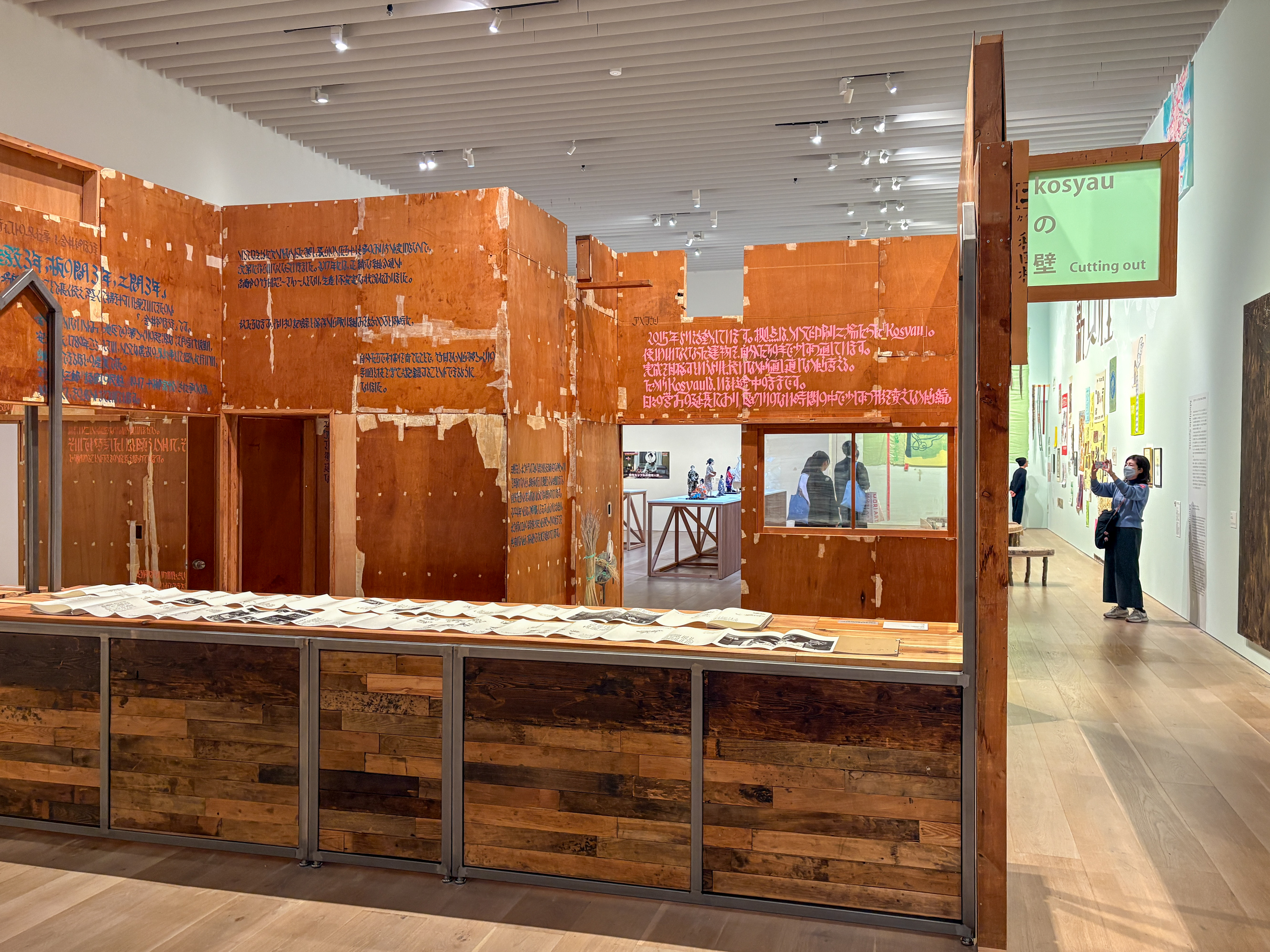 ここからは、移民や離散をテーマとした作品が続く。キャリー・ヤマオカの《群島(2019年)》は、両親が収容されていた強制収容所の悲惨な歴史を題材にした作品。つづく金仁淑の《Eye to Eye: Side E》は、滋賀県のサンタナ学園(ブラジルから移住した人びとの子供が通う学校)でのリサーチを経て制作した映像インスタレーションだ。