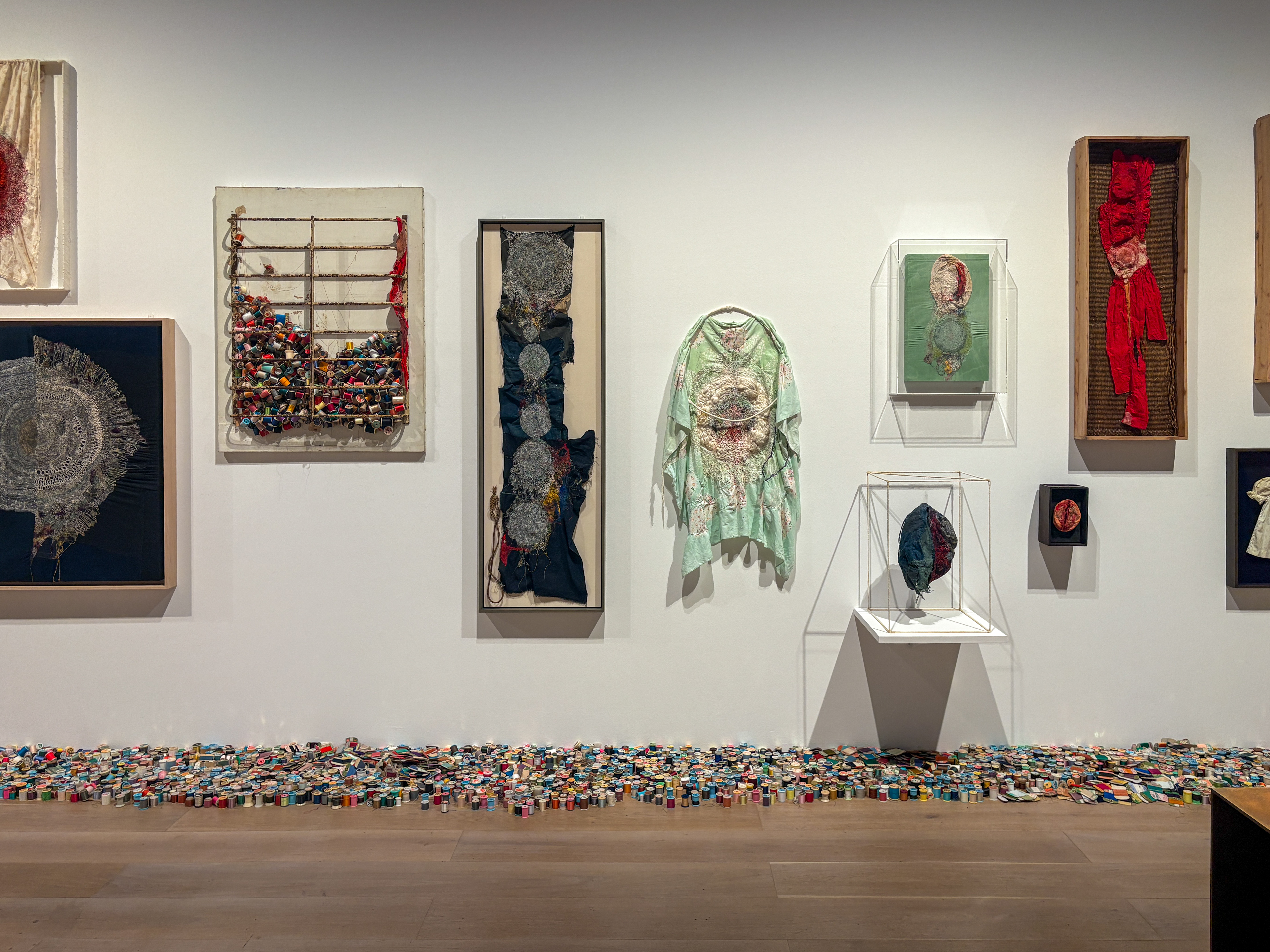 展示室に入ってすぐ右側の壁に配されているのは、裁縫が得意だった祖母と母が残した古布や道具、骨董市などで出合った衣類を用いて刺繍を行ってきた沖純子の作品。抽象的でありながら瑞々しい生命感にあふれる立体造形は、素材に残存する他者の記憶を「縫う」という行為を通じて現出させる、作家独自の表現だ。