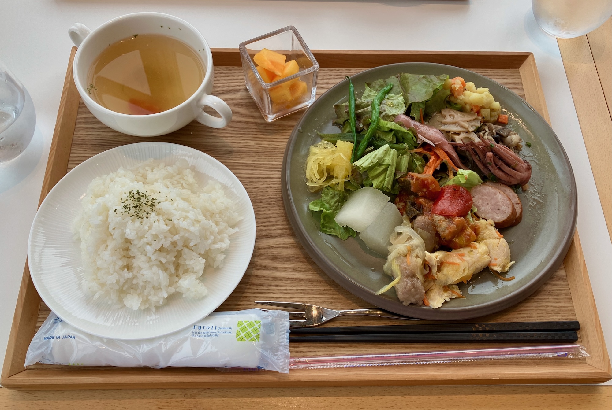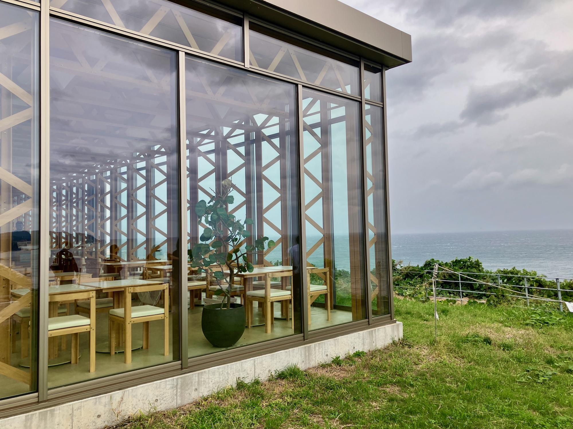到着したのは海沿いに立つ「潮騒レストラン」。「奥能登国際芸術祭」に際して2023年にオープンしたスペースで、全面ガラス張りの窓から外浦の海を一望できる美しい建物は、坂茂が設計を手がけた。震災や豪雨の被害で休業を余儀なくされたが現在は営業を再開している。ここでは地元の食材をたっぷり使ったランチプレートをいただいた。